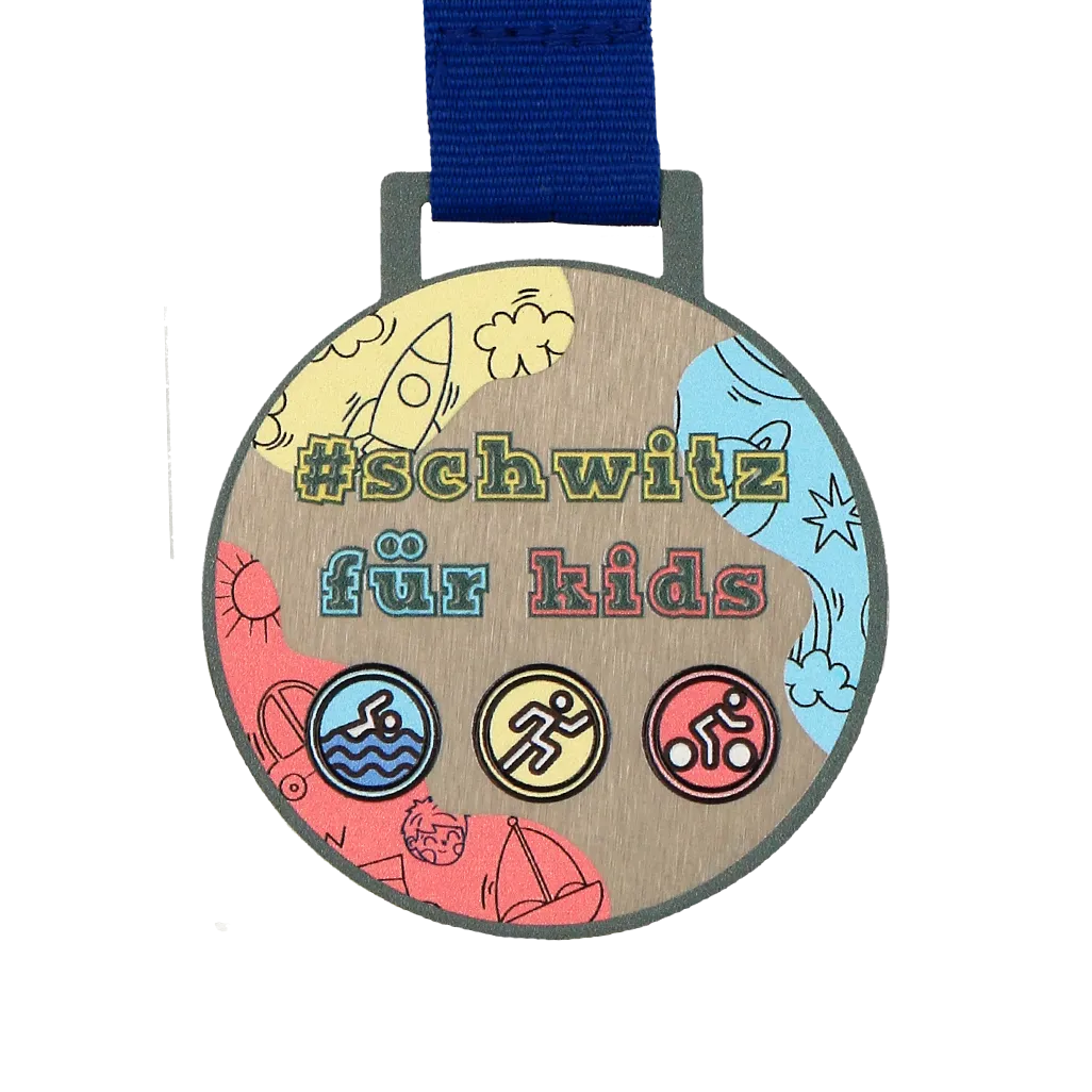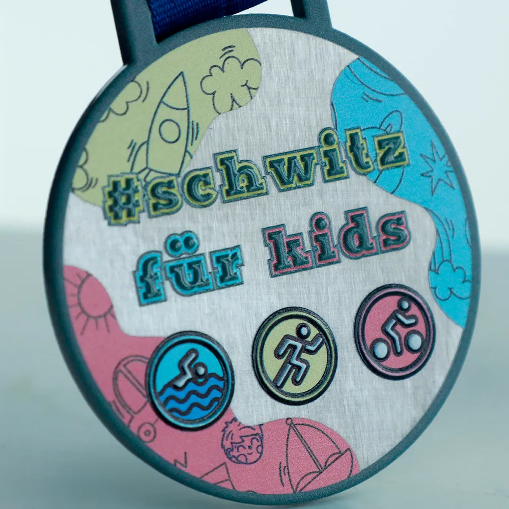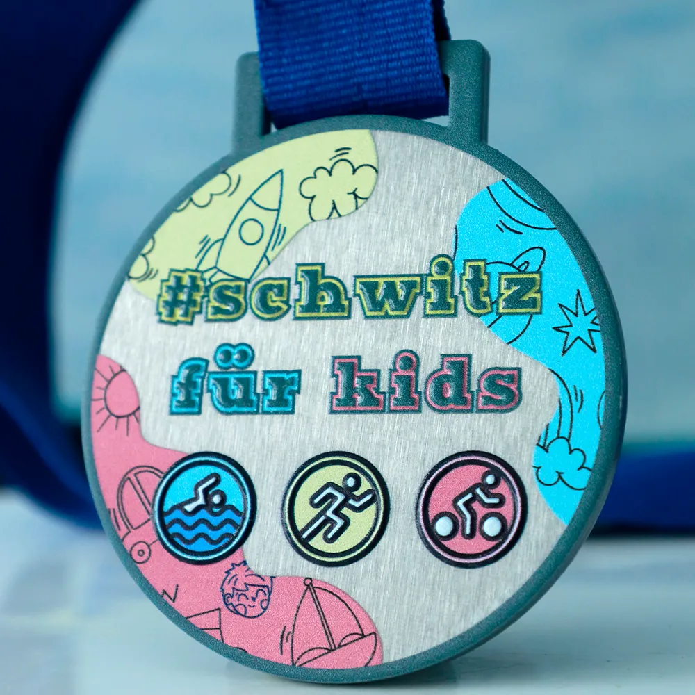 Medaglia per bambini realizzata per l'evento di triathlon Schwitz für Kids. Una medaglia d'argento con stampa UV colorata relativa alle discipline del triathlon.
