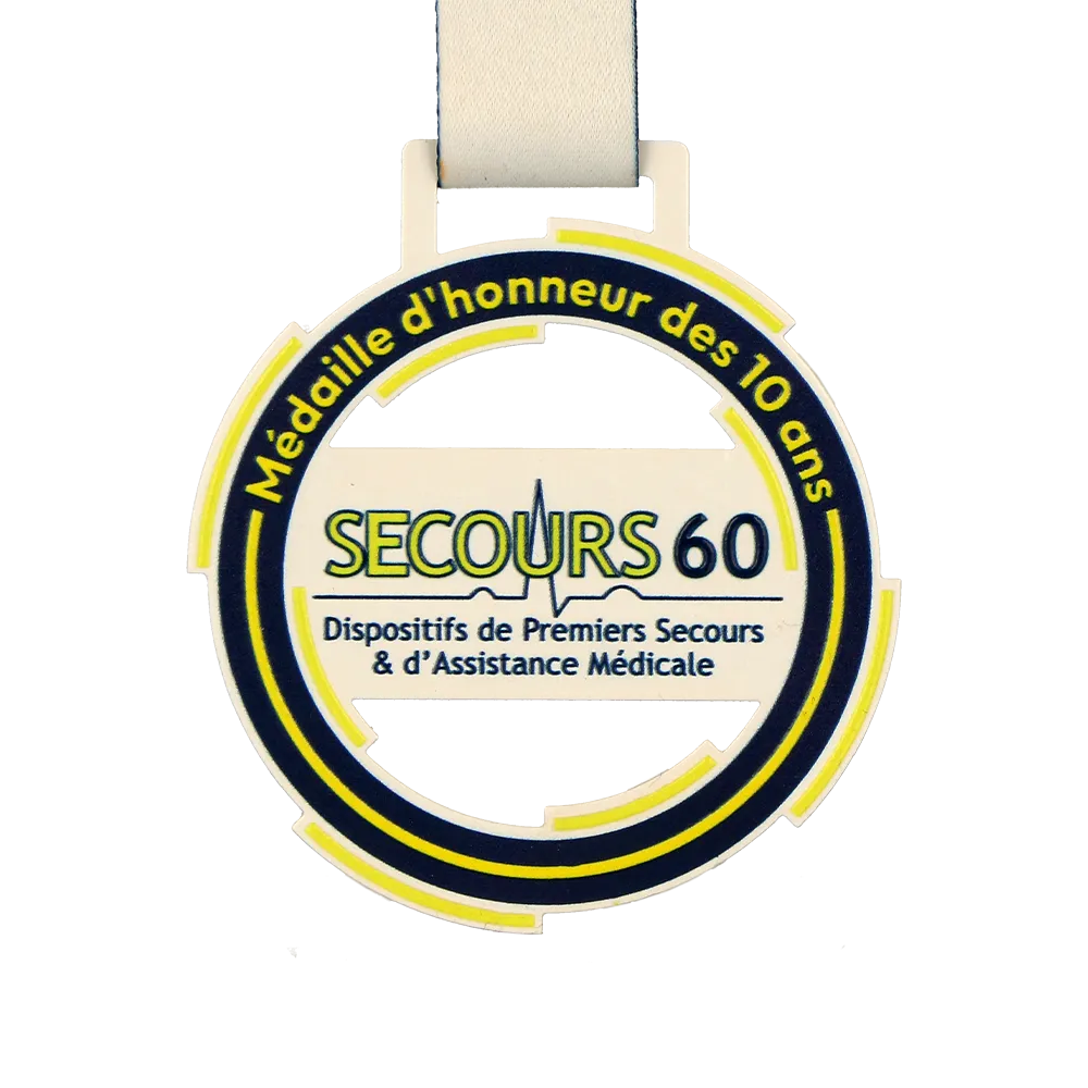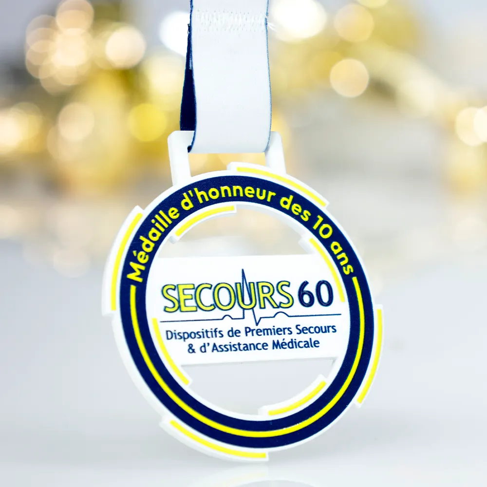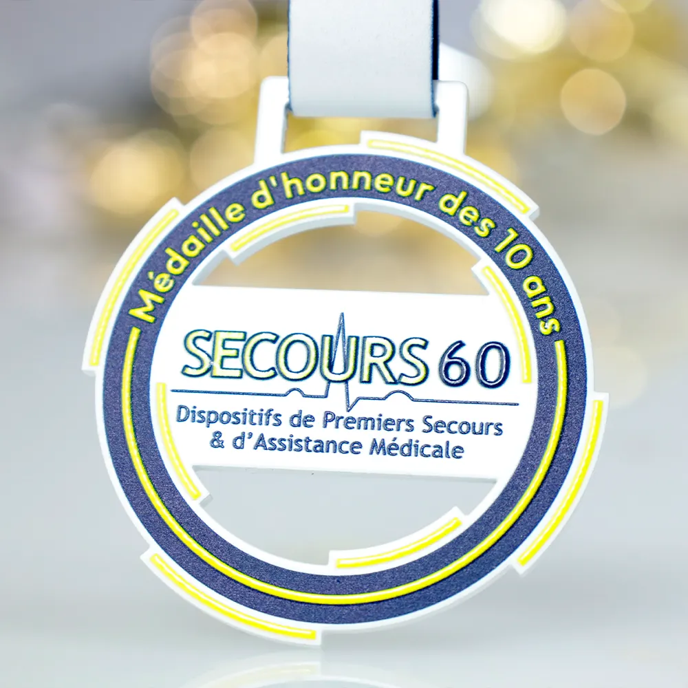 Medaglia personalizzata progettata per l'evento Secours60. La medaglia include un motivo grafico con elementi medici, riflettendo perfettamente il tema dell'evento. Abbiamo utilizzato la stampa UV per aggiungere accenti colorati, garantendo una finitura durevole ed estetica.