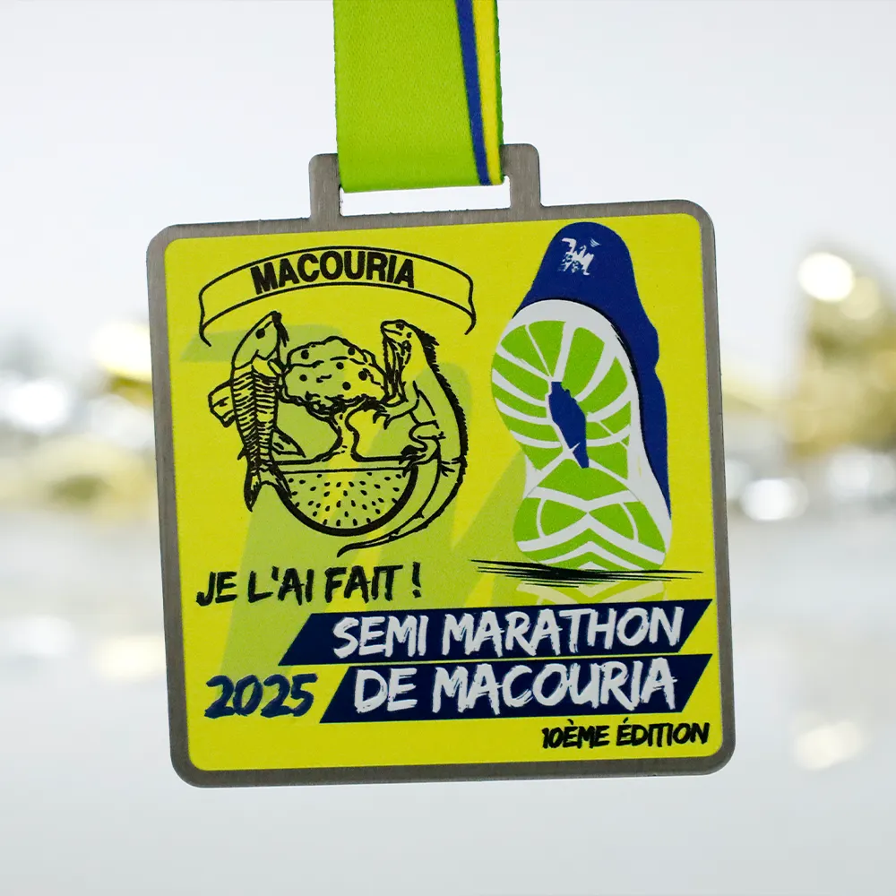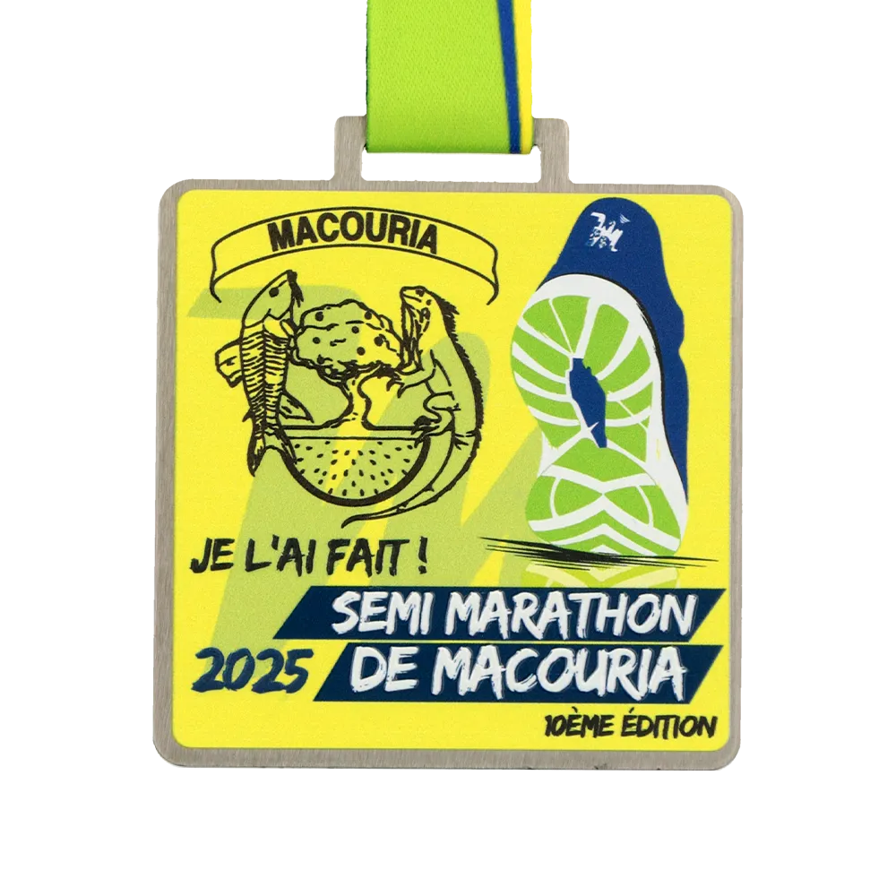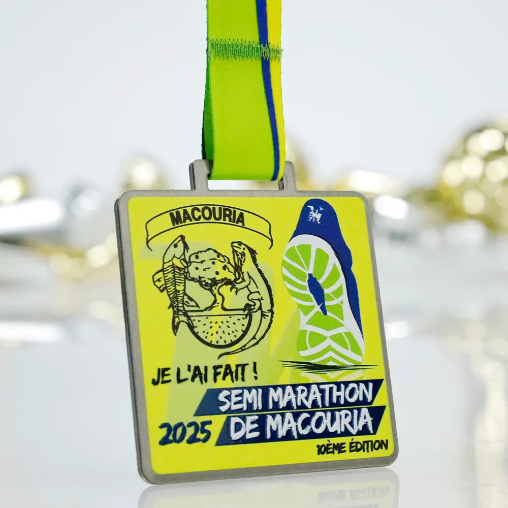 Una medaglia da corsa creata per la 10ª edizione della Semi Marathon de Macouria 2025. Realizzata in acciaio, tagliata al laser e decorata con stampa UV colorata. Il design combina motivi locali con grafiche dinamiche che mostrano simboli tropicali e un'impronta di scarpa da corridore. L'intero pezzo presenta uno schema di colori energico di giallo, verde e blu marino.