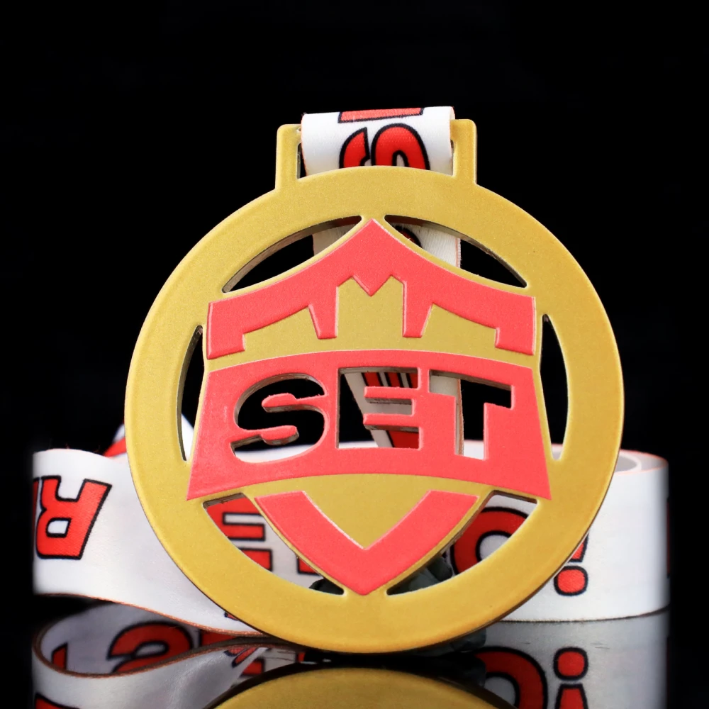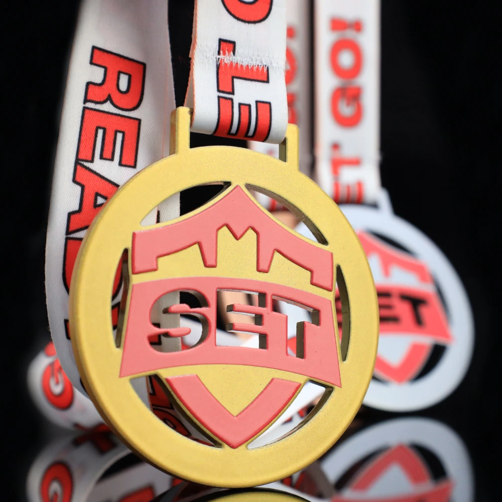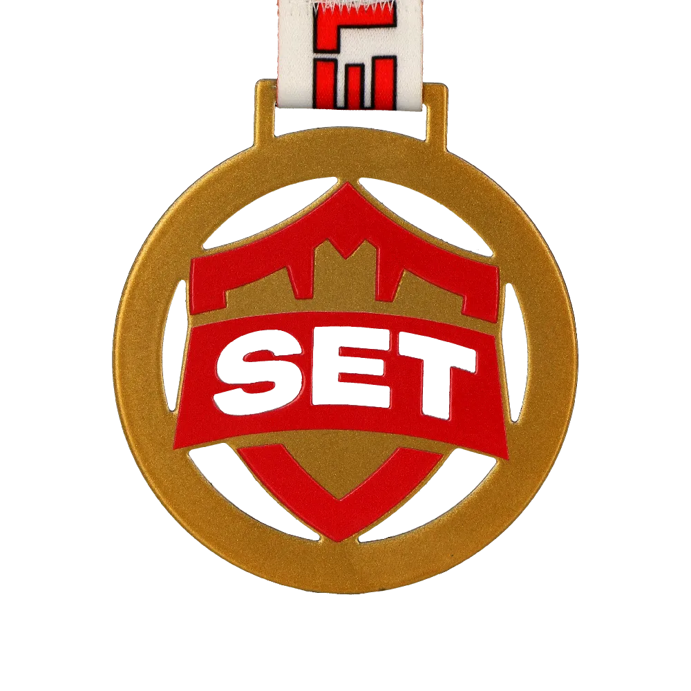 La nostra offerta è piena di realizzazioni moderne. Una di queste sono le medaglie da corsa che abbiamo preparato per la SET X Run. Nel creare questo progetto insieme al cliente abbiamo deciso per medaglie in acciaio stampato in tre versioni di colore classiche: oro argento e bronzo. Hanno tutte una forma rotonda con una varietà di ritagli all’interno. Il tutto è completato da una stampa colorata che si riferisce al tema dell’evento e sormontata da un nastro a sublimazione abbinato al design moderno della medaglia.