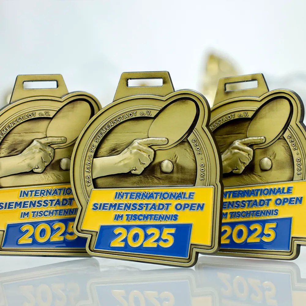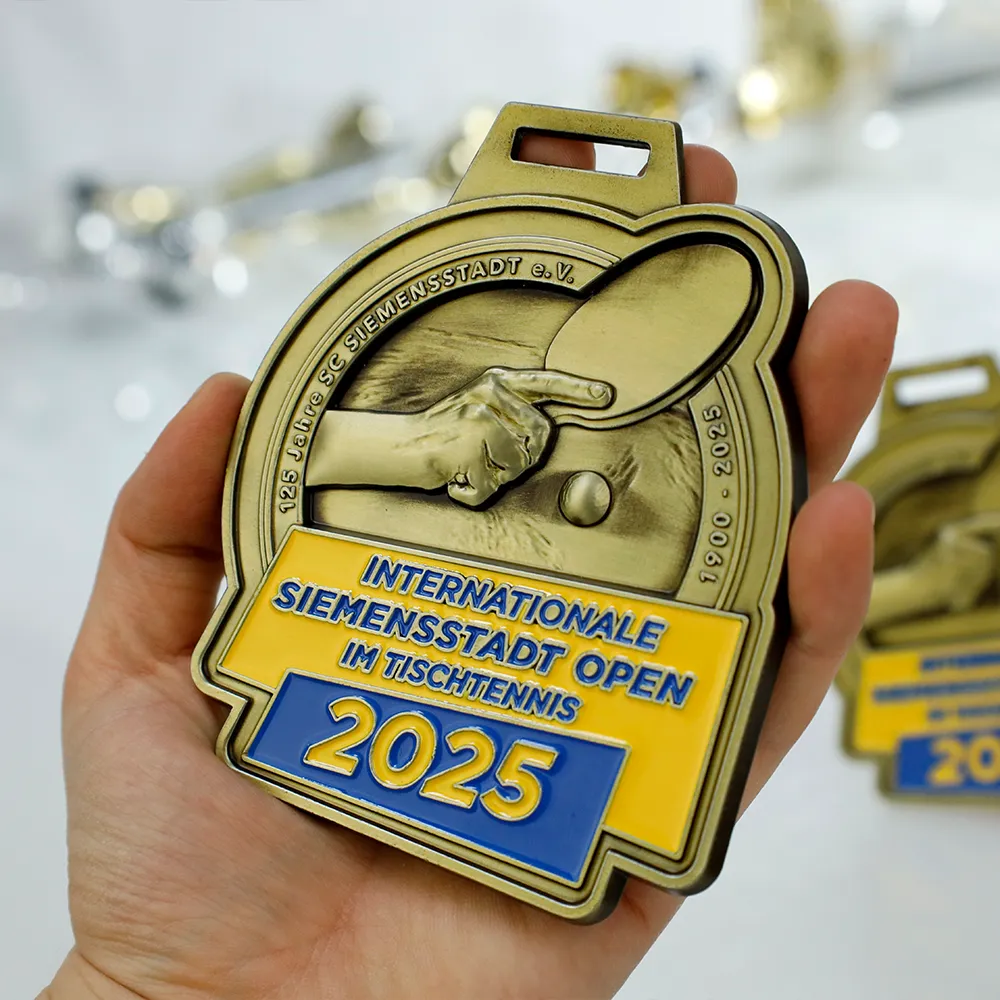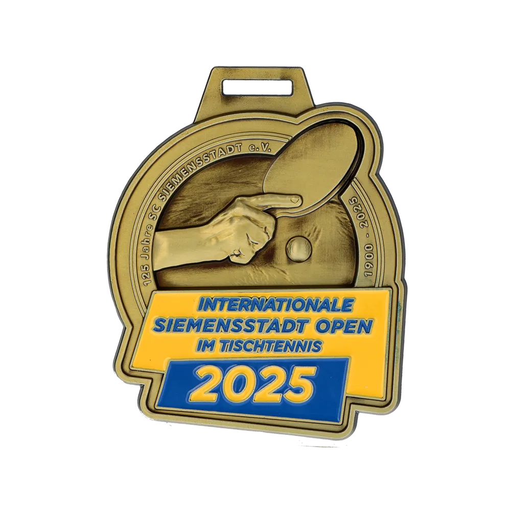 Medaglia su misura progettata per il torneo di ping pong "Internationale Siemensstadt Open 2025". La medaglia pressofusa 3D, rifinita in un colore oro antico con vivace smalto blu e giallo, presenta un rilievo sul dritto che raffigura una mano che tiene una racchetta da ping pong e una pallina.