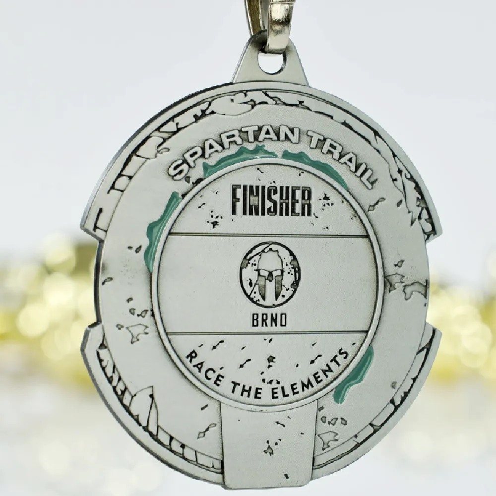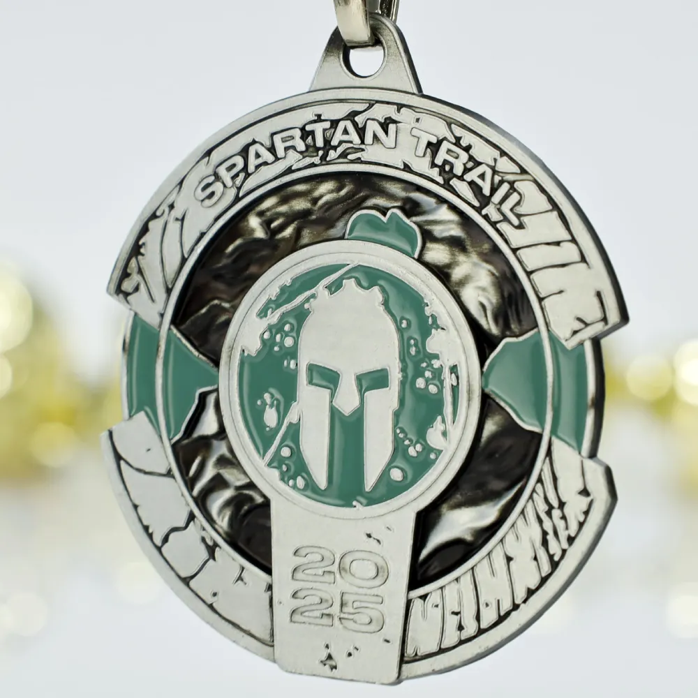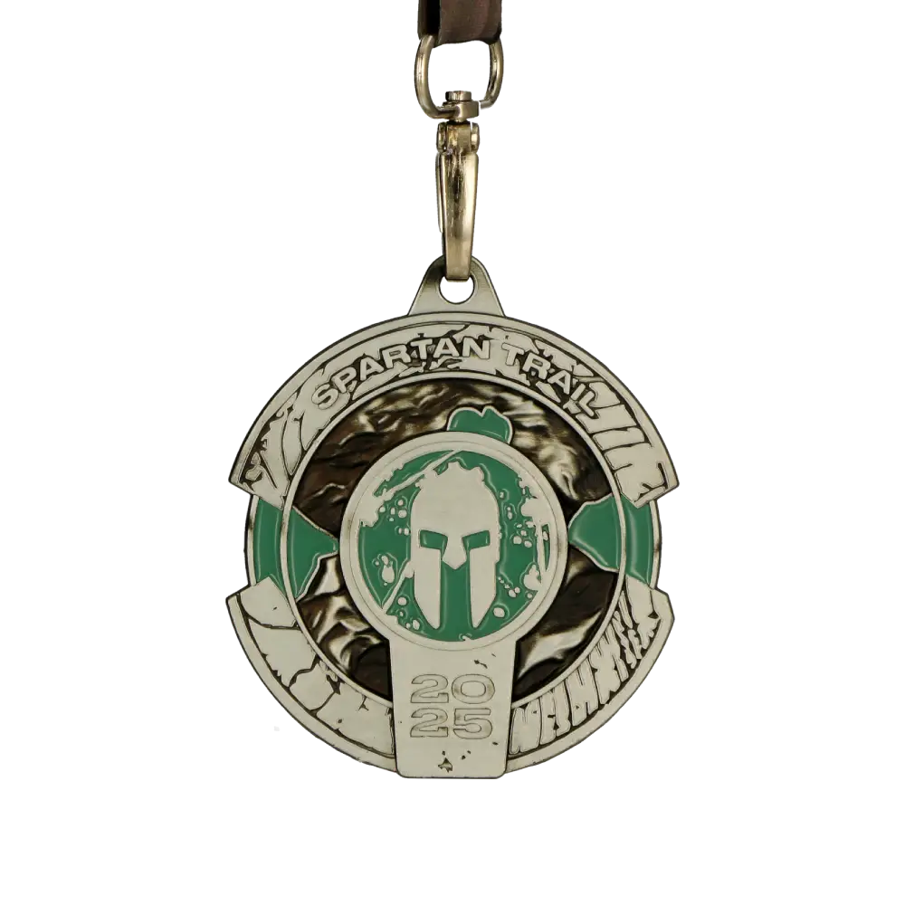Medaglie sportive su misura create per Spartan Trail 2025. Medaglie d'argento con accenti verdi e un distintivo elmo spartano al centro. Elementi in rilievo evidenziano il motivo del terreno accidentato, con il nome dell'evento e l'anno 2025 chiaramente contrassegnati. Le medaglie su misura sono sospese a un nastro scuro con un moschettone in metallo.