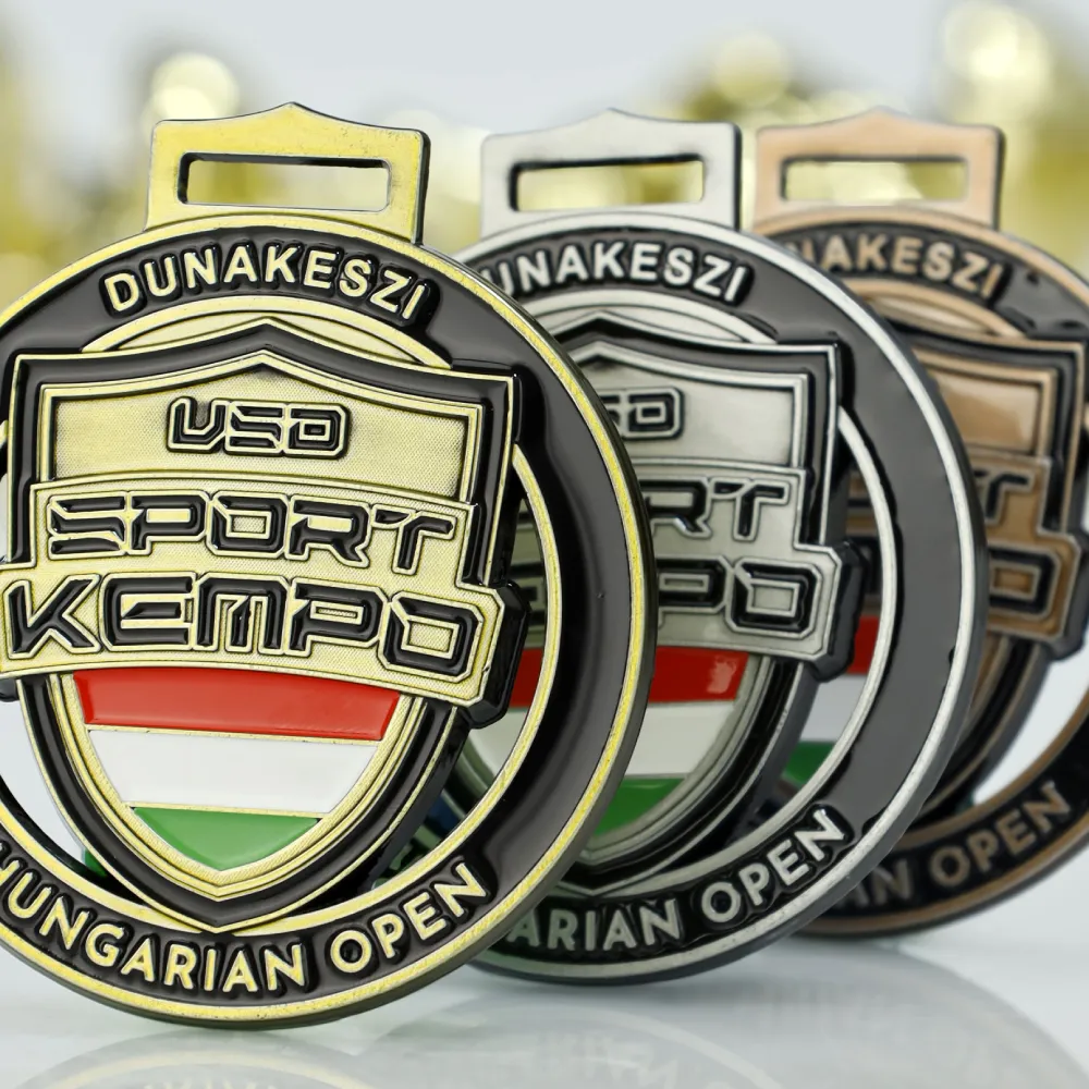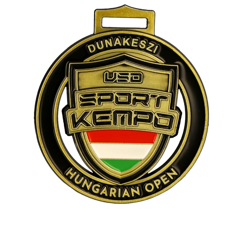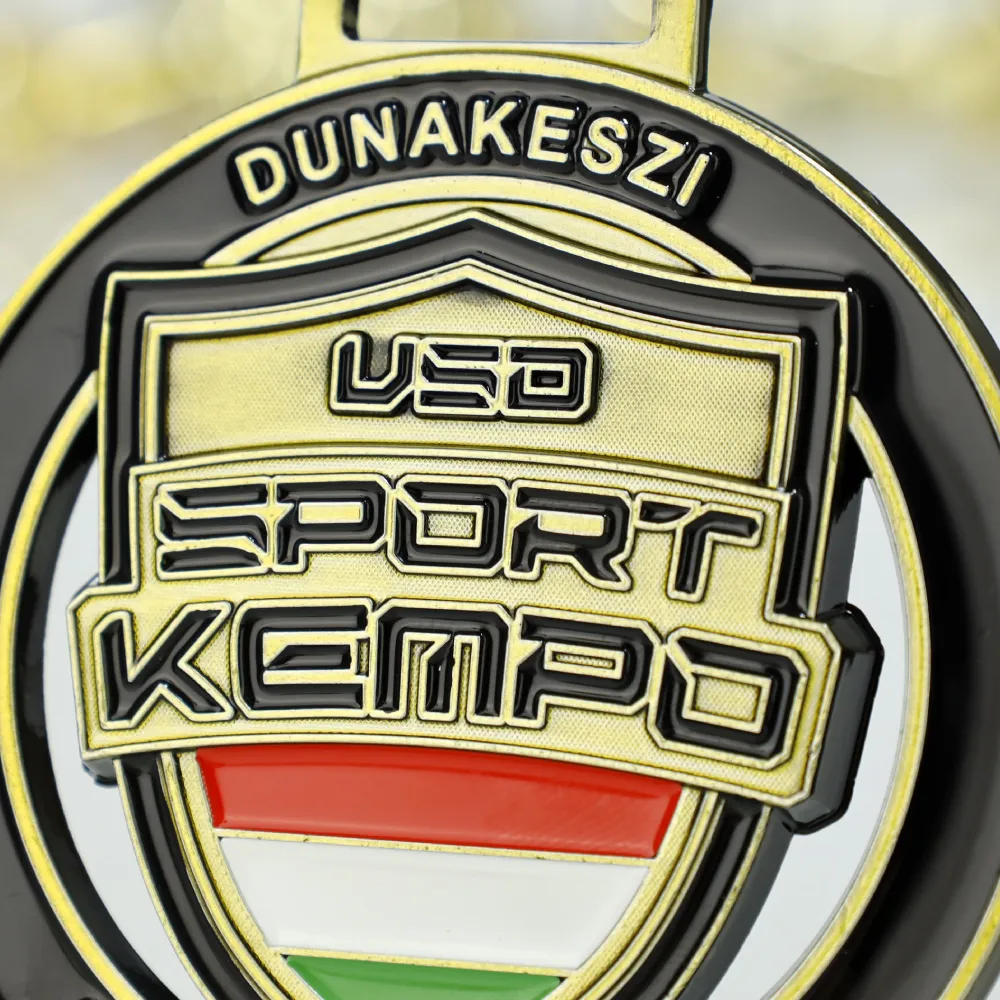 Medaglie sportive su misura per Hungarian Open Sport Kempo a Dunakeszi. Medaglie d'oro con dettagli neri e smalto colorato, caratterizzate da uno scudo con l'iscrizione "Sport Kempo" e la bandiera ungherese. Un design semplice ma audace che riflette lo spirito della competizione.