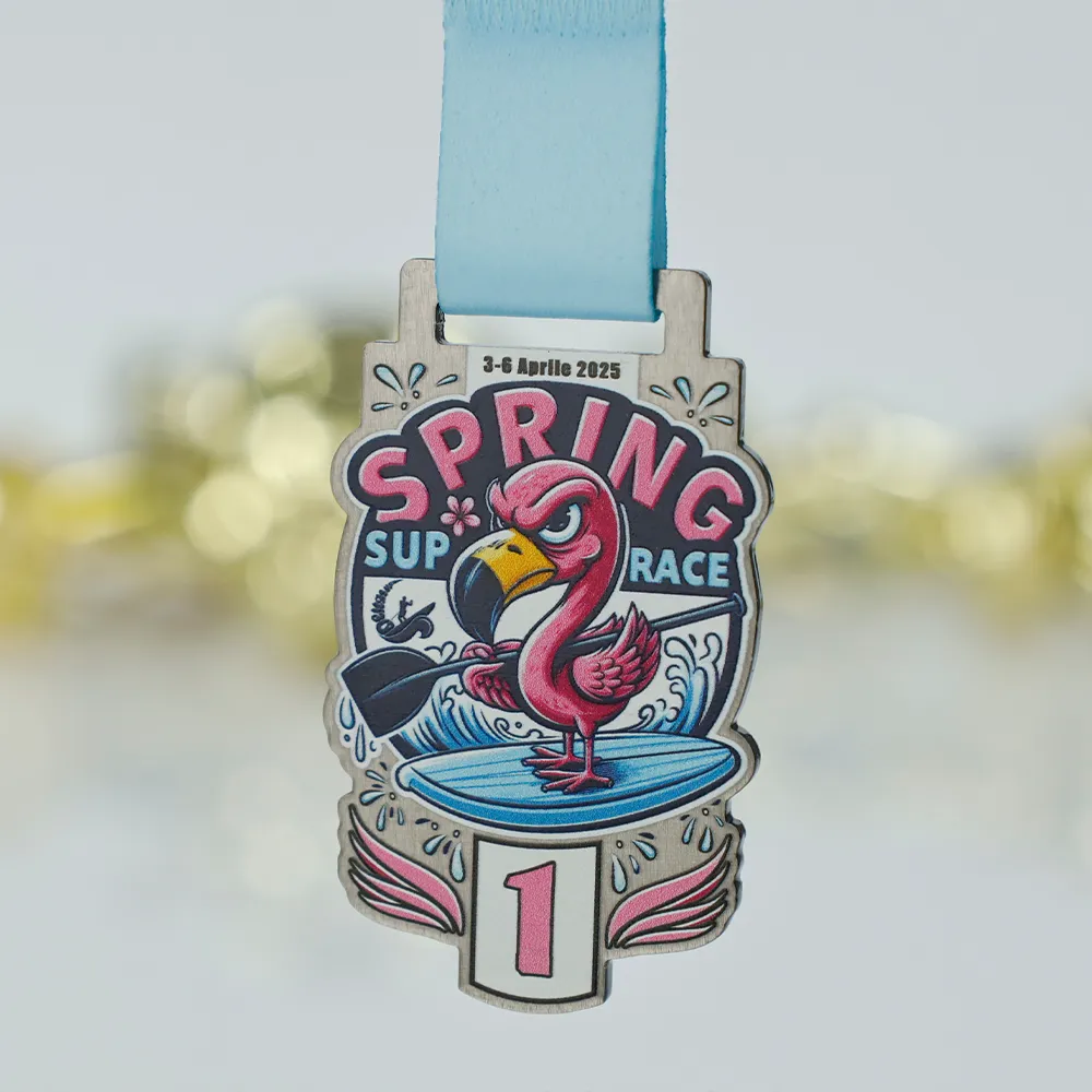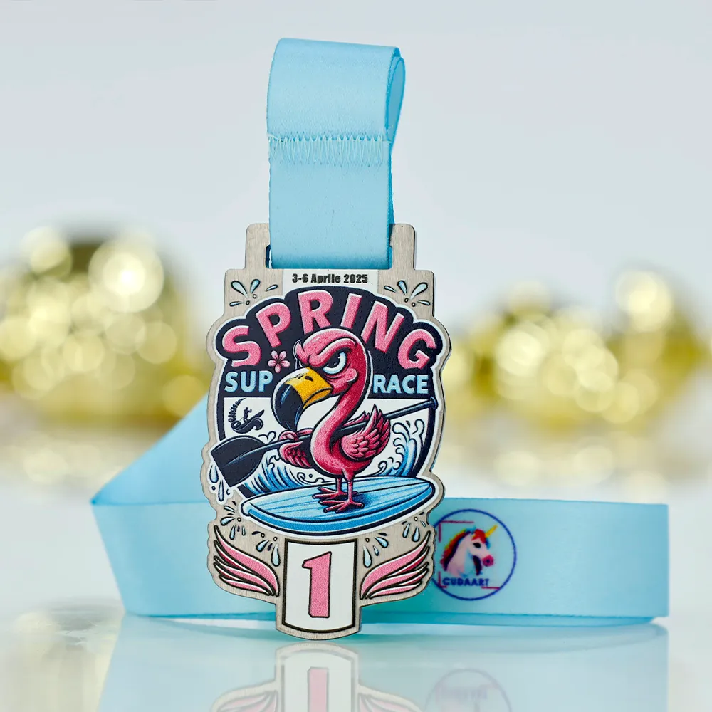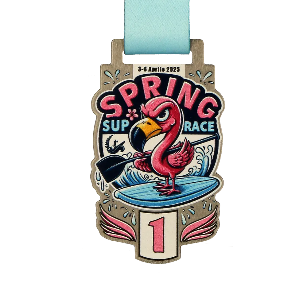 Medaglia personalizzata creata per la competizione SUP "Spring SUP Race" che si svolgerà nell'aprile 2025. Una grafica colorata e dinamica di un fenicottero su una tavola da SUP nelle tonalità di rosa, blu e nero, realizzata con stampa UV. La personalizzazione include la data dell'evento e il numero di posto raggiunto. È incluso un nastro azzurro.