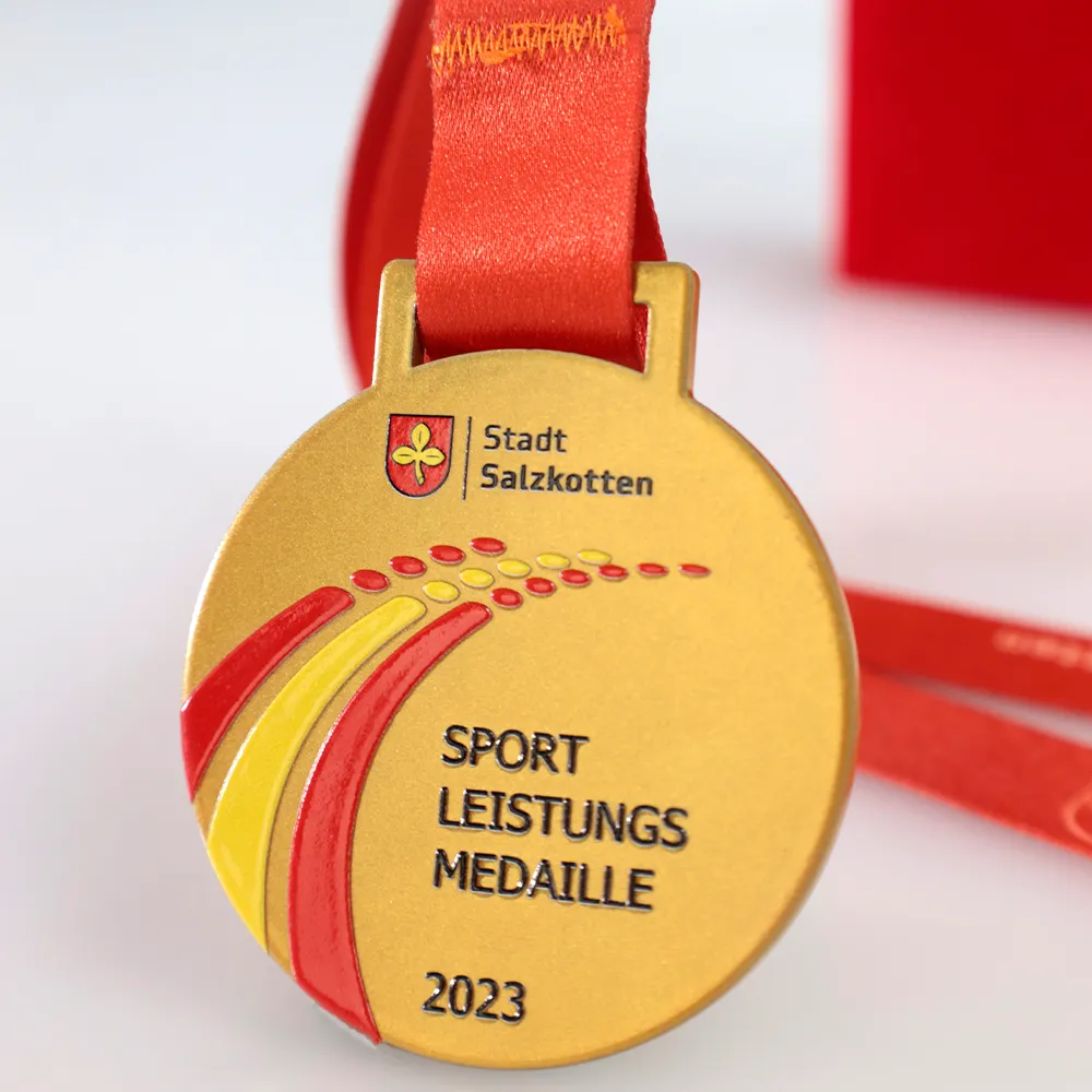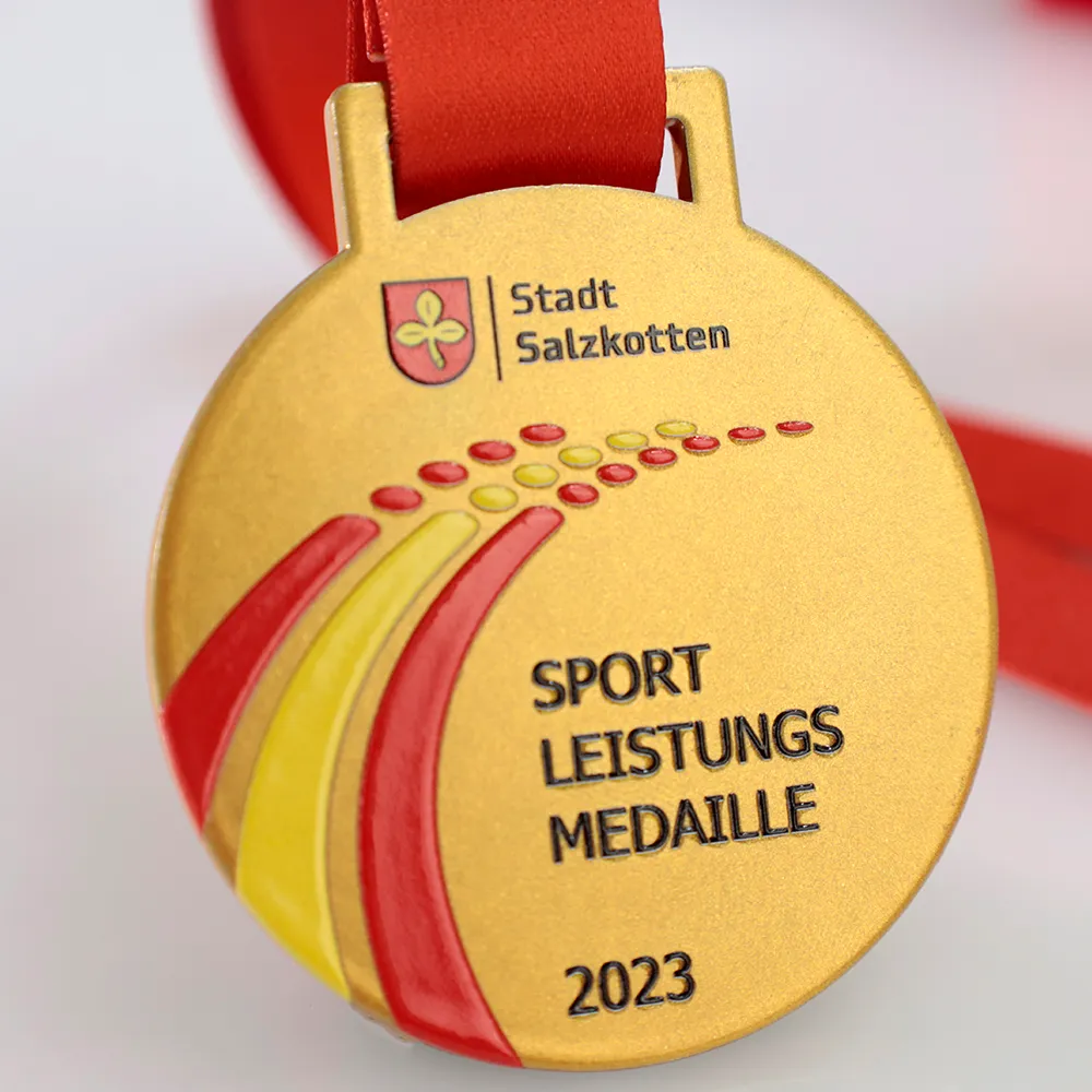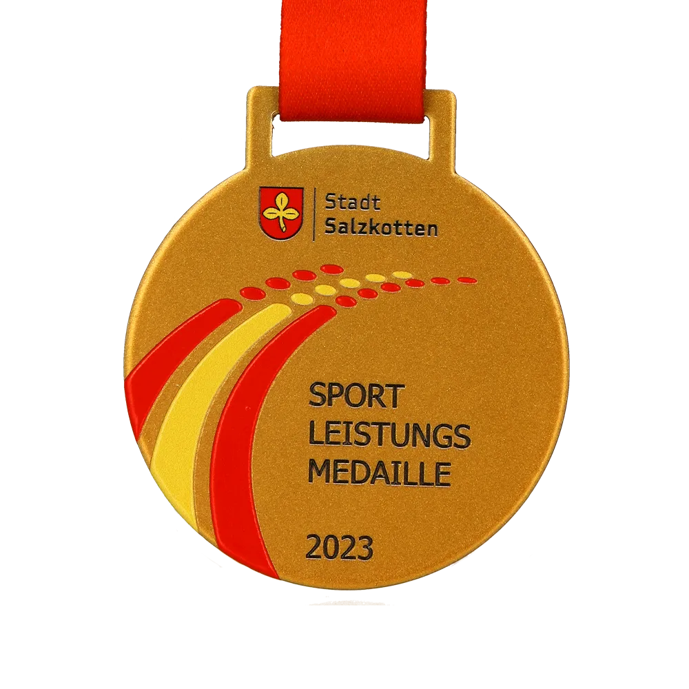 Una medaglia sportiva creata per l'evento Stadt Salzkotten serve come ricordo per gli atleti distinti. La medaglia è stata tagliata al laser, garantendo bordi precisi e una forma perfetta. Tutti gli elementi grafici e le iscrizioni sono stati prodotti utilizzando la stampa UV.