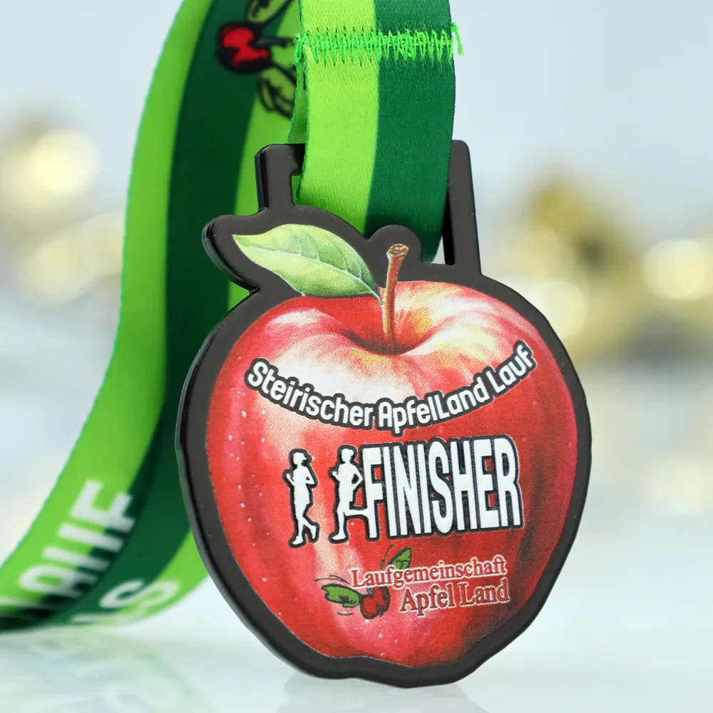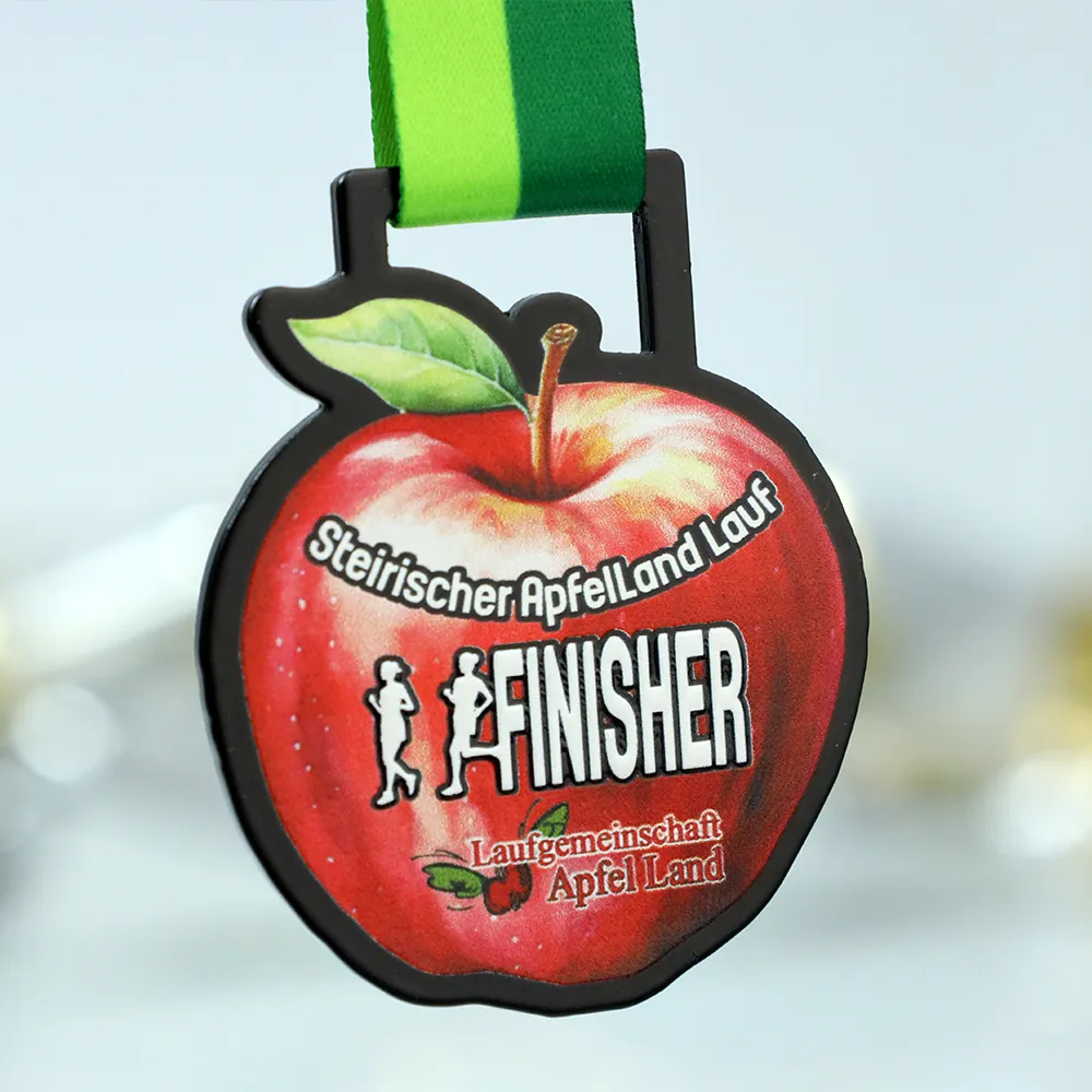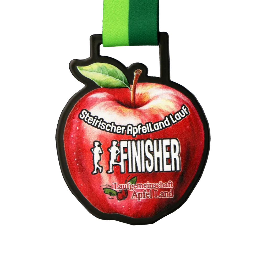 Questa robusta medaglia da corsa, realizzata per la Steirischer ApfelLand Lauf, si distingue per la sua forma non convenzionale che rispecchia perfettamente il contorno di una mela completa di foglia. La base è formata da metallo resistente, arricchito con grafiche utilizzando la moderna tecnologia di stampa UV. Questa medaglia è la prova che la produzione avanzata può trasformare un design grafico in un piccolo pezzo di arte funzionale.