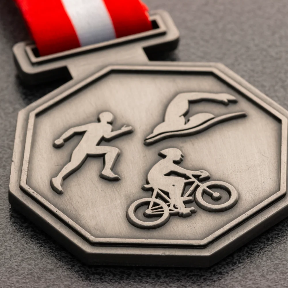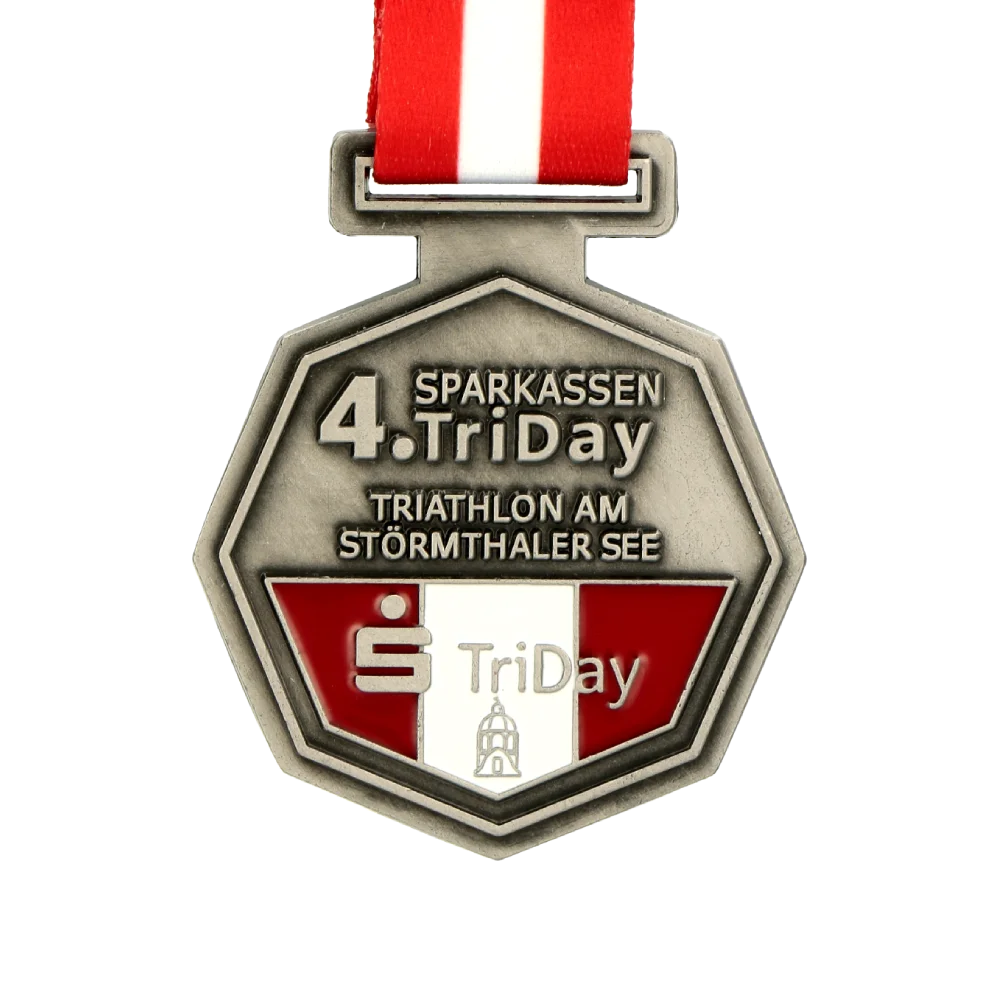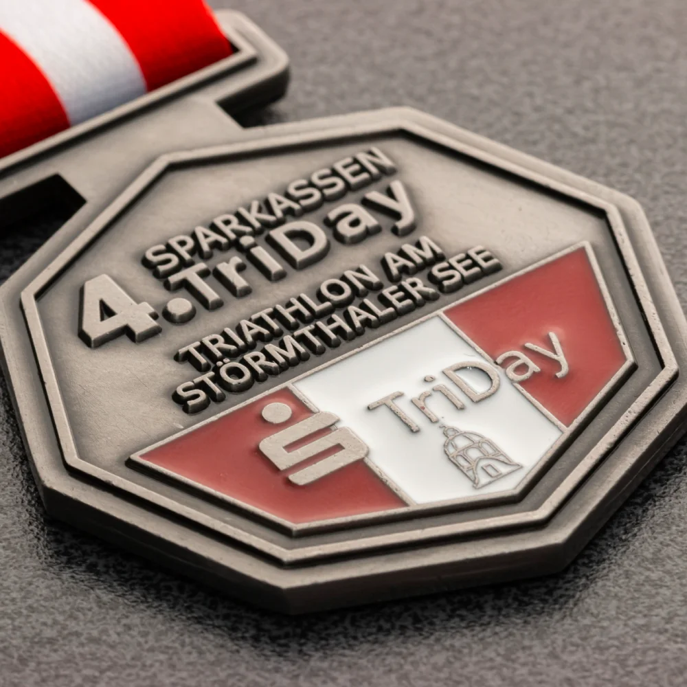 Il Triathlon è uno sport estremamente impegnativo, noto a chiunque abbia visto i triatleti spingere i propri limiti in acqua e sulla terraferma. Pertanto, le medaglie da triathlon dovrebbero simboleggiare lo sforzo e il duro lavoro che gli atleti mettono per raggiungere la vittoria. Questo è esattamente ciò che rappresentano le nostre medaglie su misura, in particolare quelle che abbiamo realizzato per lo Störmthaler Triathlon. I partecipanti alla gara hanno ricevuto medaglie splendidamente coniate con decorazioni sia sul dritto che sul rovescio. Abbiamo progettato queste medaglie personalizzate per evidenziare il nome dell’evento, importante per l’organizzatore. Proprio sotto di esso abbiamo posizionato uno smalto colorato che attira l’attenzione, mentre il retro della medaglia è completato da decorazioni tridimensionali che riflettono la corsa, il nuoto e il ciclismo.