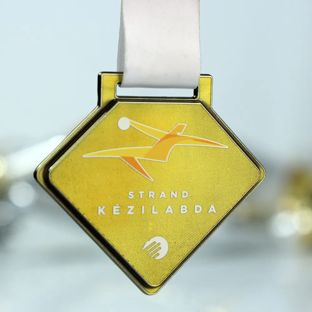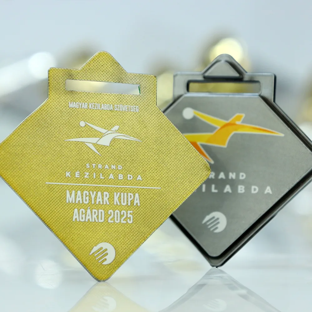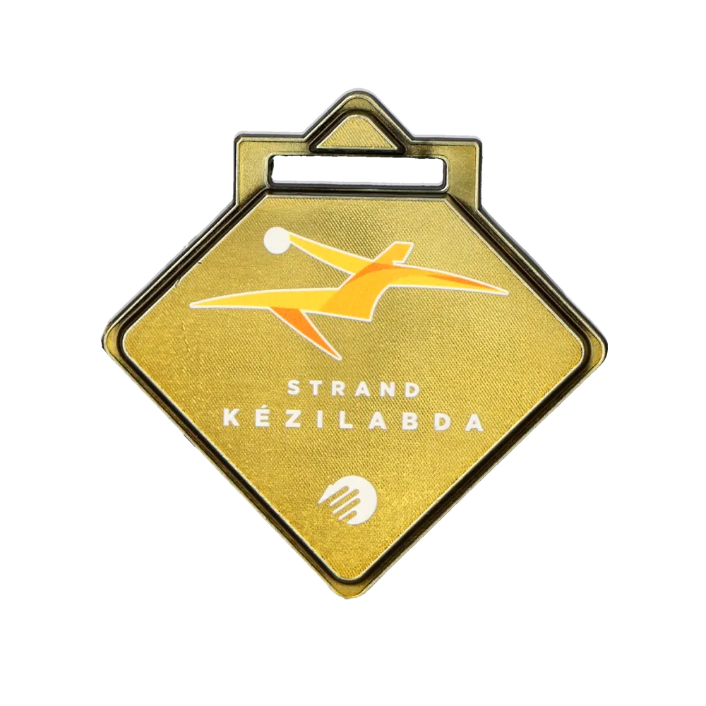 Questa solida medaglia pressofusa è stata realizzata appositamente per il torneo di Strand Kézilabda. La sua caratteristica forma romboidale con un bordo marcato costituisce una base eccellente per la tecnica di personalizzazione della stampa UV. Grazie ad essa, la dinamica silhouette arancio-gialla del giocatore in volo e le scritte bianche sono estremamente leggibili sullo sfondo dorato testurizzato. La precisione della fusione, combinata con una stampa durevole, garantisce che il premio mantenga il suo aspetto professionale per molti anni.