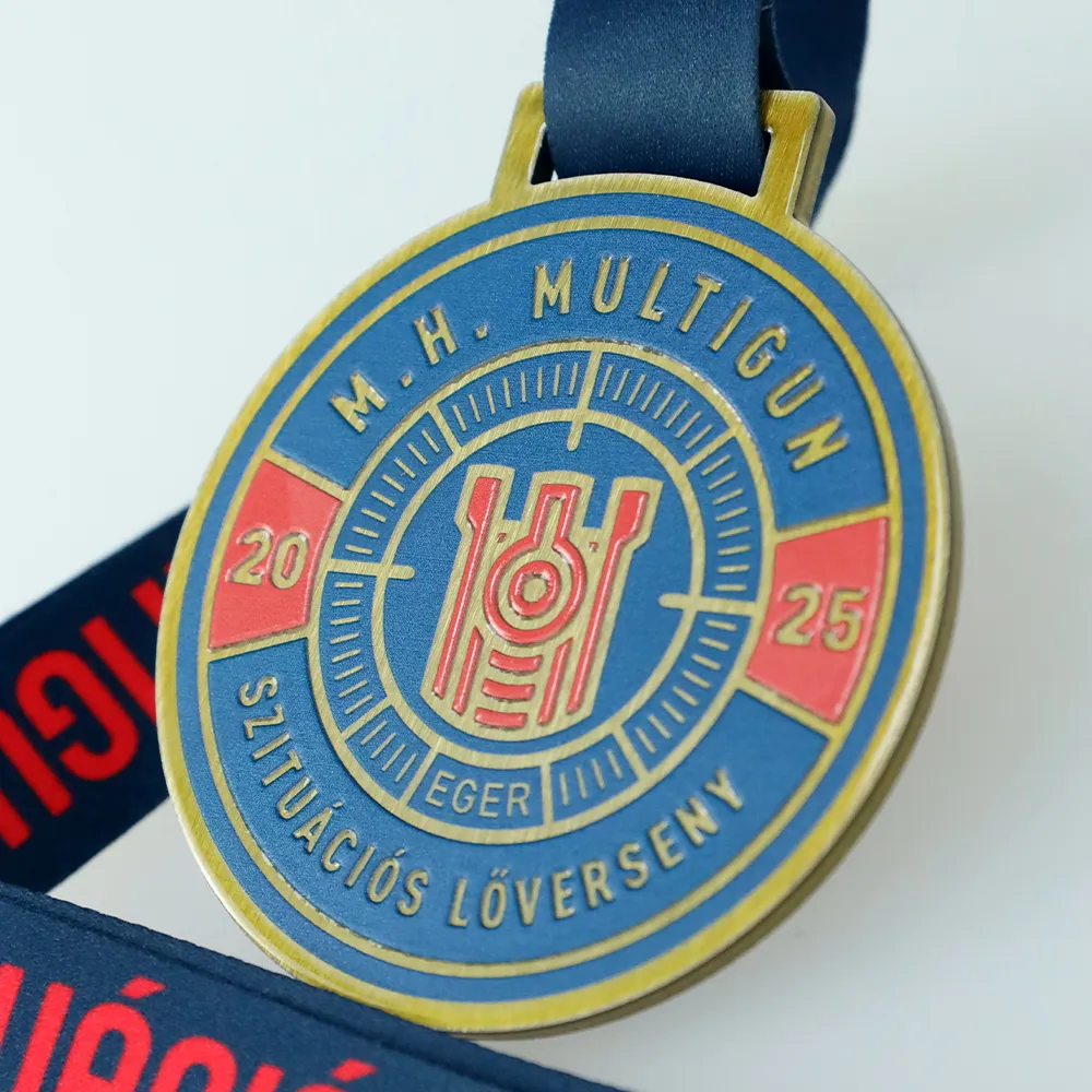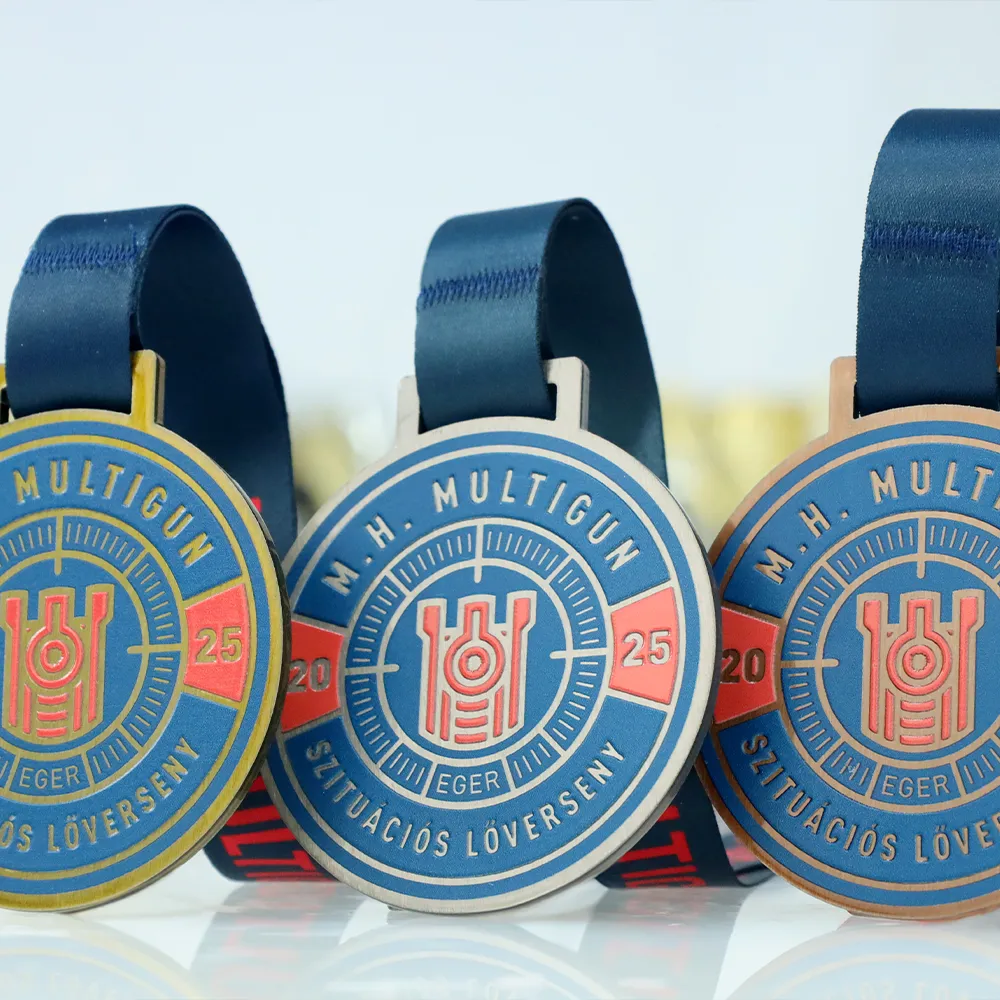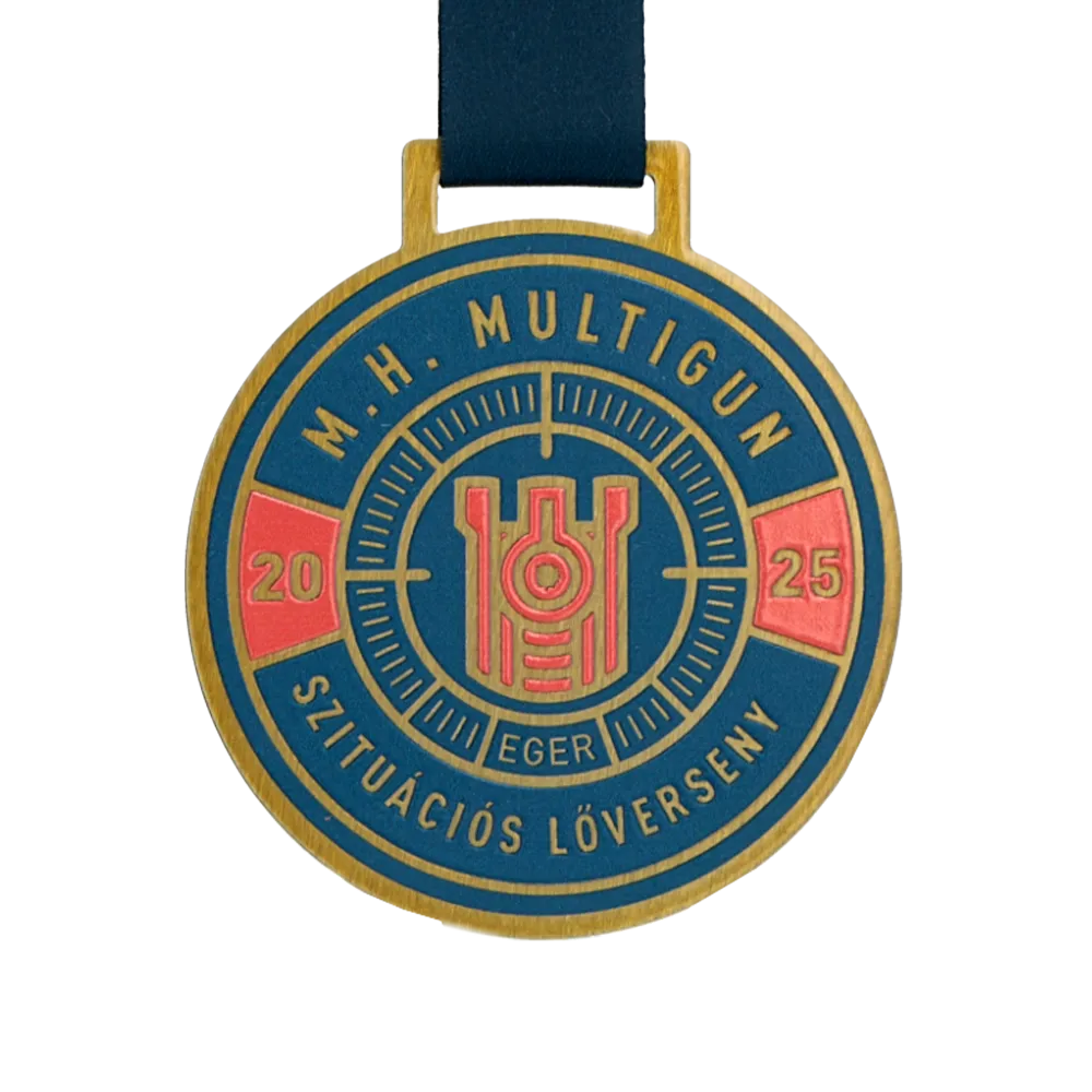 Medaglia rotonda da tiro M.H. Multigun Szituációs Lőverseny, tagliata al laser dall'acciaio e rifinita in oro opaco. La stampa UV articola la composizione in tre zone: un anello esterno che riporta il nome della competizione e la località di Eger, una fascia centrale con una scala angolare, e un reticolo di mira centrale con un pittogramma di arma da fuoco.