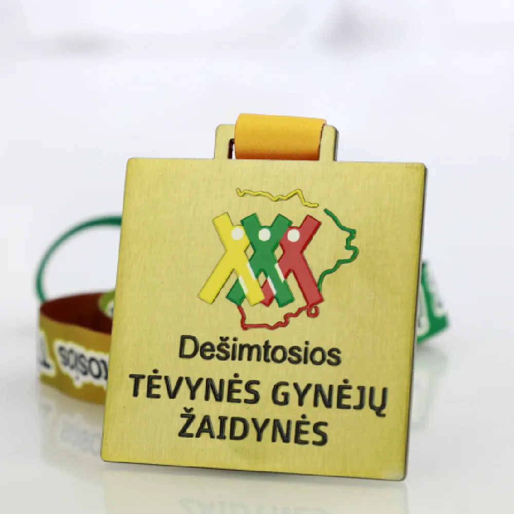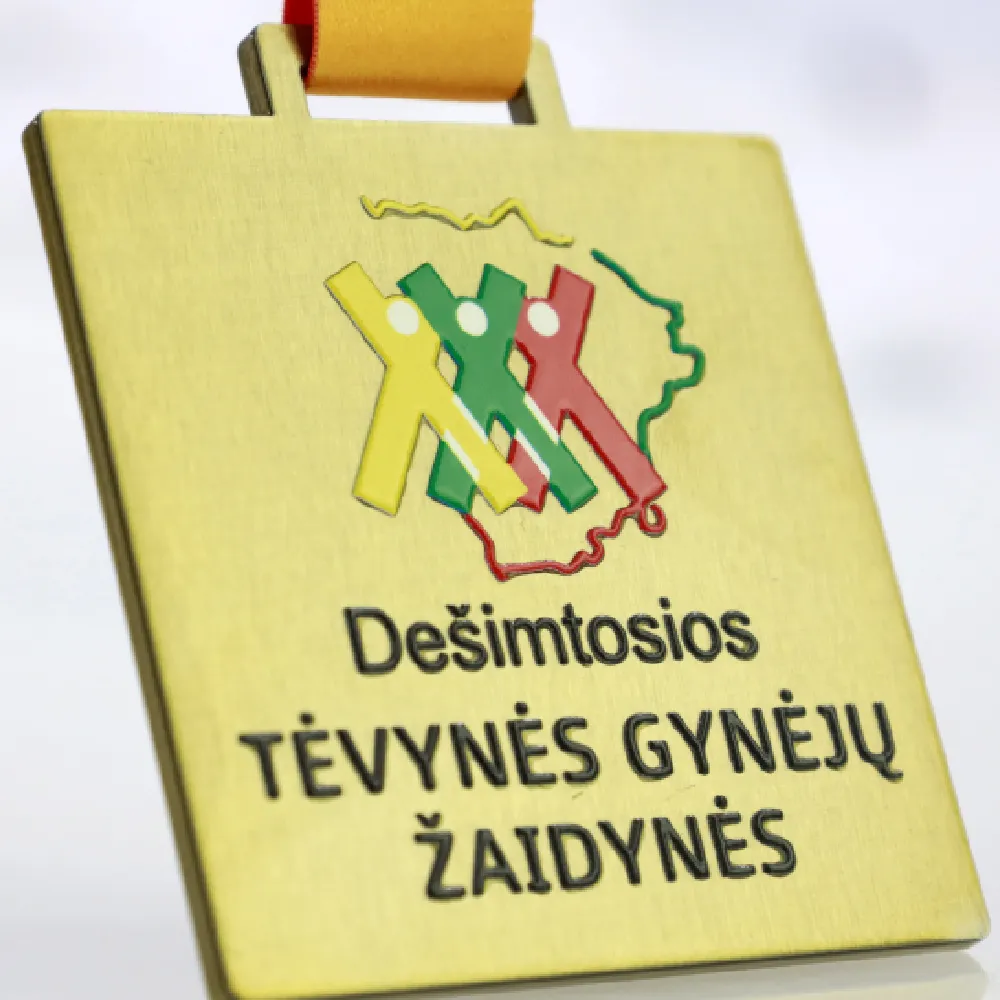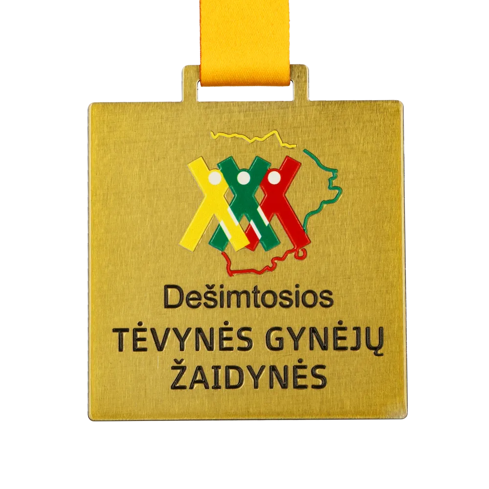 Una medaglia su misura per i Decimi Giochi Sportivi dei Difensori della Patria. La medaglia presenta una forma quadrata unica con angoli arrotondati e una finitura dorata. Il motivo centrale mostra figure colorate di atleti sullo sfondo del contorno della Lituania.