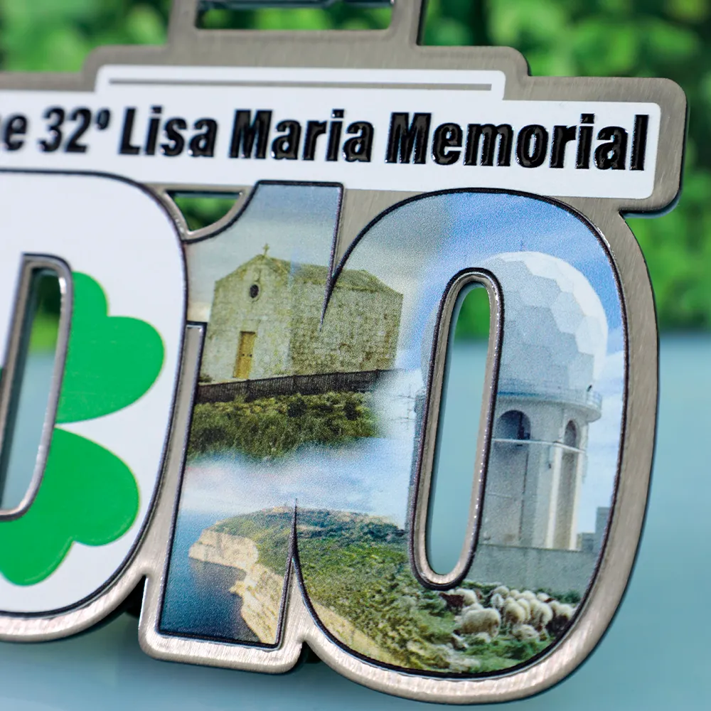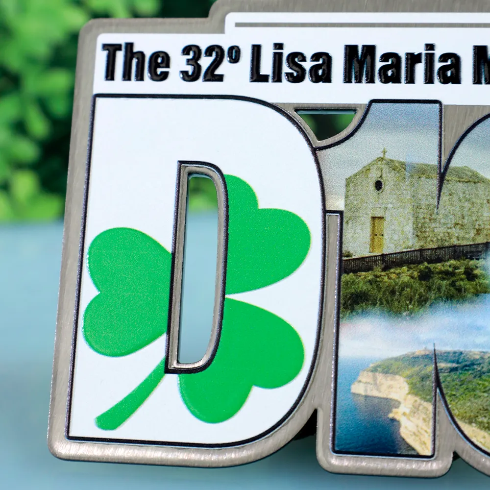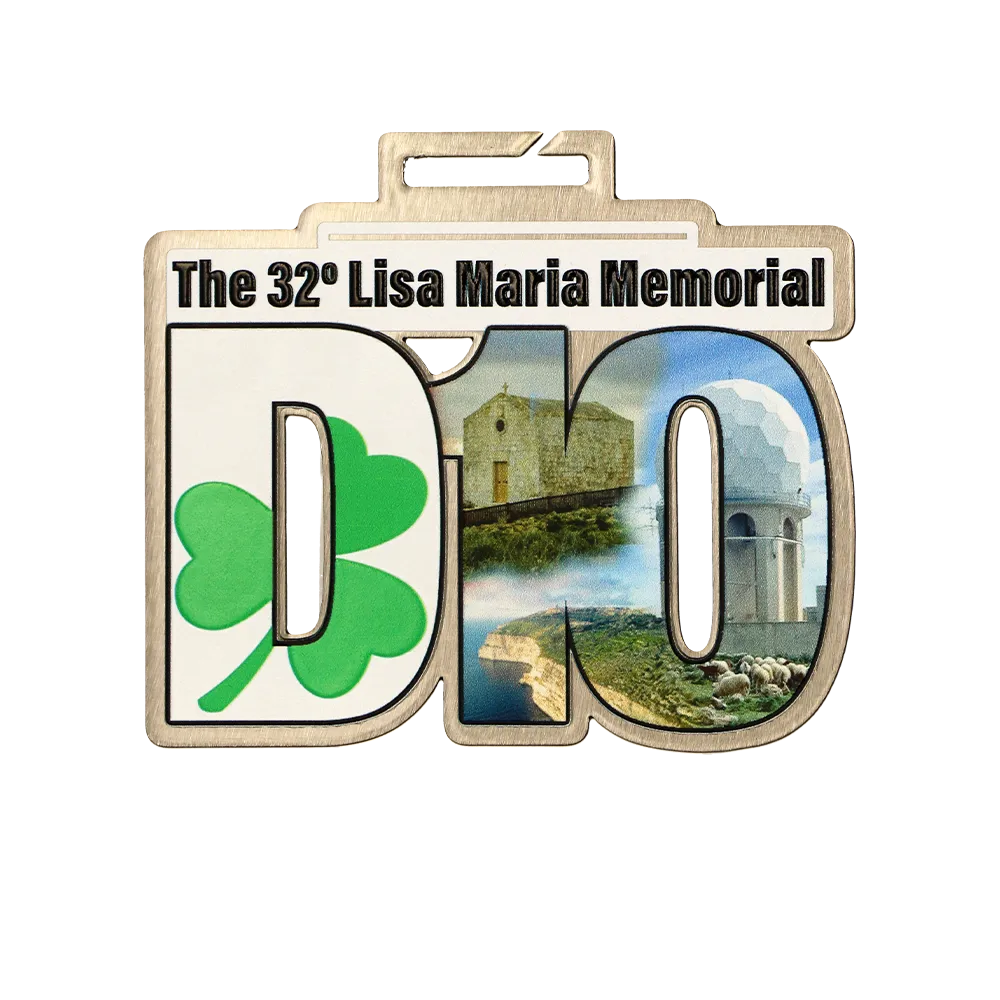 Una medaglia su misura per i partecipanti al The 32 Lisa Maria Memorial è stata realizzata con la massima cura per riflettere il carattere di questo evento. La medaglia presenta un trifoglio verde, a simboleggiare la cultura irlandese, insieme a paesaggi e punti di riferimento. La medaglia è stata tagliata al laser, risultando in una forma insolita. Le grafiche colorate e gli abbellimenti sono stati tutti prodotti utilizzando la stampa UV.