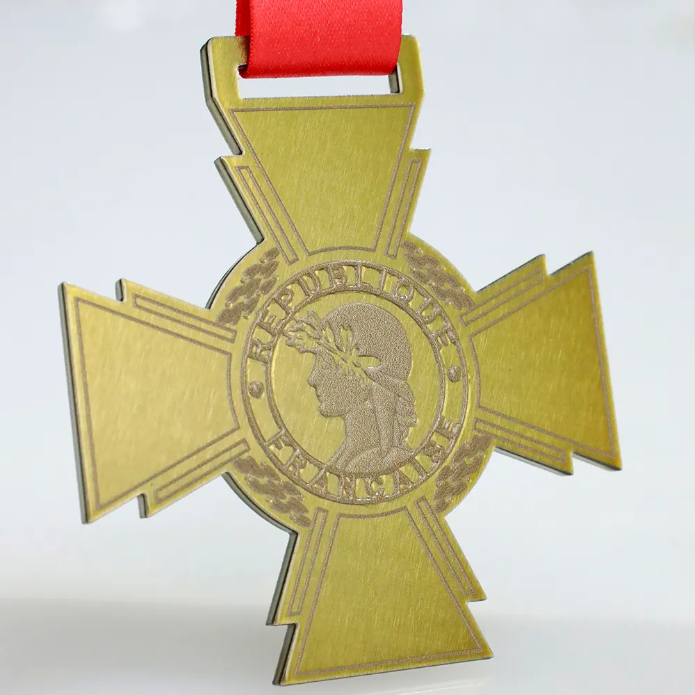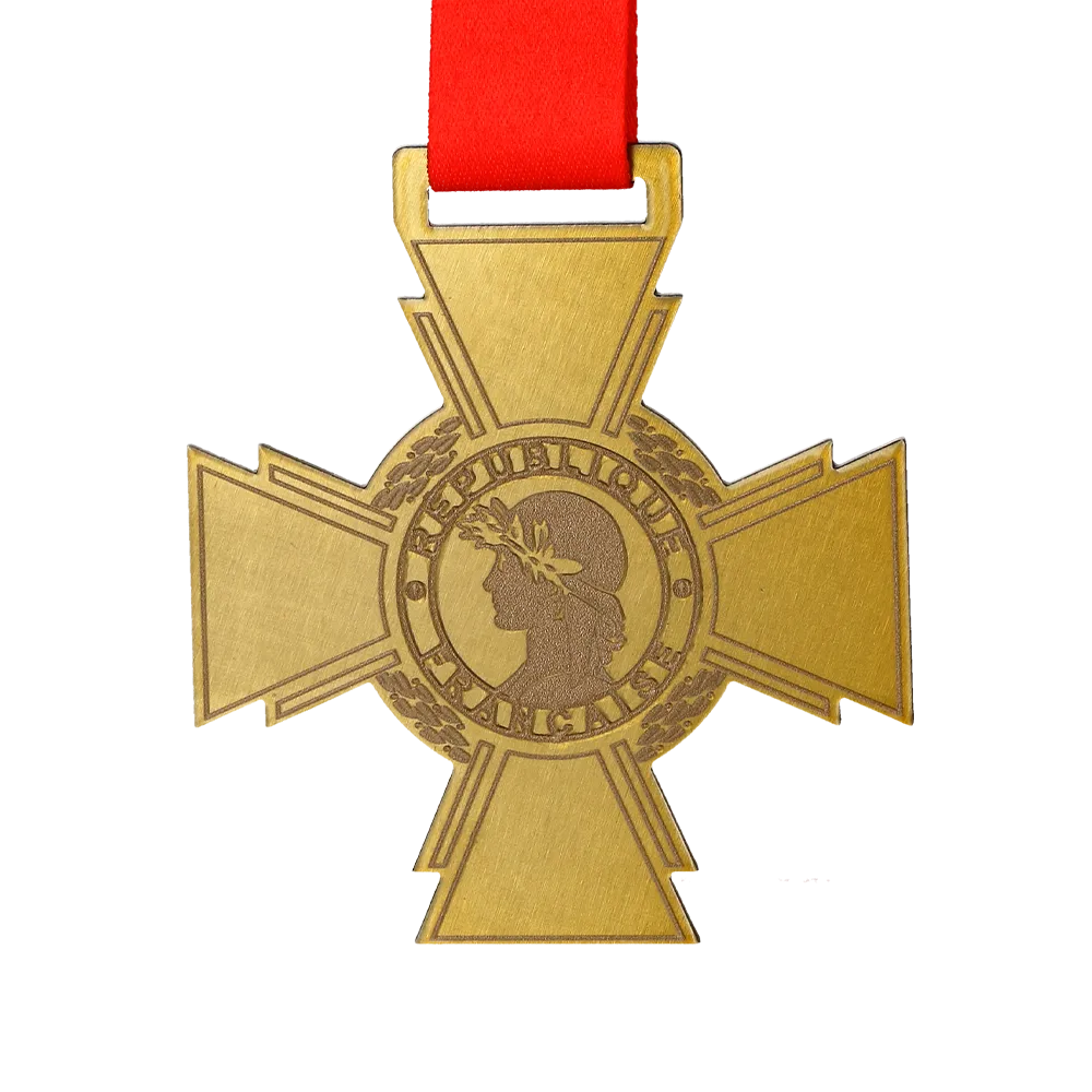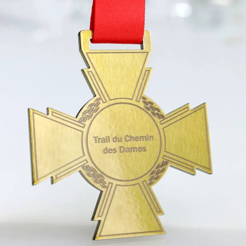 Una medaglia da triathlon bifacciale in oro a forma di croce viene assegnata ai partecipanti al Trail du Chemin des Dames.