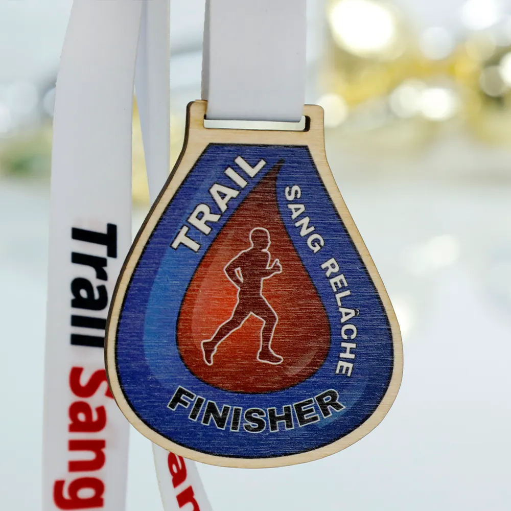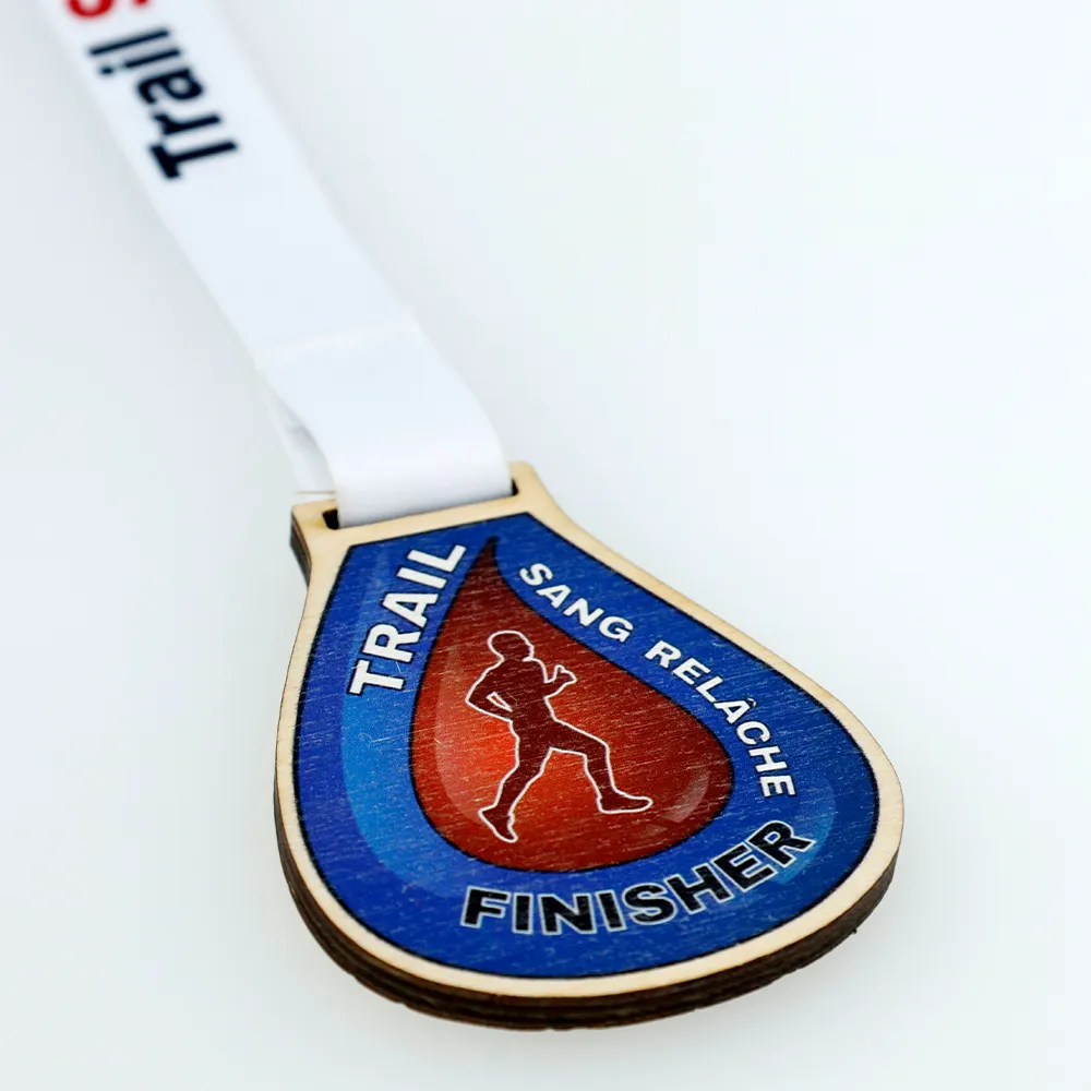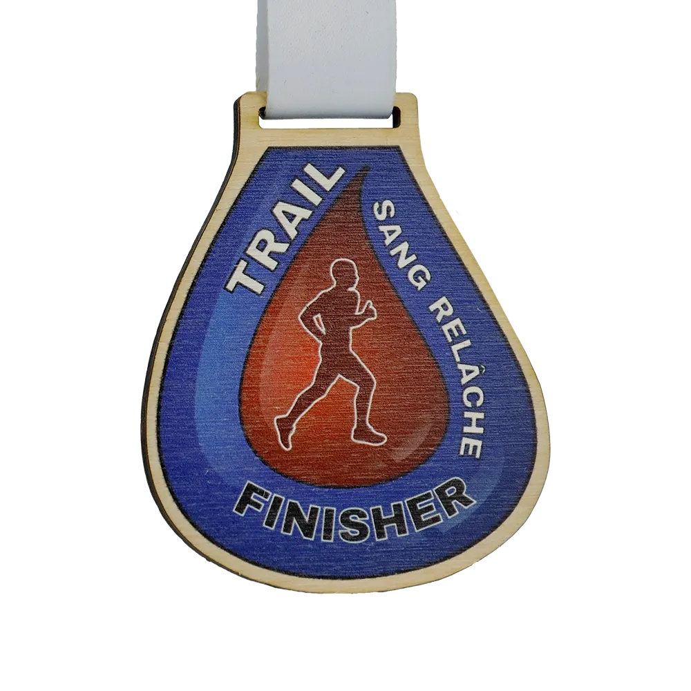 Medaglie in legno create per i partecipanti alla gara "Trail Sang Relâche". La medaglia, realizzata in legno a forma di goccia, presenta stampa UV nelle tonalità di blu e rosso. La parte anteriore mostra la silhouette di un corridore e iscrizioni con il nome della gara.