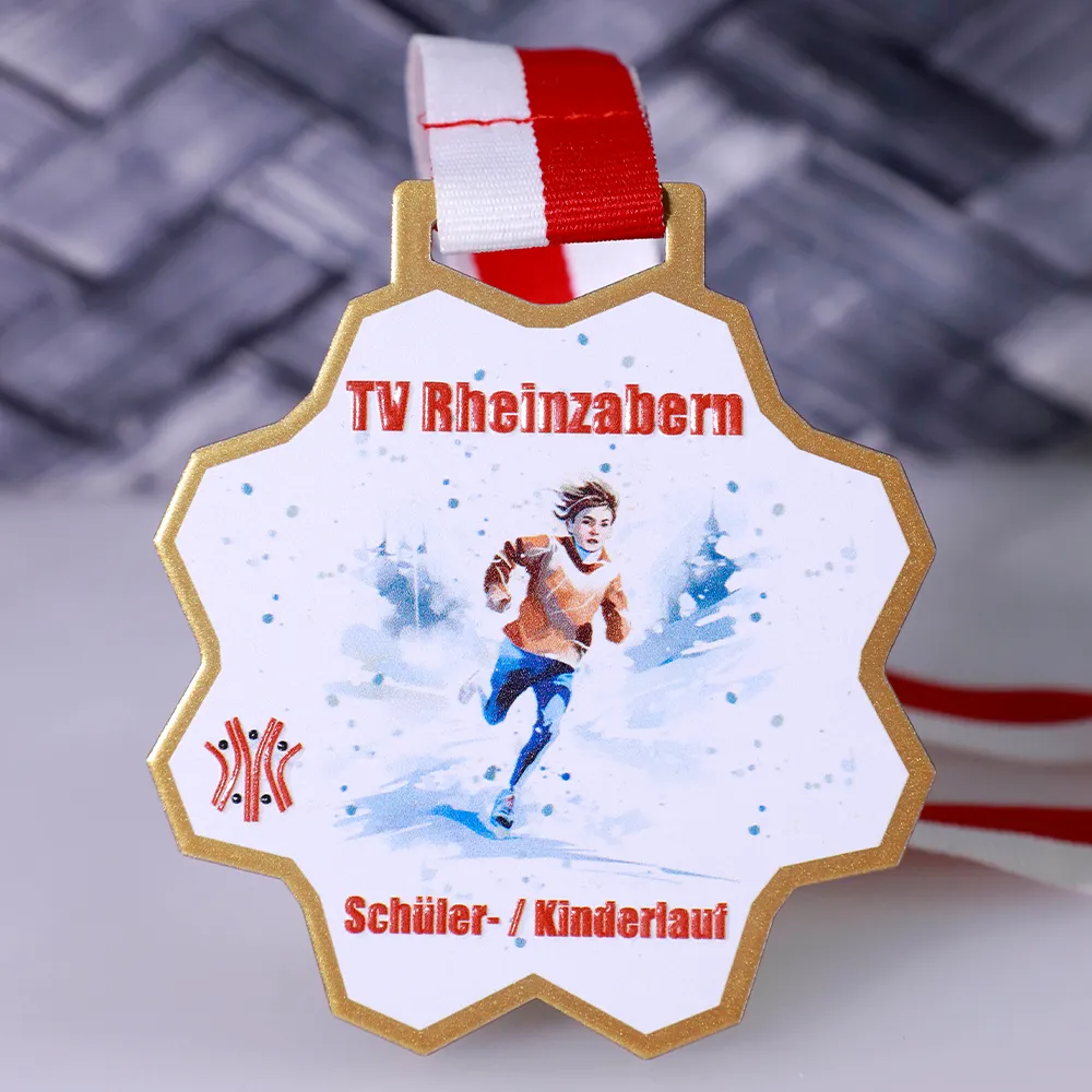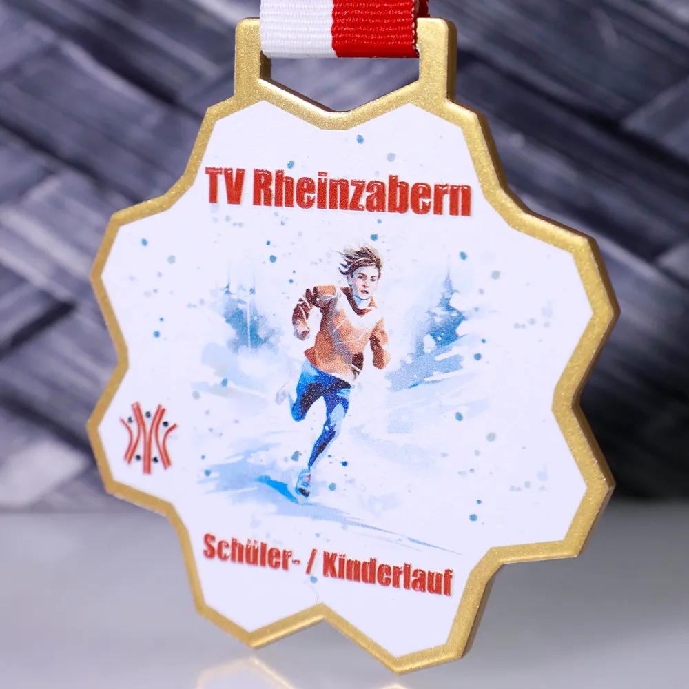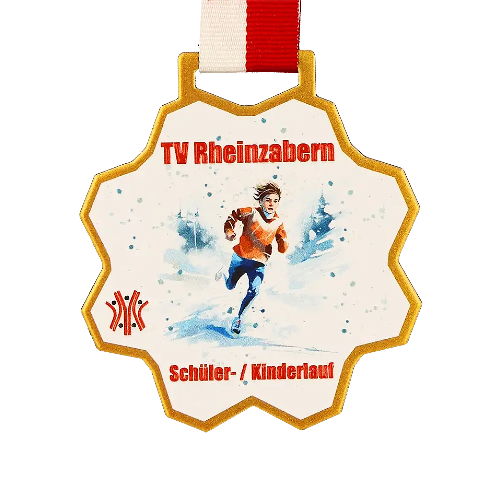 TV Rheinzabern ospita una corsa annuale per bambini e giovani in età scolare organizzata dal club atletico TV Rheinzabern in Germania. Lo scopo di tali eventi è promuovere l’attività fisica e uno stile di vita sano tra i più giovani nonché favorire il loro interesse per lo sport e l’atletica. I partecipanti possono aspettarsi varie distanze adattate alle loro fasce d’età consentendo sia ai bambini più piccoli che ai giovani più grandi di partecipare. Questo evento è una grande opportunità per una competizione divertente e per trascorrere del tempo all’aria aperta. Svolge un ruolo importante nella costruzione di un senso di comunità e amicizia tra i partecipanti. Winmed ha partecipato all’evento creando una medaglia unica per i bambini. È progettata a forma di stella con bordi dolcemente arrotondati e presenta un bordo dorato. Il centro della medaglia è bianco inteso a evocare un paesaggio invernale. La medaglia mostra un’immagine colorata di un bambino che corre catturando lo spirito di questo evento sportivo. Il nome dell’organizzatore è posto nella parte superiore della medaglia. La medaglia pende su un nastro standard rosso e bianco.