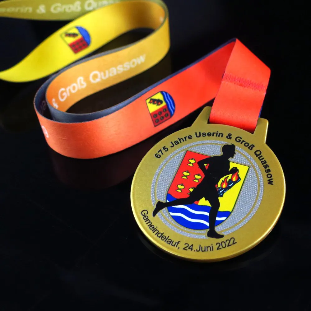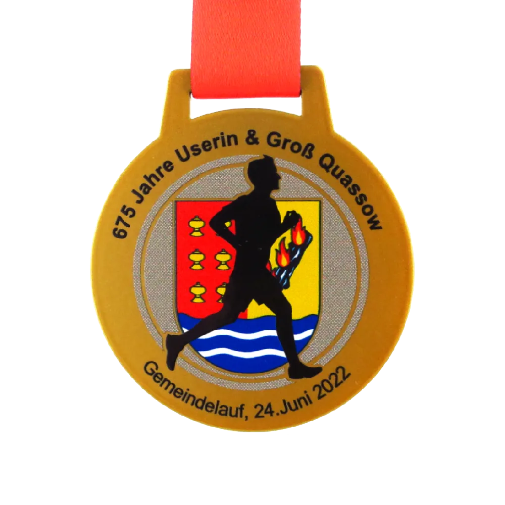 Medaglia d'oro con grafica colorata e progettata individualmente con motivo di corsa.