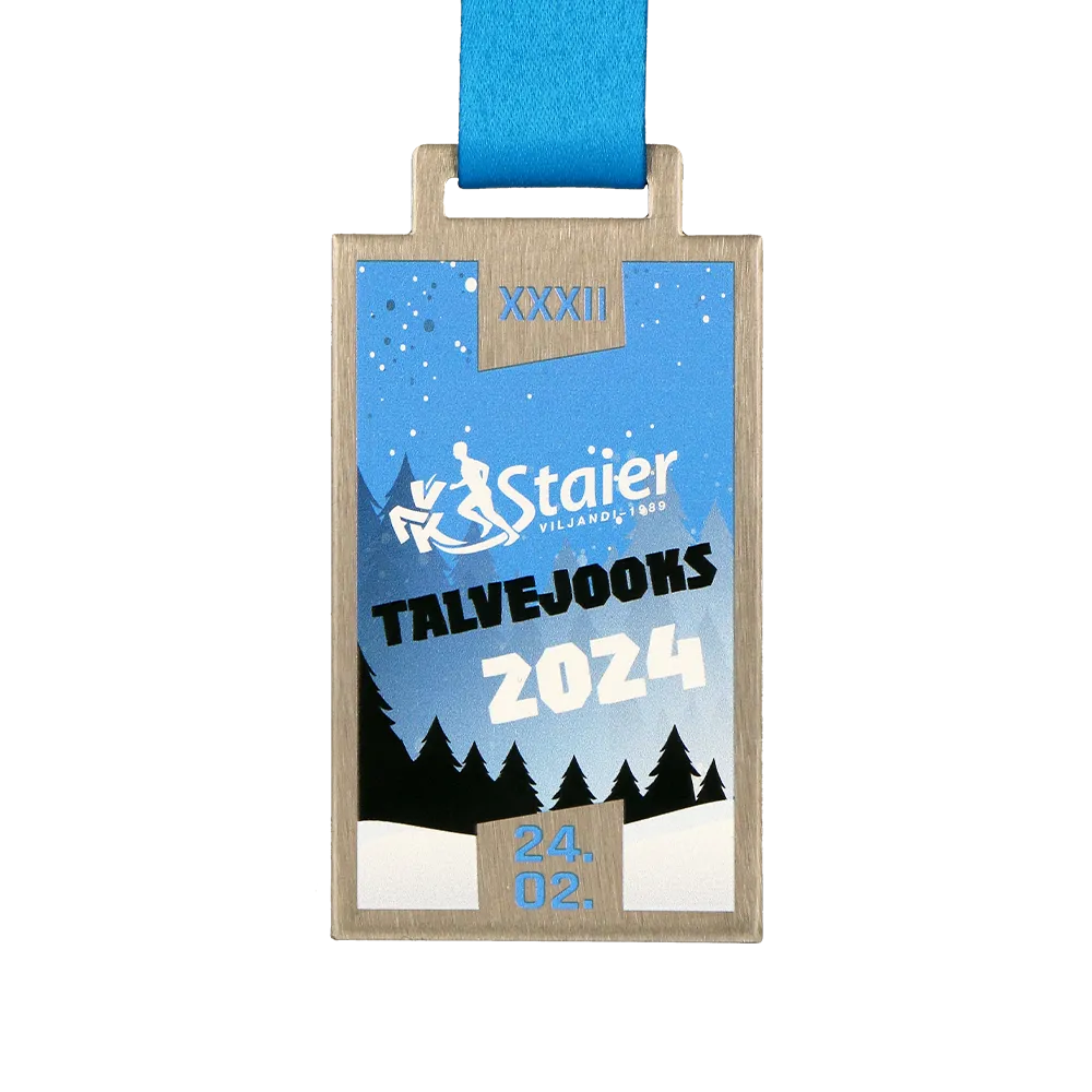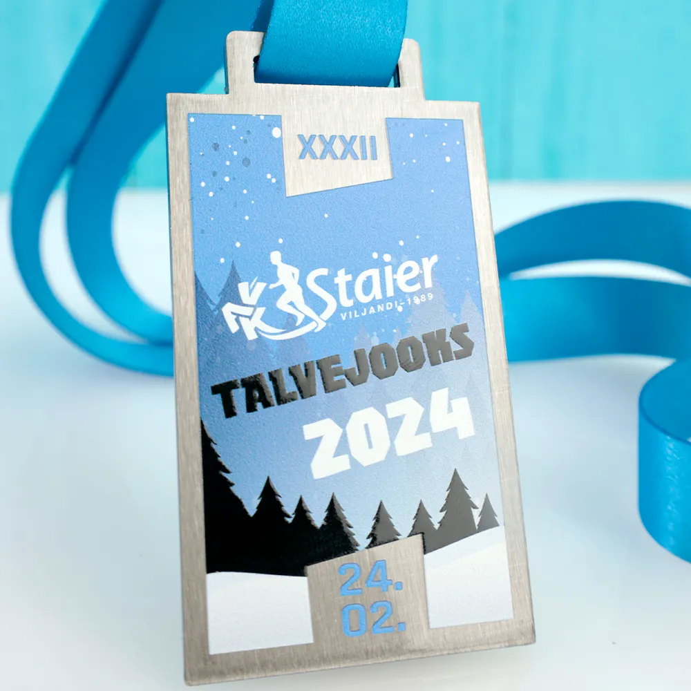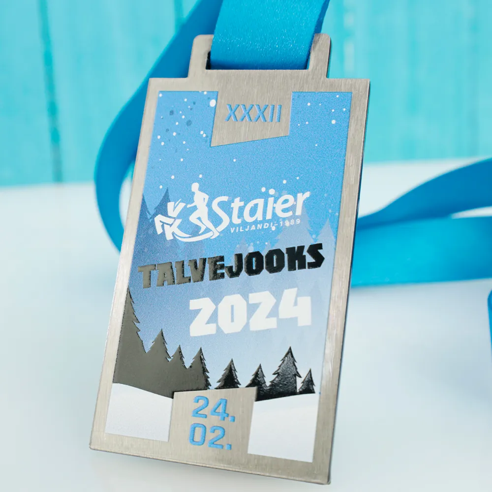 Una medaglia da corsa creata per l'evento Vak Staieri Talvejooks 2024 è un onore per i partecipanti di questa gara invernale. La medaglia presenta un tema invernale con una foresta e stelle, catturando perfettamente l'atmosfera di una corsa invernale. Grafiche colorate, incluso il logo dell'evento, sono state applicate utilizzando la stampa UV.