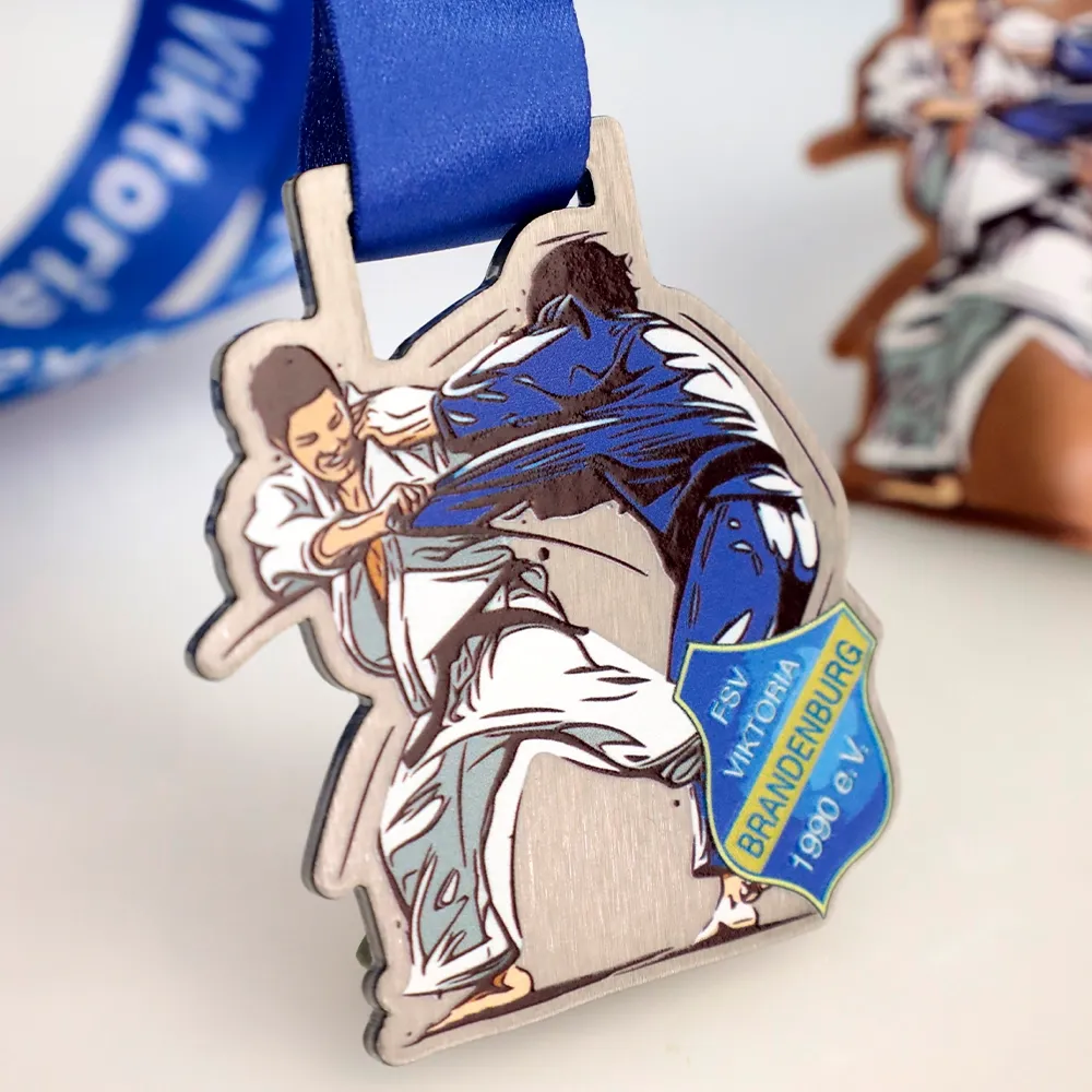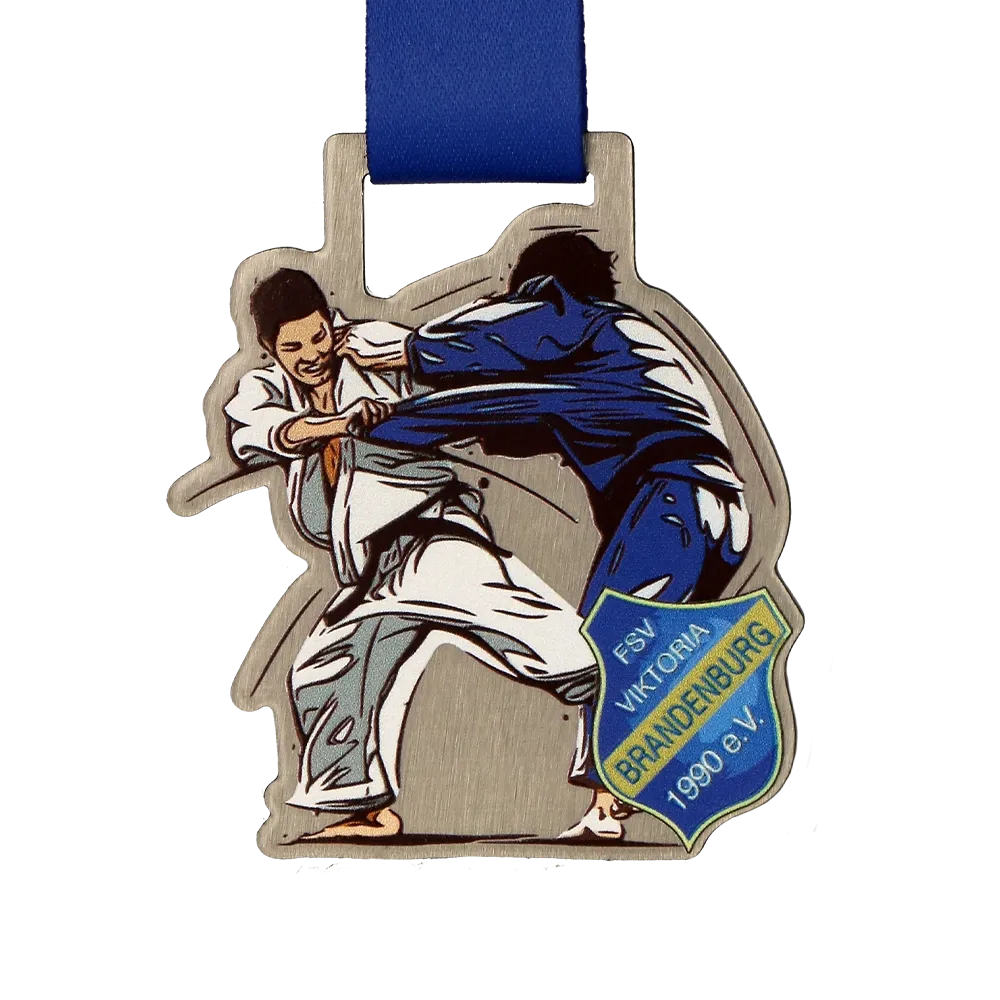Abbiamo creato una medaglia judo in argento per il club FSV Viktoria Brandenburg 1990 e.V., destinata agli appassionati di judo. La medaglia presenta una scena dinamica di due judoka in azione e il logo del club, che abbiamo realizzato utilizzando la stampa UV. La medaglia cattura perfettamente l'energia e il dinamismo di questo sport.