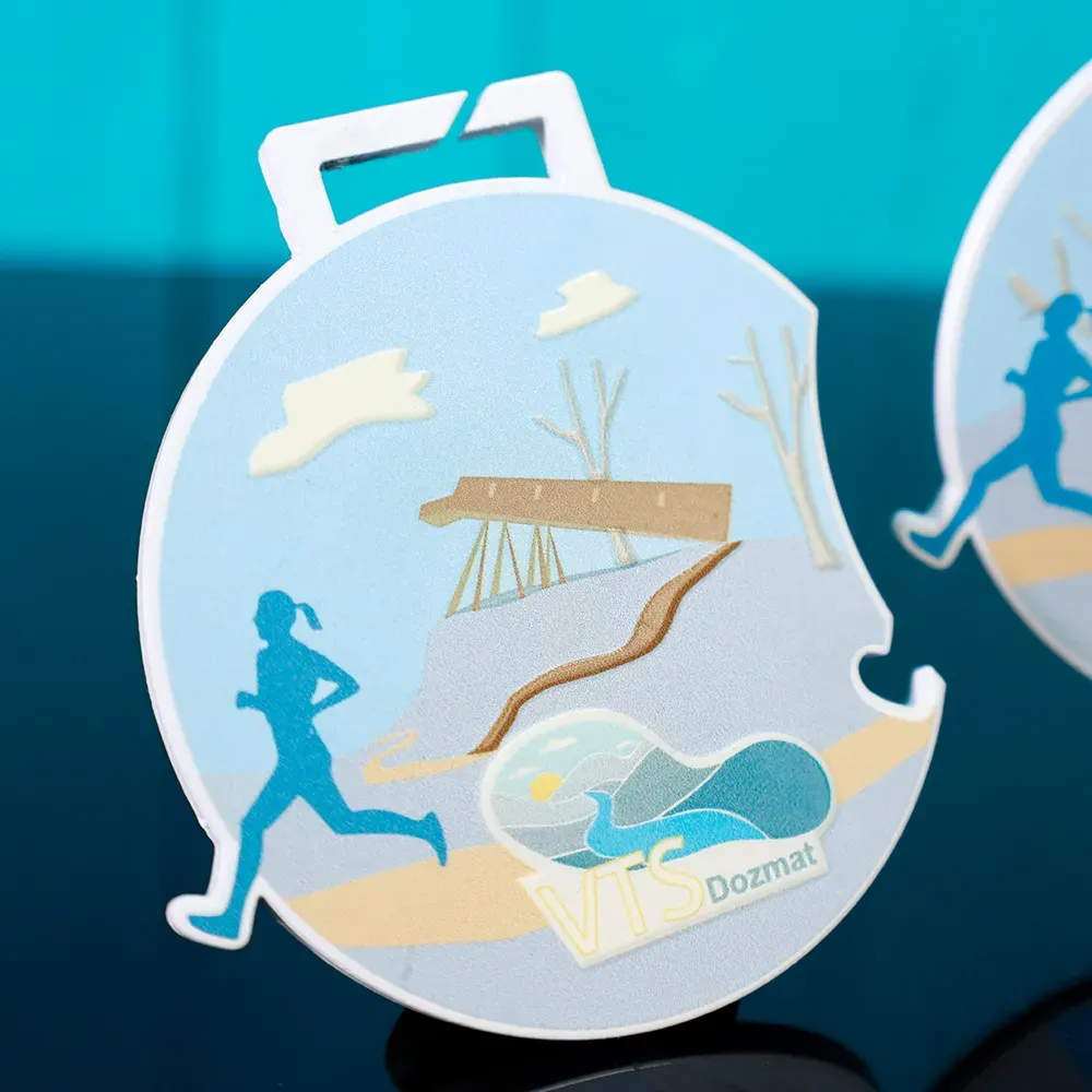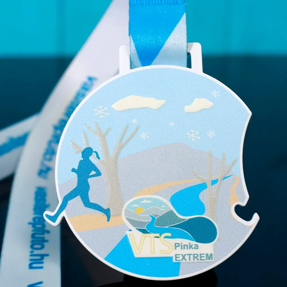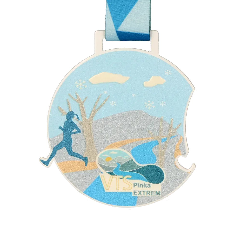 Medaglia da corsa per la VTS Pinka Extrem, creata per i partecipanti a corse estreme su sentiero. La medaglia è in sfumature di blu con accenti pastello di beige e bianco, conferendole un aspetto fresco e naturale. Ha una forma rotonda con ritagli sui bordi. La parte centrale presenta una grafica dinamica di un corridore su un paesaggio montuoso.