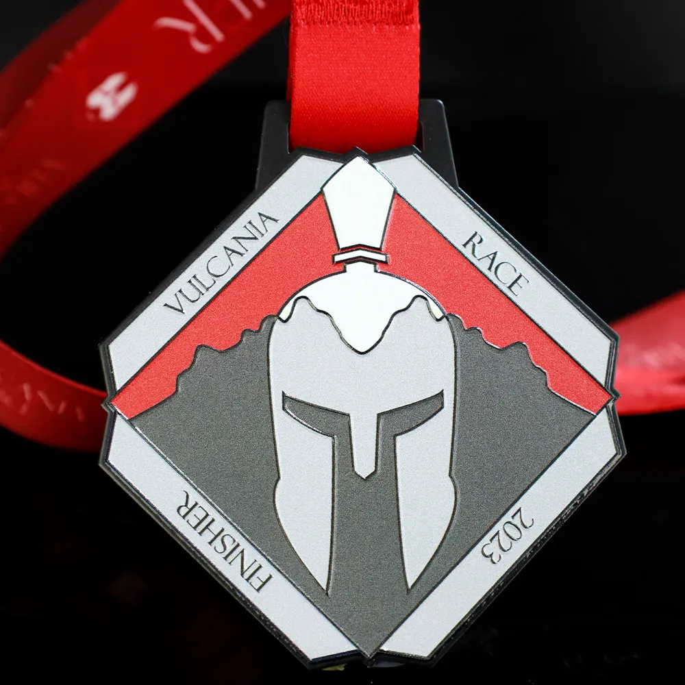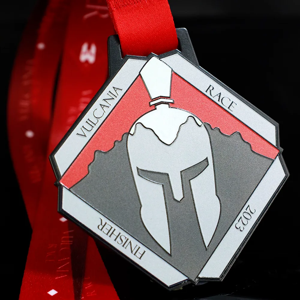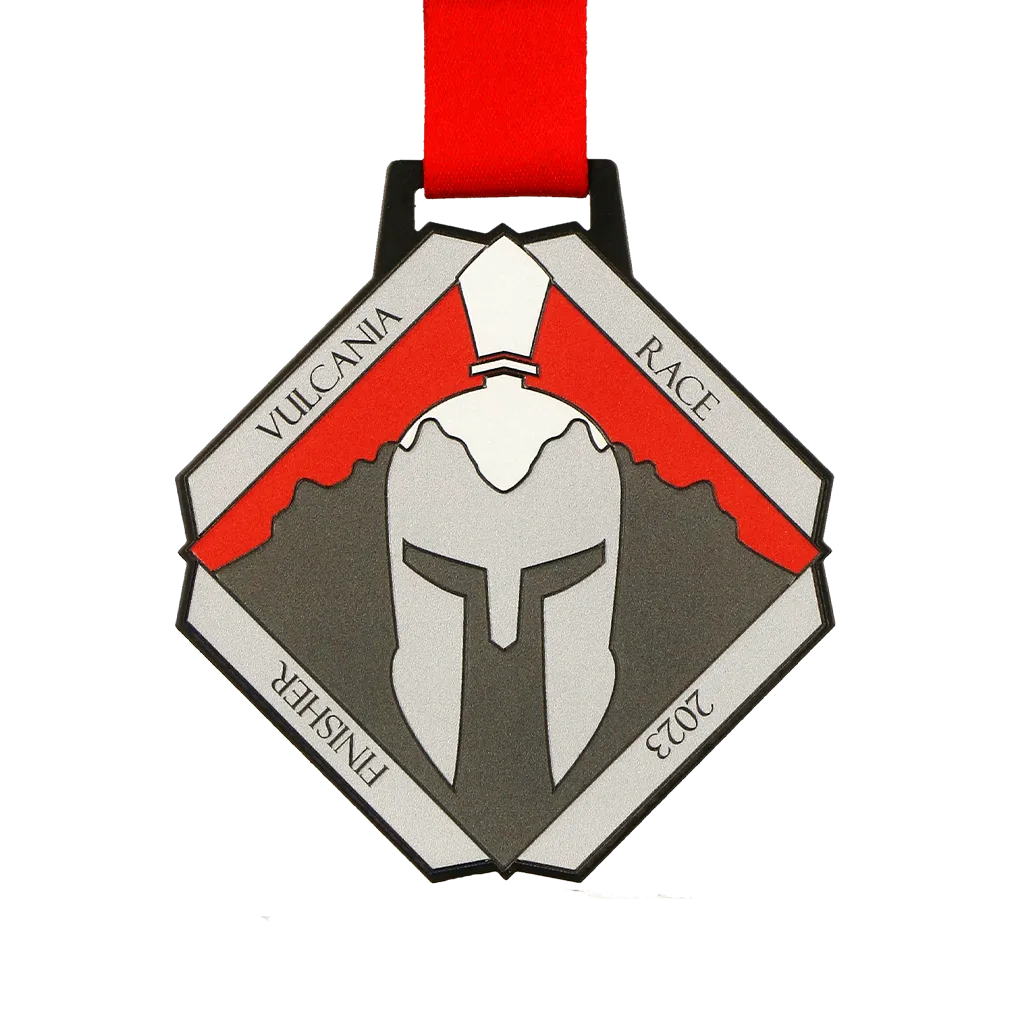 Medaglia da corsa preparata per la Vulcania Race. Su una base di medaglia nera, abbiamo stampato il nome dell'evento e un elmo da cavaliere, tematicamente legati alla gara.
