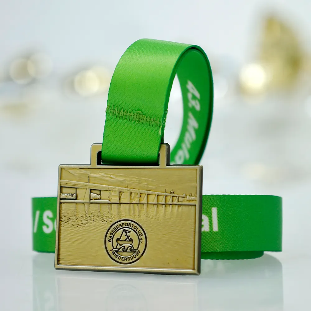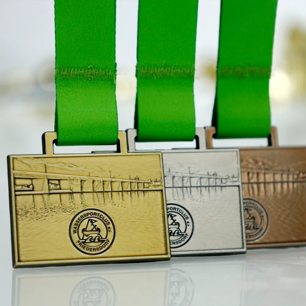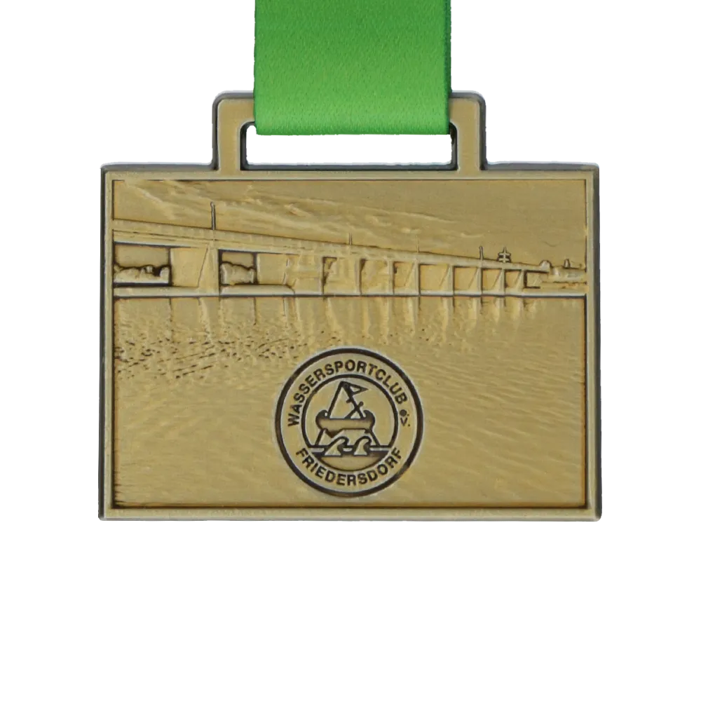 Questa medaglia pressofusa è stata prodotta per il 43° Muldestauseeregatta Schülerpokal. Di forma rettangolare e rifinita in oro, presenta un dettagliato rilievo di un ponte sul dritto. La sezione inferiore mostra il logo del Wassersportclub Friedersdorf. Progettata per un evento velico, questo tipo di medaglia personalizzata è ideale per le regate.