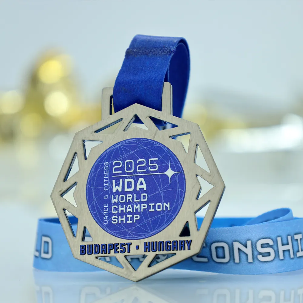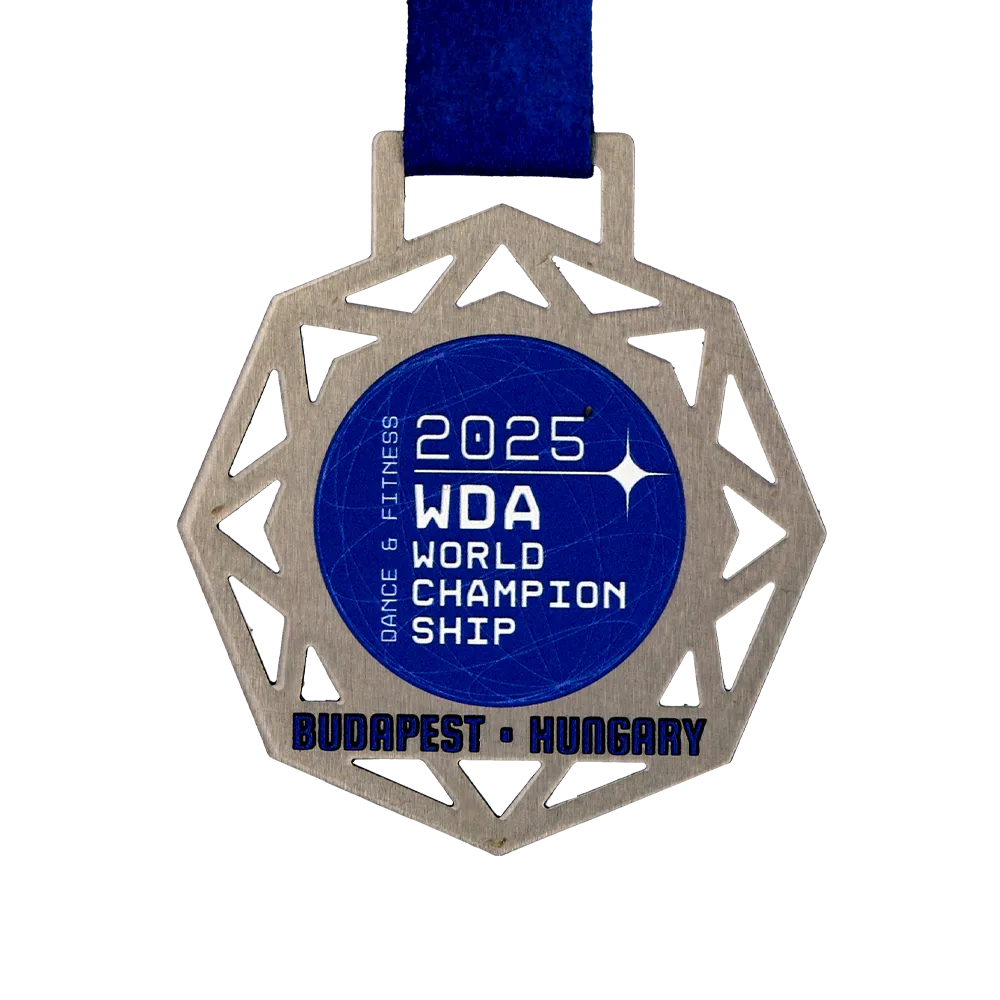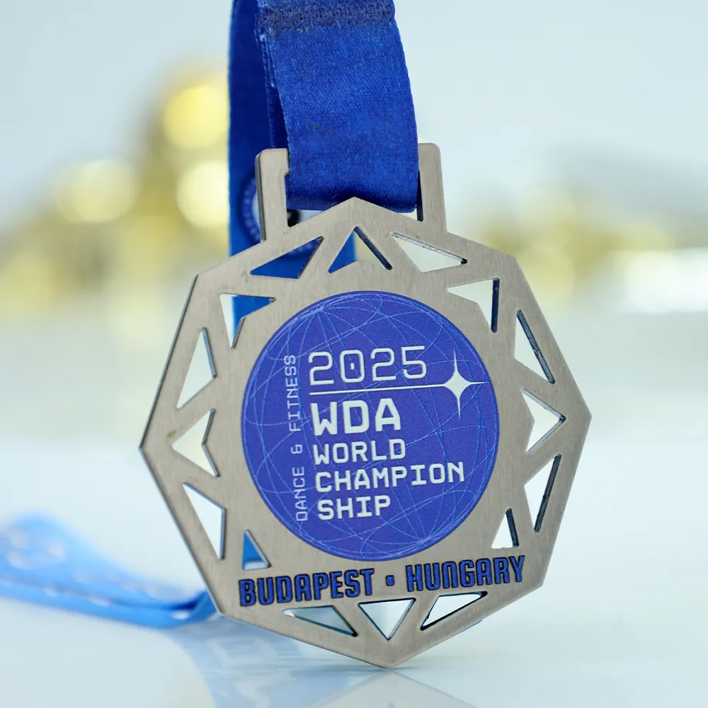 Medaglia su misura progettata per il WDA World Championship 2025 a Budapest. È una medaglia in metallo con una forma geometrica originale realizzata utilizzando il taglio laser. La parte anteriore presenta una grafica blu con il nome, l'anno e la località dell'evento. Tutte le decorazioni e le iscrizioni sono ottenute attraverso una stampa UV durevole.