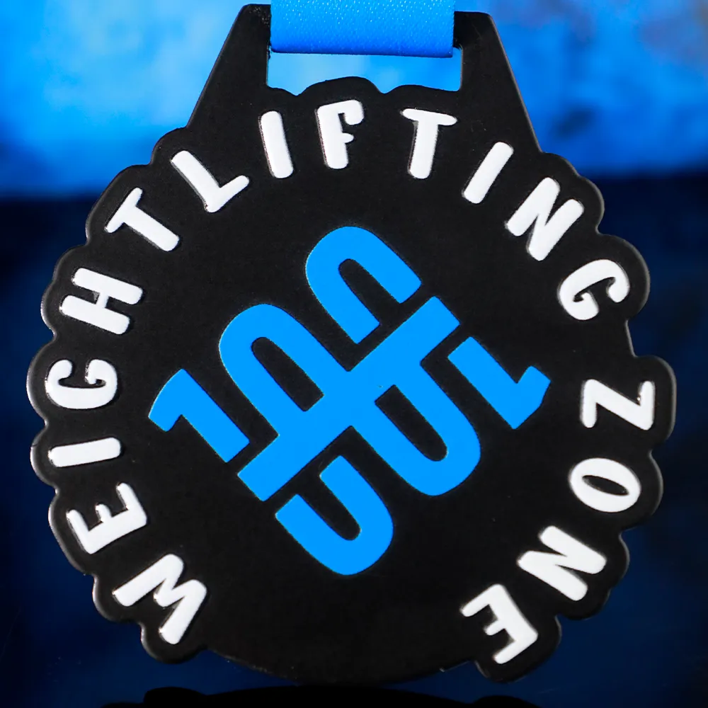 Presentiamo la medaglia per la Weightlifting Zone, creata appositamente per gli appassionati di sollevamento pesi. La medaglia è in un elegante colore nero con testo bianco e un logo blu realizzato con stampa UV. È rotonda con ritagli sui bordi, conferendole un aspetto moderno.