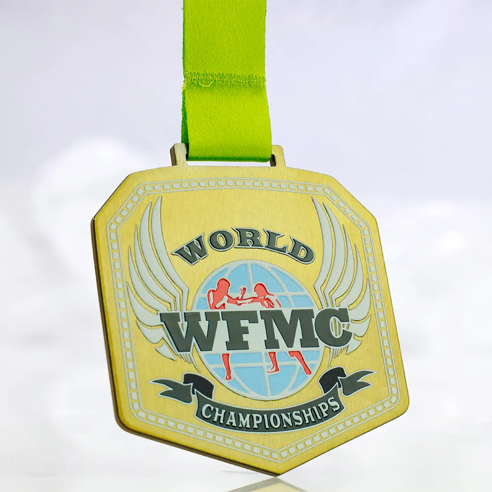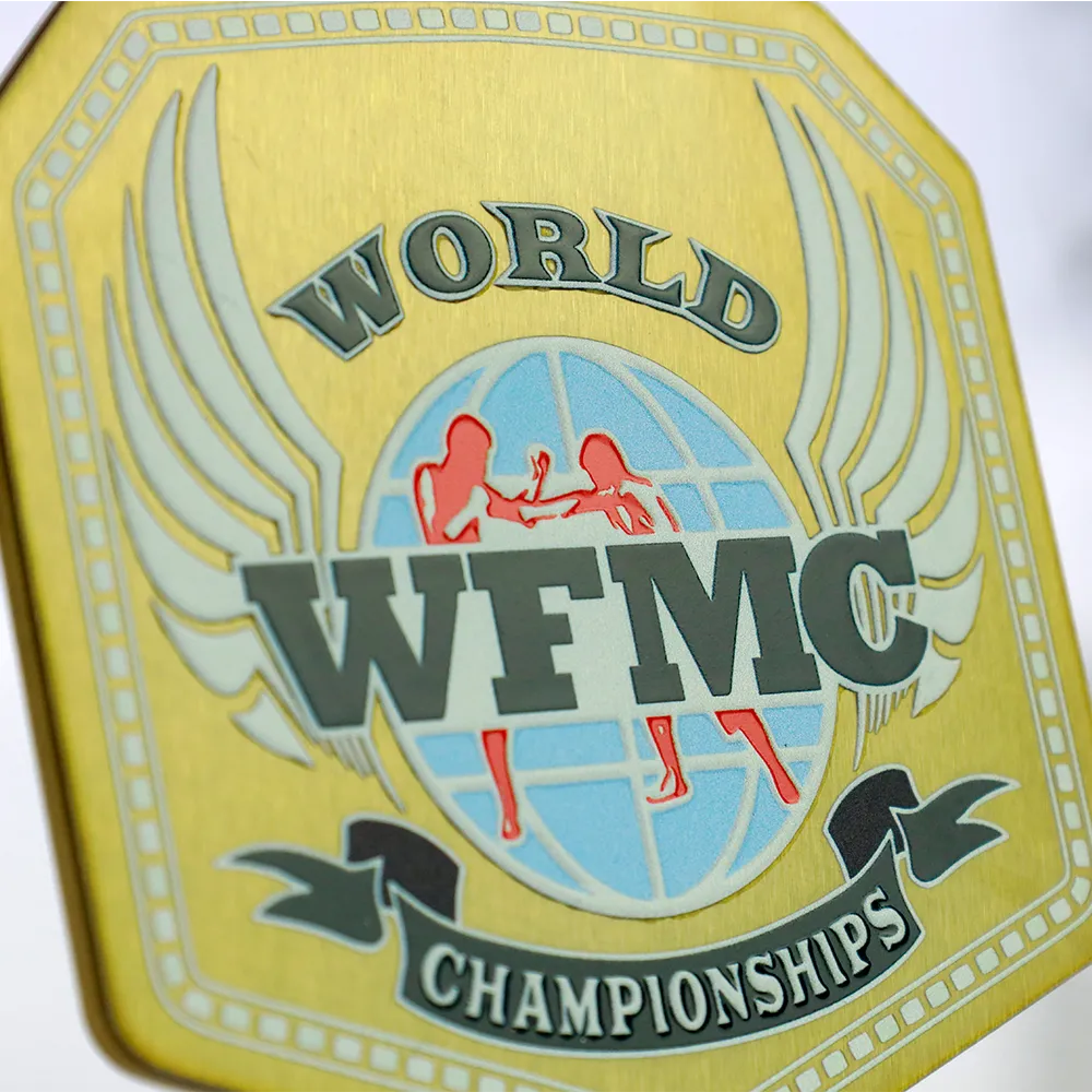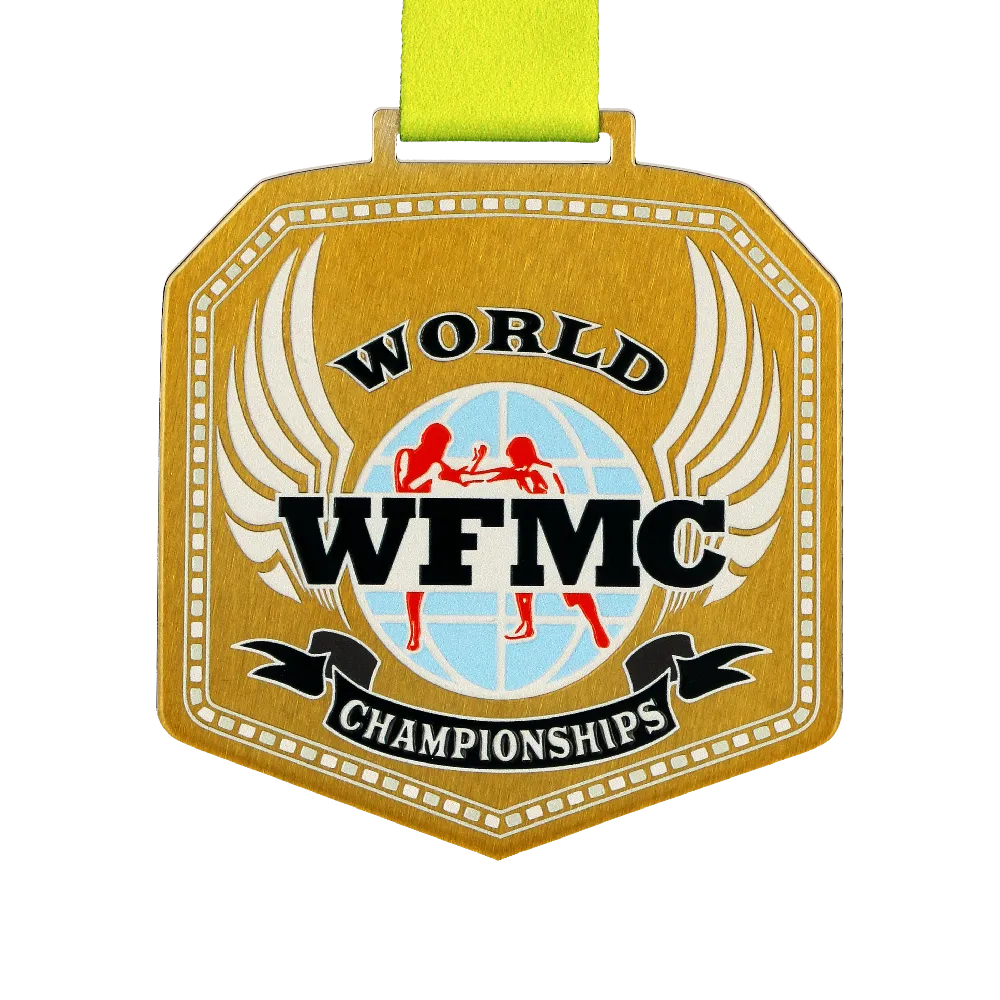 Una medaglia per gli sport da combattimento ai Campionati Mondiali WFMC 2023. La medaglia ha una forma esagonale con un colore oro. La parte centrale presenta il logo WFMC circondato da ali, applicato con stampa UV.