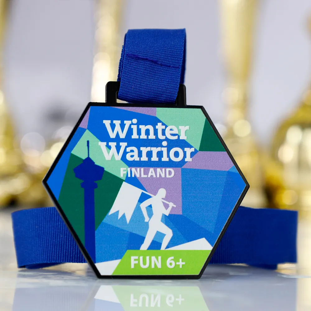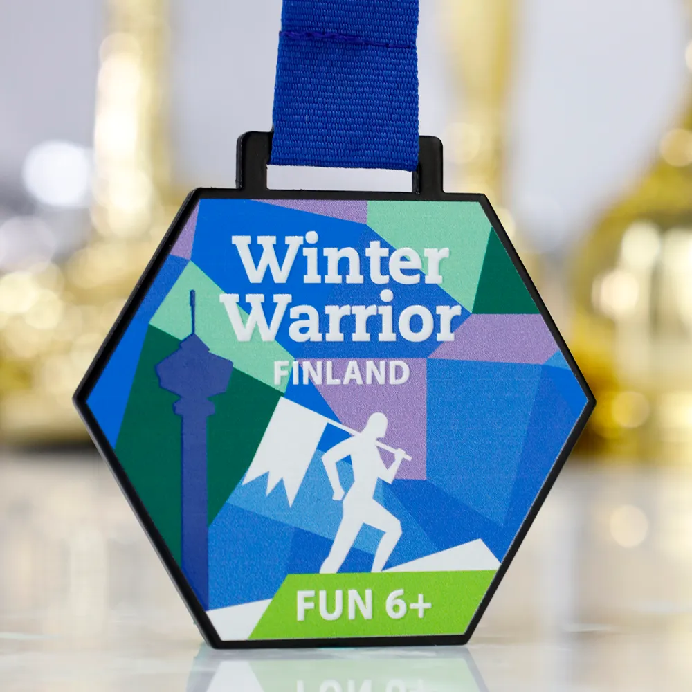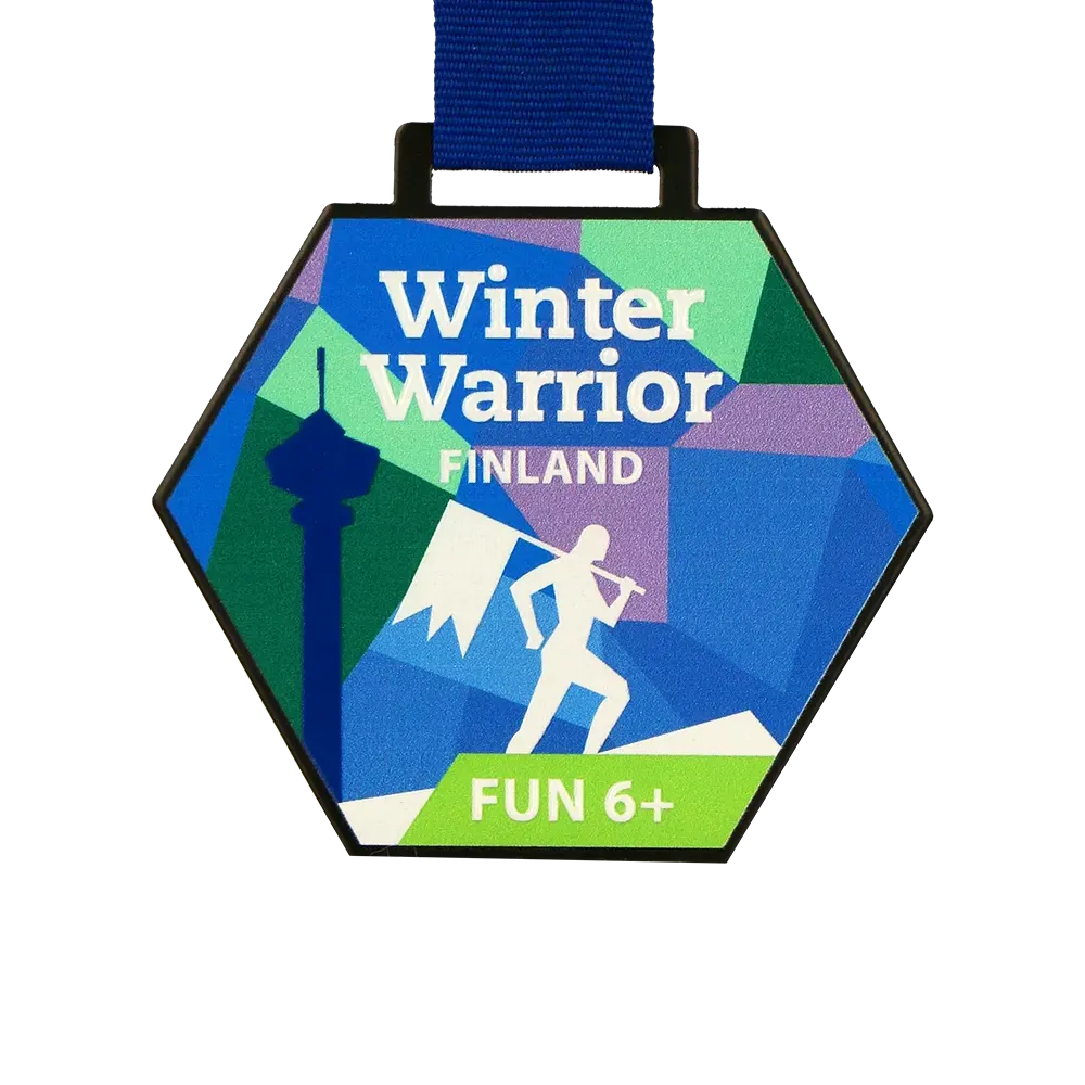 Una medaglia per competizioni OCR creata per Winter Warrior Finland, un evento di corsa estrema. La medaglia ha una forma esagonale tagliata al laser con stampa UV nelle tonalità di blu, verde e viola. La grafica raffigura una figura di guerriero con una bandiera e una torre di avvistamento, a simboleggiare la località dell'evento. La chiara iscrizione "FUN 6+" enfatizza la categoria della corsa. La medaglia è appesa a un nastro blu che corrisponde ai colori del design.