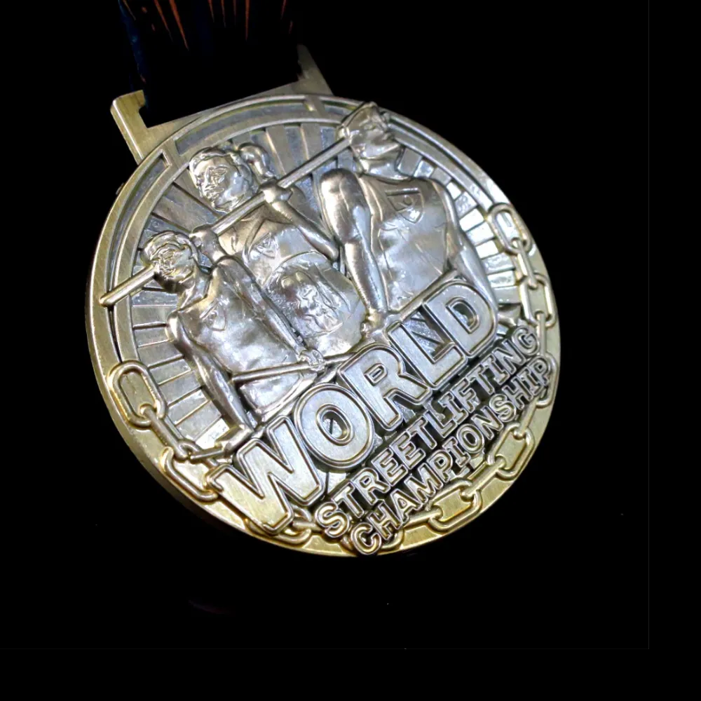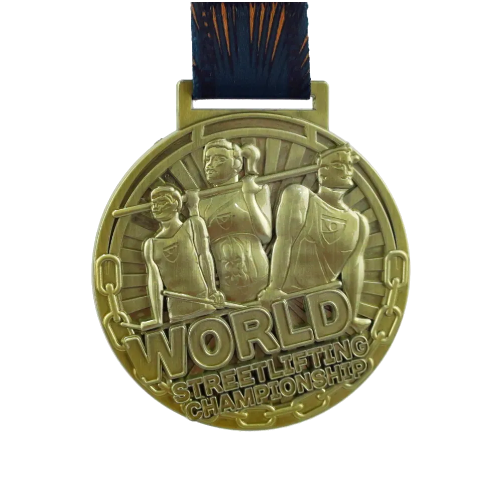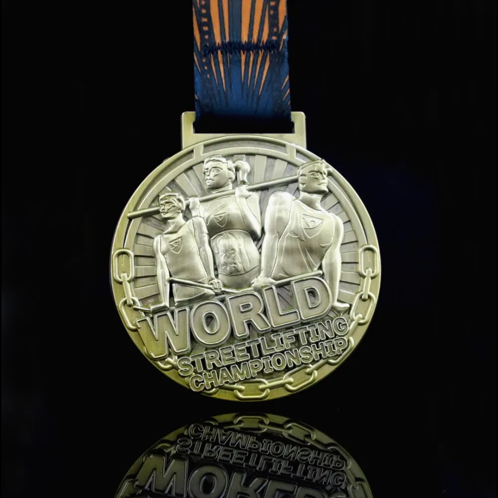 Le medaglie non solo svolgono la funzione di ricompensa per il vincitore, ma agiscono anche come un biglietto da visita. Grazie ad esse l’evento in cui vengono premiate può distinguersi dagli altri. In WinMed prepariamo medaglie uniche per eventi sportivi ogni giorno. Una di queste è indubbiamente una medaglia in fusione realizzata per il World Streetlifting Championship. È stata realizzata in una classica forma rotonda e colori dorati caratteristici dei vincitori. La sua tonalità profonda è uno sfondo ideale per numerose decorazioni tridimensionali. Sono state realizzate grazie alla creazione di un progetto individuale e all’uso di una matrice in acciaio che riflette perfettamente anche il più piccolo dettaglio. Il tutto è completato da un nastro personalizzato coerente con la medaglia.