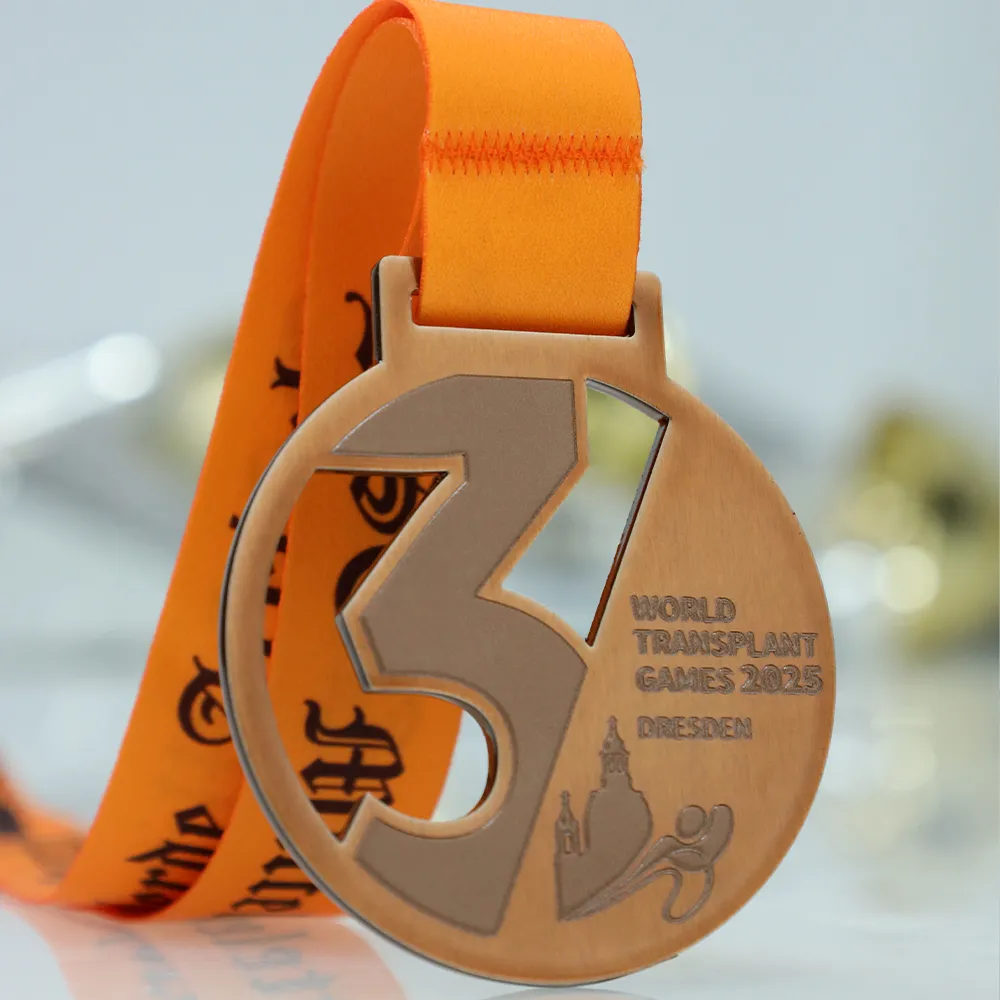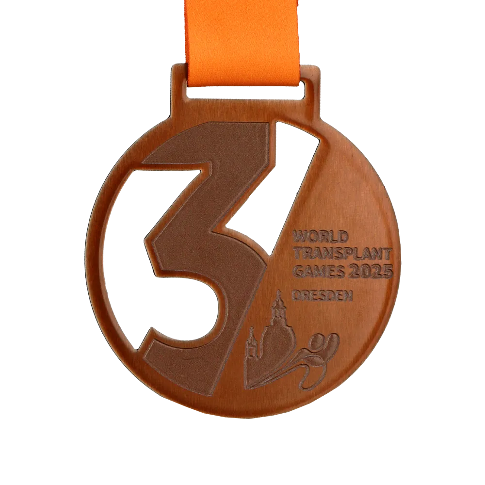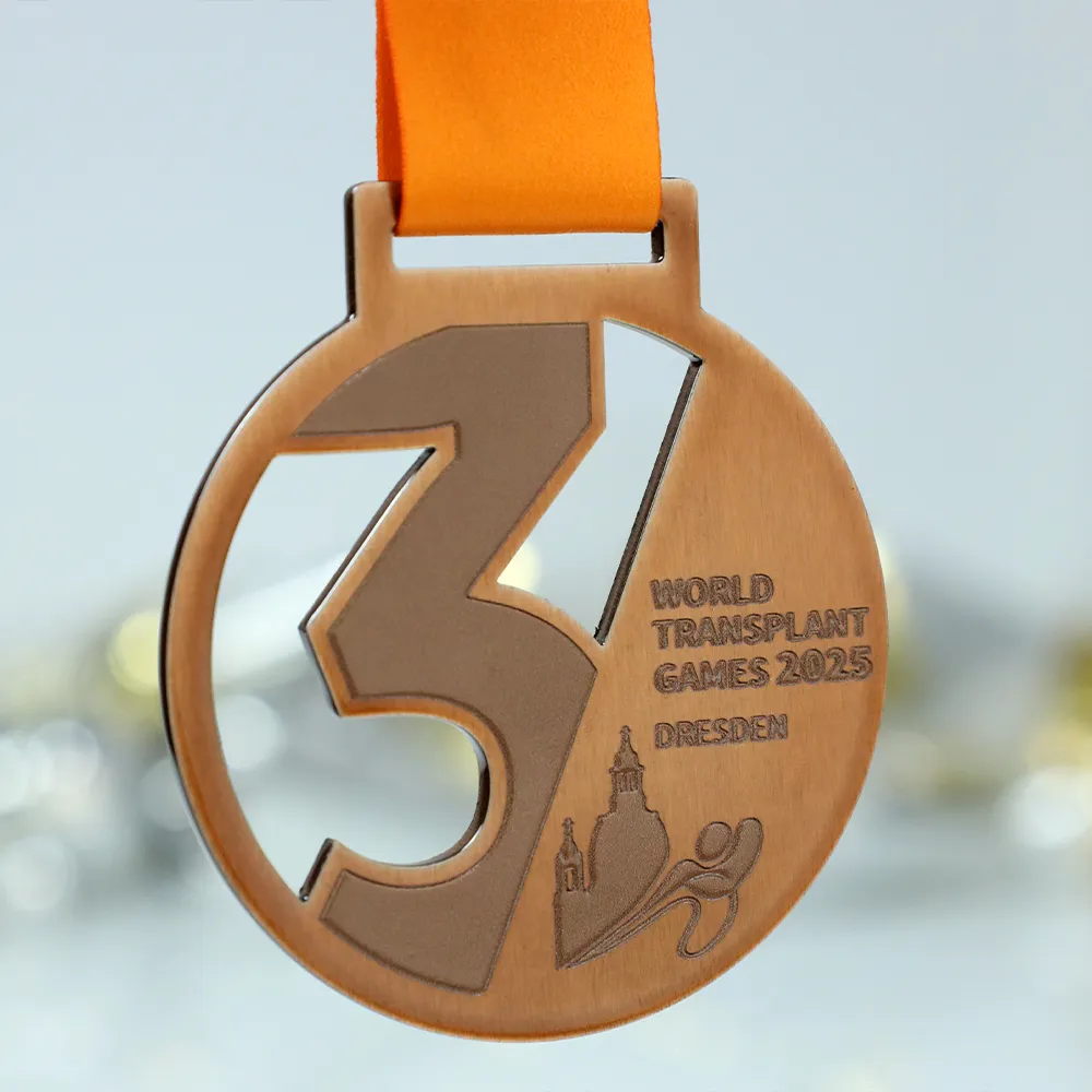 Presentiamo una medaglia personalizzata realizzata appositamente per i World Transplant Games, che unisce la robustezza dell'acciaio a una finitura elegante. La sua caratteristica distintiva è la forma irregolare con il numero della posizione chiaramente esposto, ottenuto grazie alla tecnica del traforo tagliato al laser. La superficie è decorata con una stampa UV durevole, che conferisce alla medaglia un profondo colore ramato e presenta con precisione il logo dell'evento.