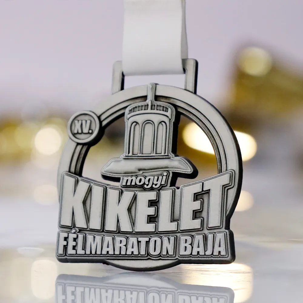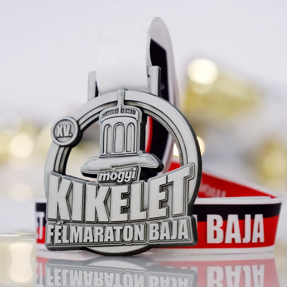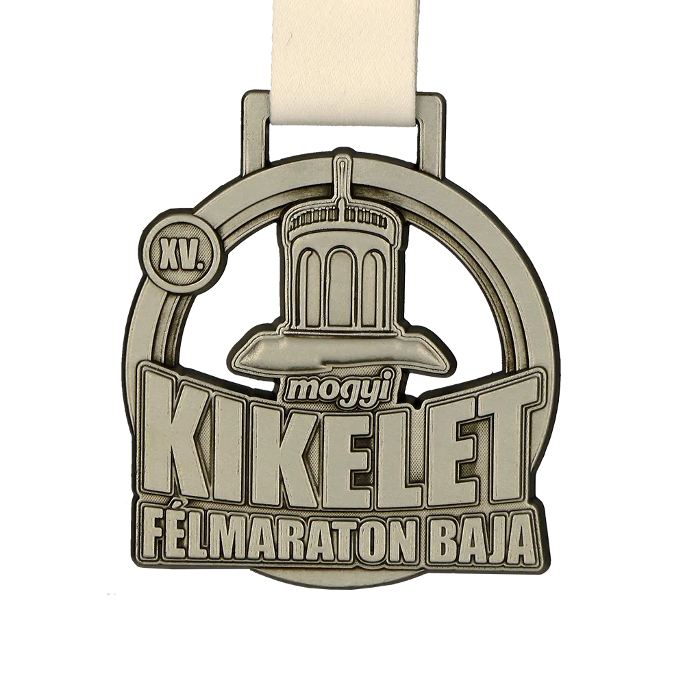 Medaglia su misura creata per la XV. Kikelet Half Marathon Baja. È una medaglia pressofusa 2D. Presenta un edificio distintivo al centro della composizione e un'iscrizione prominente con il nome dell'evento. La medaglia è appesa a un nastro di colore chiaro, abbinato al design complessivo.