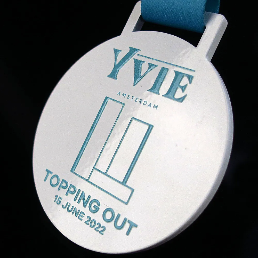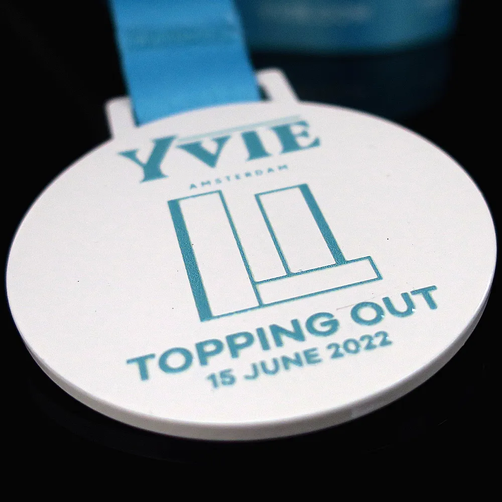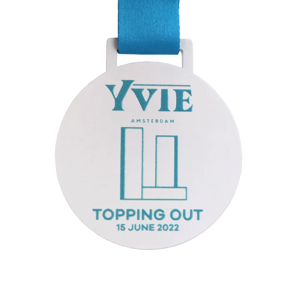 Le medaglie nella loro forma classica hanno solitamente una forma rotonda. Attualmente questa forma è spesso arricchita da decorazioni moderne che rendono tali medaglie diverse da tutte le altre. Un esempio di tale implementazione unica sono le medaglie in acciaio stampato che WinMed ha preparato per YVIE Amsterdam Topping Out nel 2022. Queste eleganti medaglie sono di colore bianco che è lo sfondo perfetto per la stampa. Sulla loro superficie ci sono molte decorazioni impresse in una distinta tonalità di blu. Inoltre la medaglia è coronata da un nastro a sublimazione abbinato al design del premio.