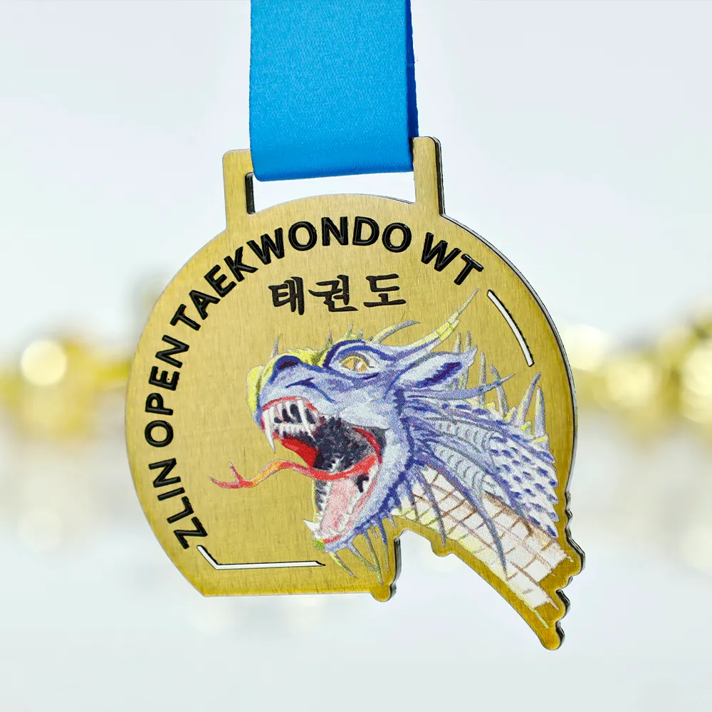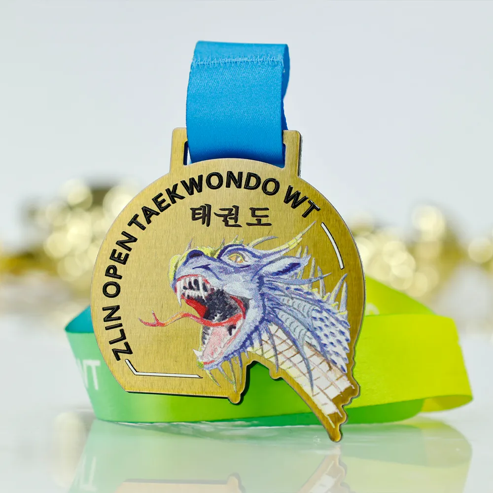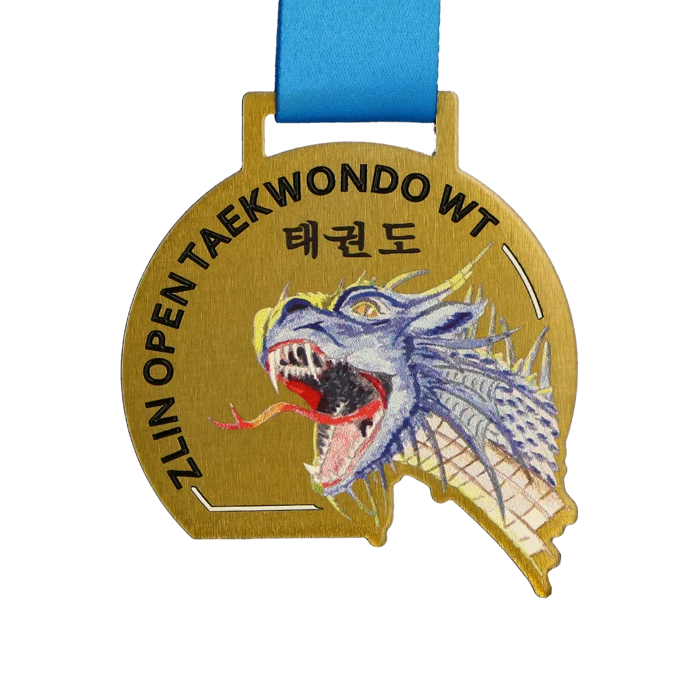 Medaglia su misura creata per il torneo di Taekwondo Zlin Open. Realizzata in metallo, con una sorprendente immagine di drago stampata a colori utilizzando la tecnologia UV.