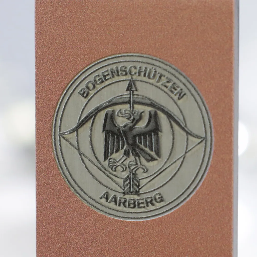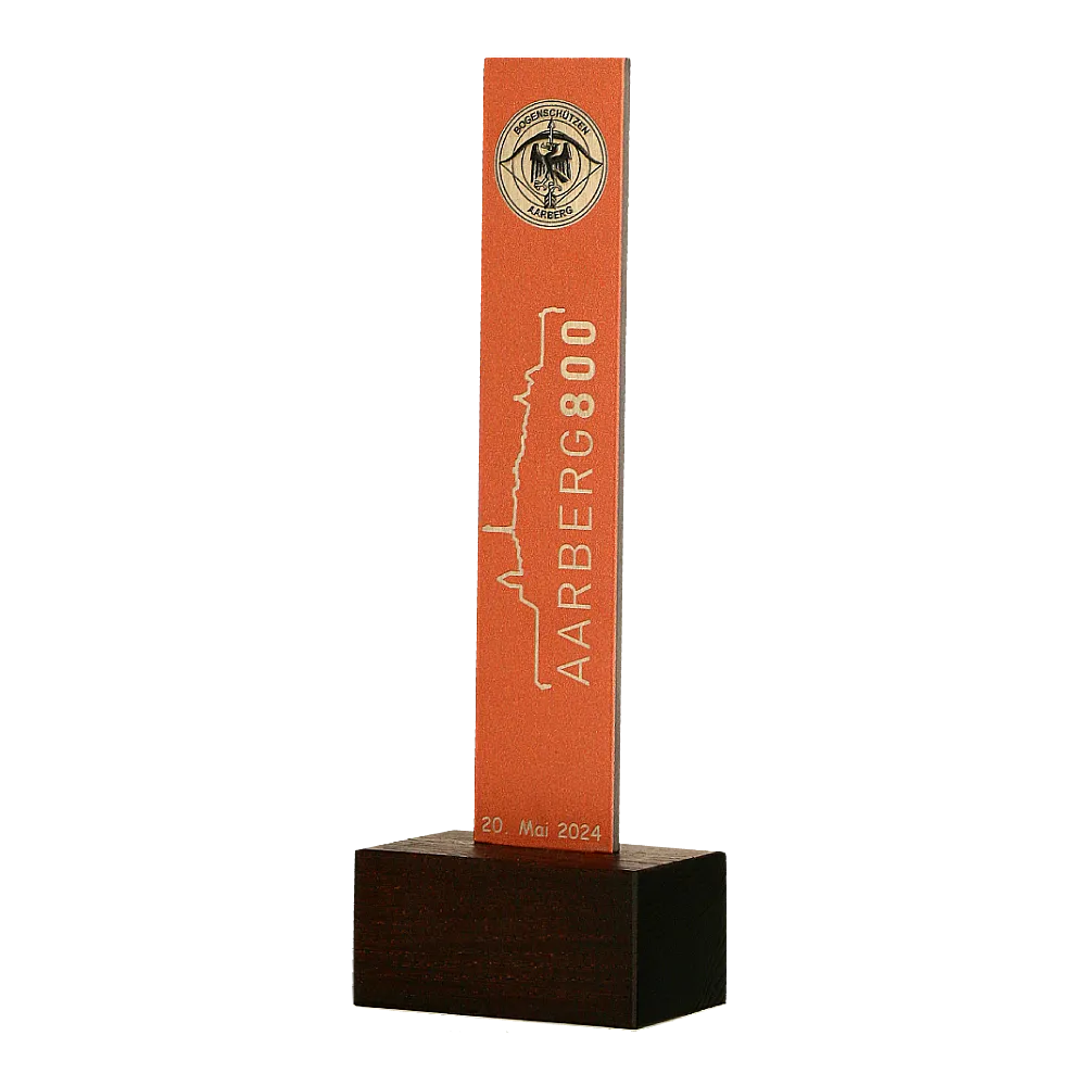Un premio su misura progettato per la competizione di tiro con l'arco Aarberg800. Il trofeo presenta un design moderno e minimalista, realizzato in solido metallo con un'elegante finitura in rame. Il premio è posizionato su una massiccia base in marmo, garantendo stabilità e aggiungendo un carattere raffinato all'insieme.