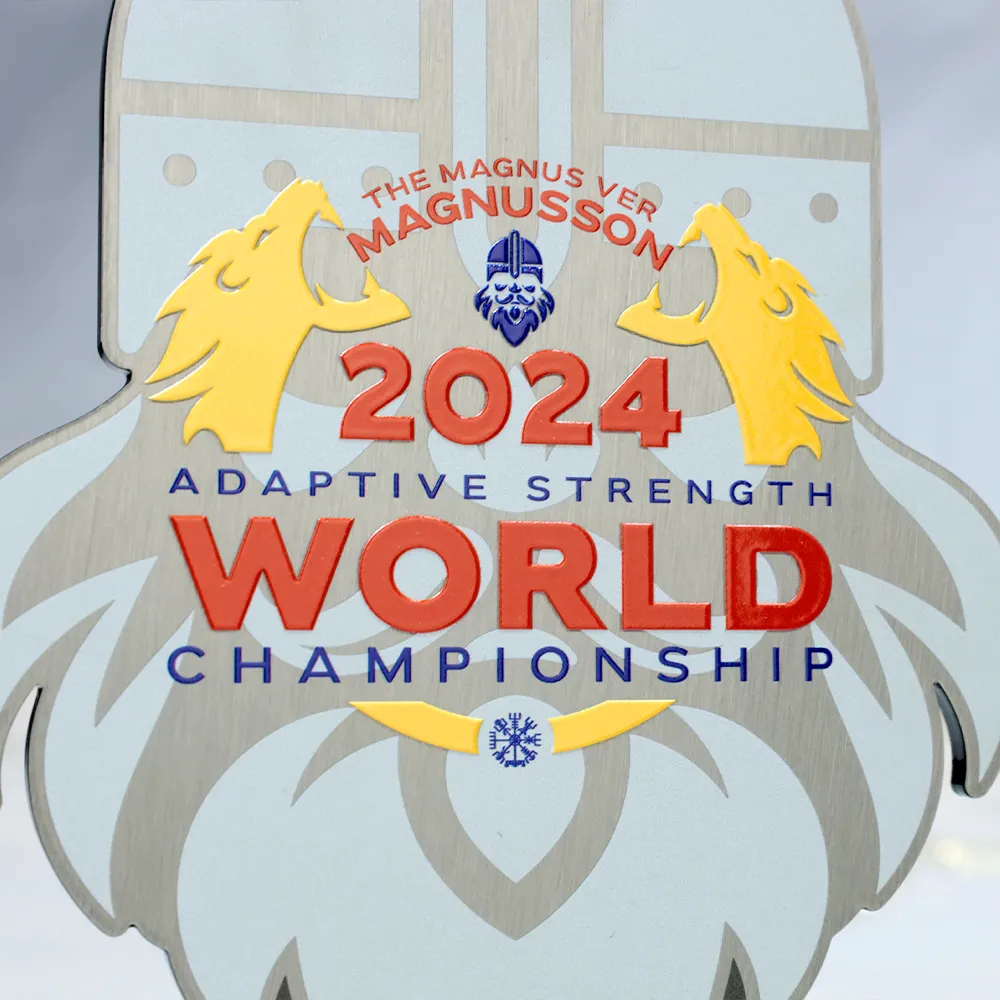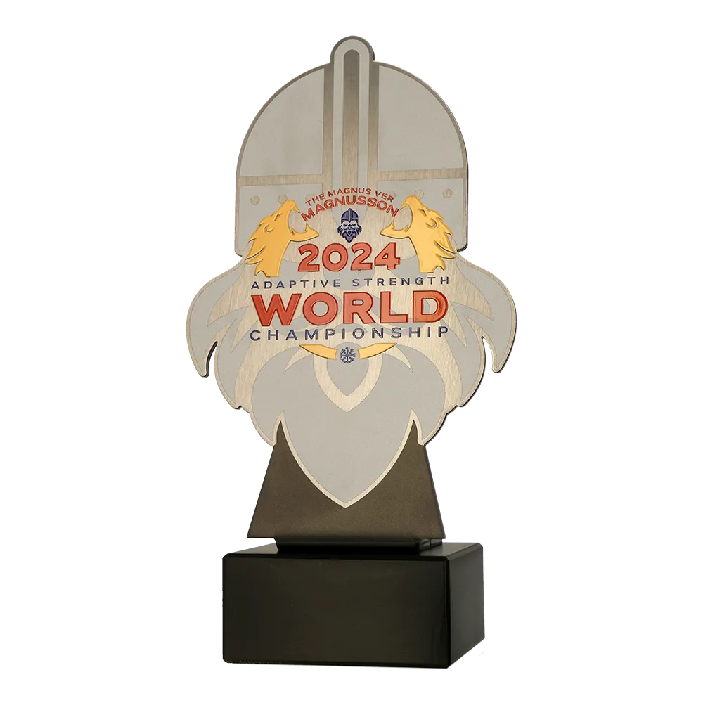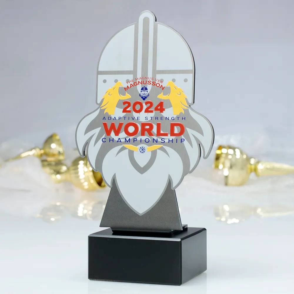 Un premio personalizzato progettato per i Campionati Mondiali di Adaptive Strength 2024. La forma dell'elmo tagliata al laser nel metallo simboleggia forza e resilienza. Montato su un'elegante base in marmo, funge da onorificenza solida e prestigiosa. La personalizzazione include il nome della competizione, il logo e l'anno dell'evento.