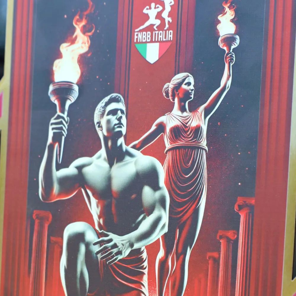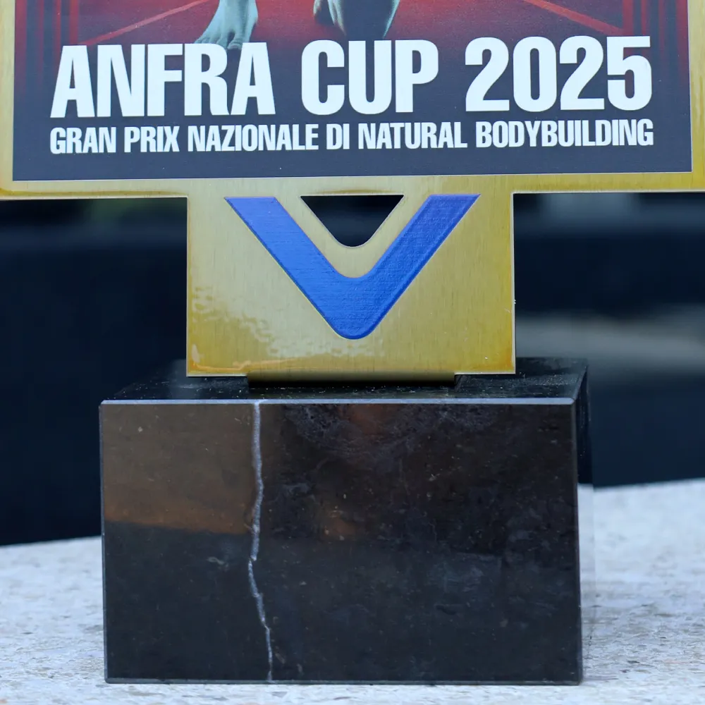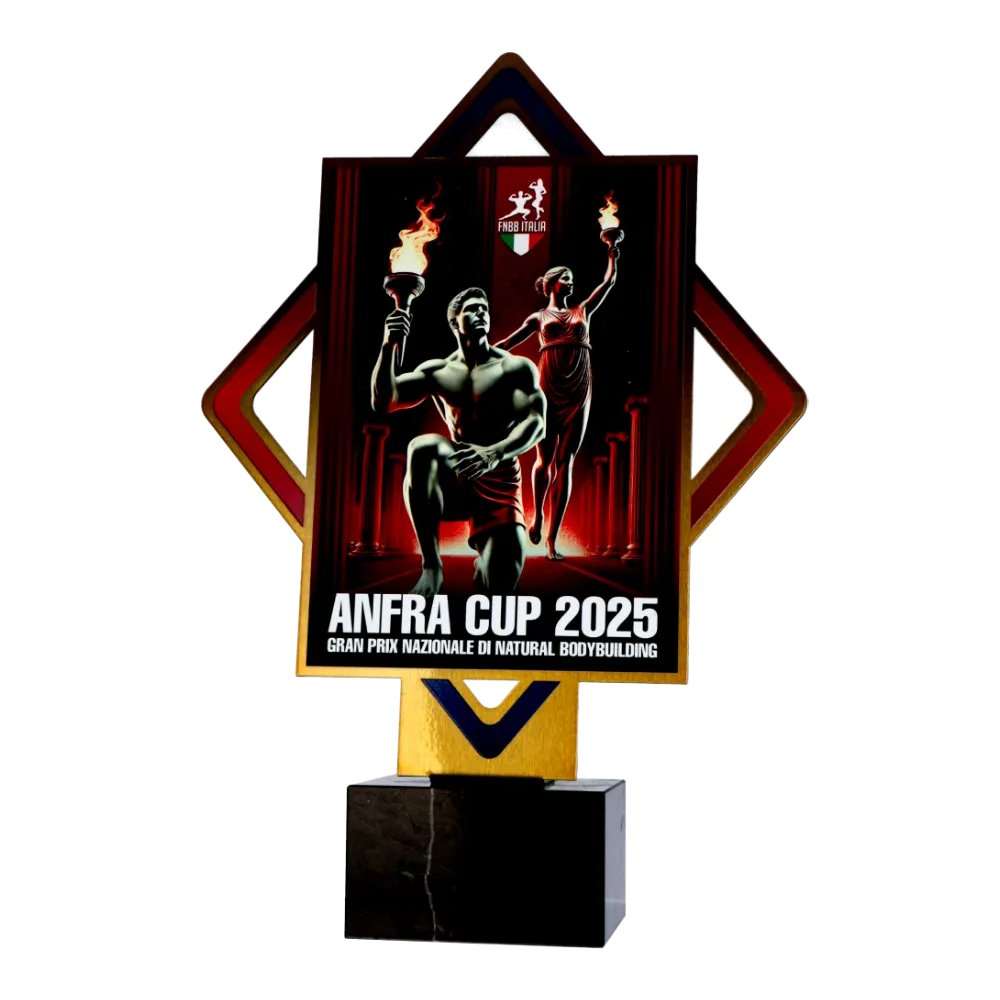 Un trofeo in metallo preparato per il torneo ANFRA CUP 2025 Gran Prix Nazionale di Natural Bodybuilding. Al centro, c'è una grafica colorata con atleti e torce su uno sfondo di colonne – un simbolo di forza e bellezza classica. Il tutto è circondato da una cornice decorativa e colorata. Il trofeo poggia su una solida base in marmo.