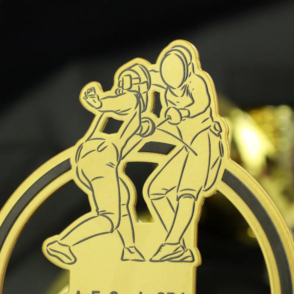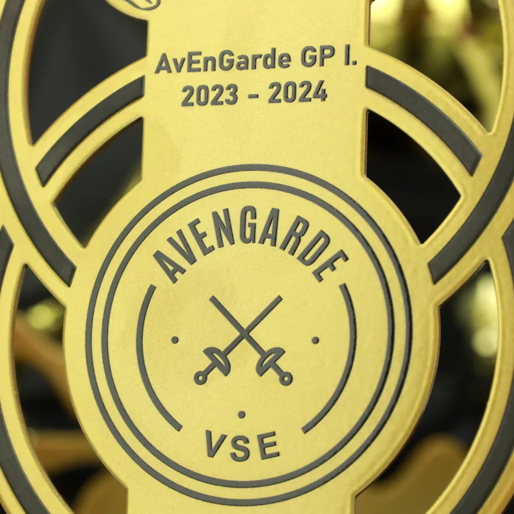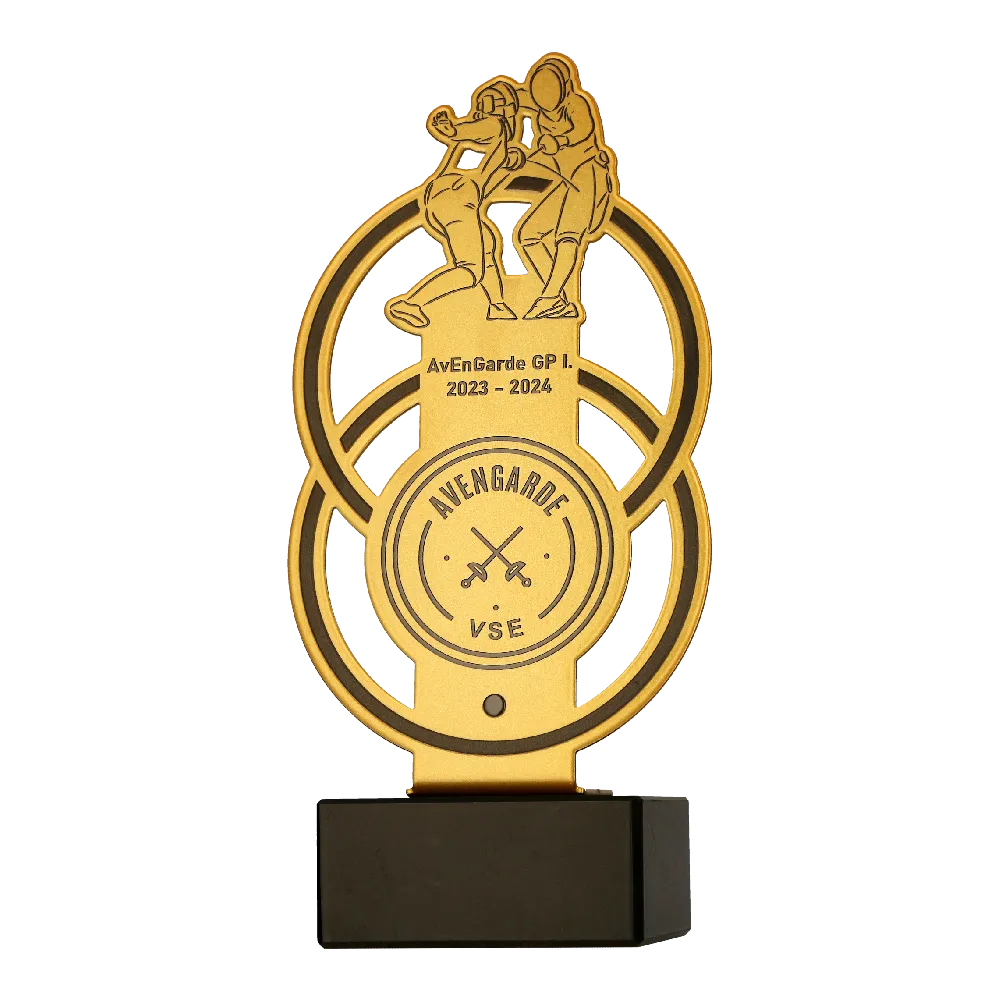 Un trofeo sportivo creato per Avengarde VSE 2023 mostra due schermidori in azione, tagliati al laser nel metallo. L'intero pezzo poggia su una base in marmo nero.