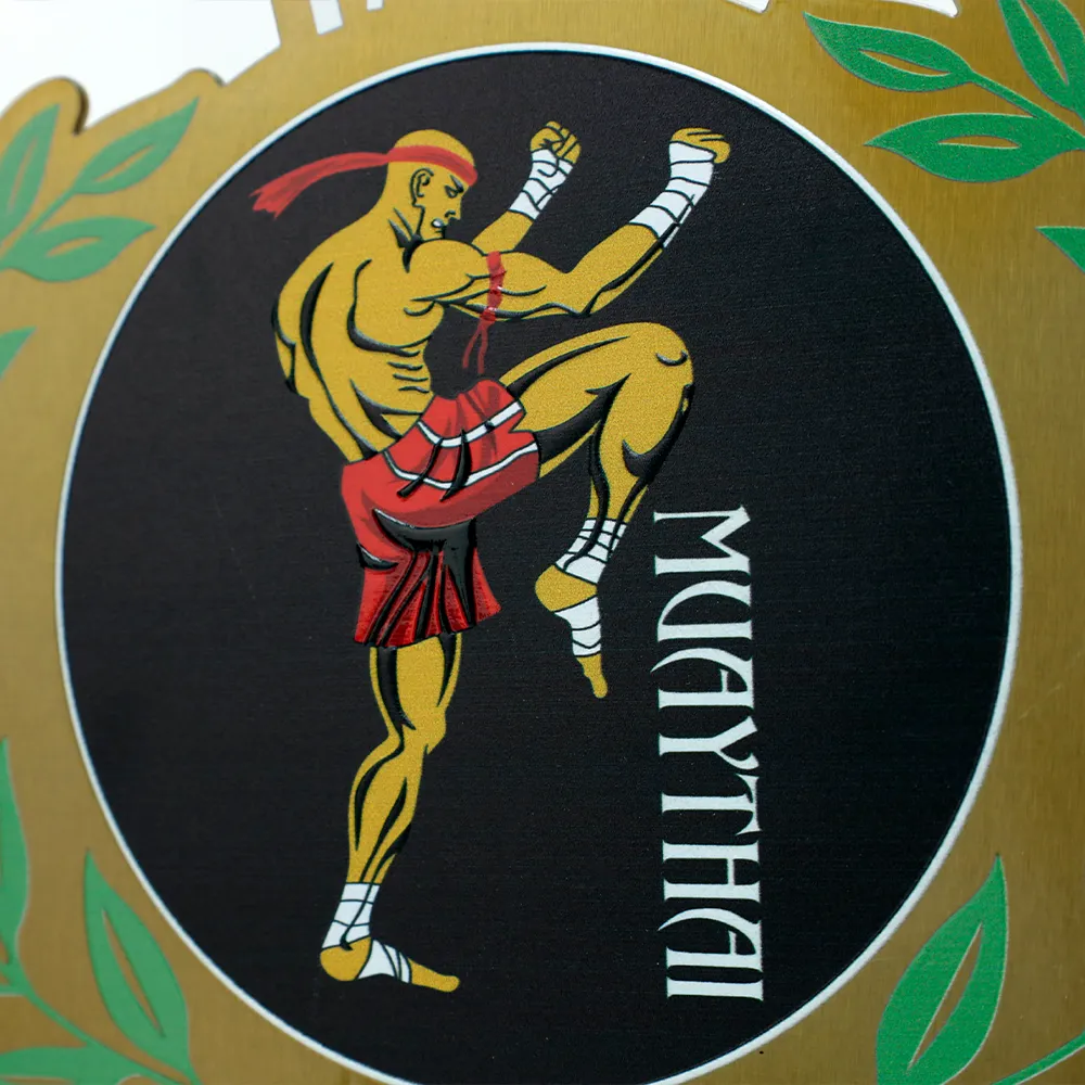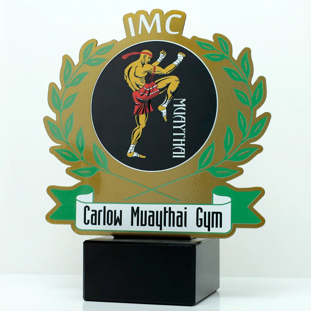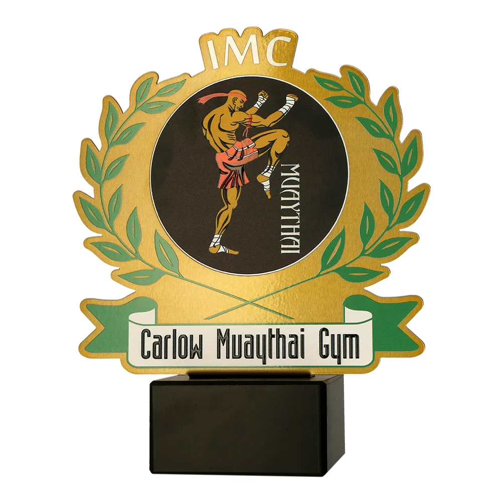 Trofeo arti marziali progettato specificamente per gli eventi organizzati da "Carlow Muaythai Gym". Presenta un pannello rotondo dorato con un'immagine tagliata al laser di un combattente di Muay Thai circondato da una corona d'alloro verde. In basso, c'è un'iscrizione personalizzata con il nome dell'organizzazione, aggiungendo un tocco unico al premio. La base in marmo offre stabilità ed eleganza.