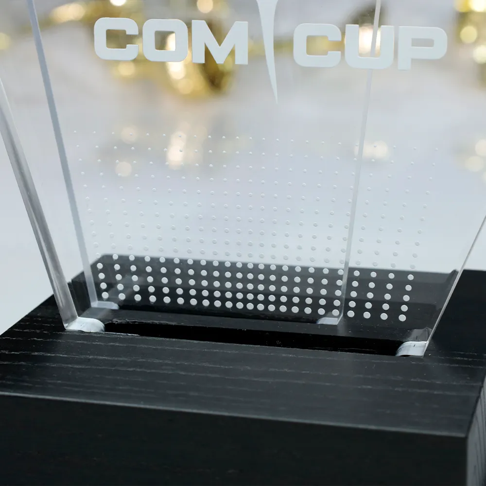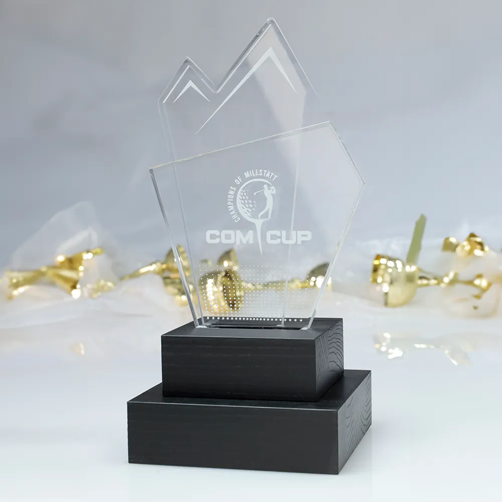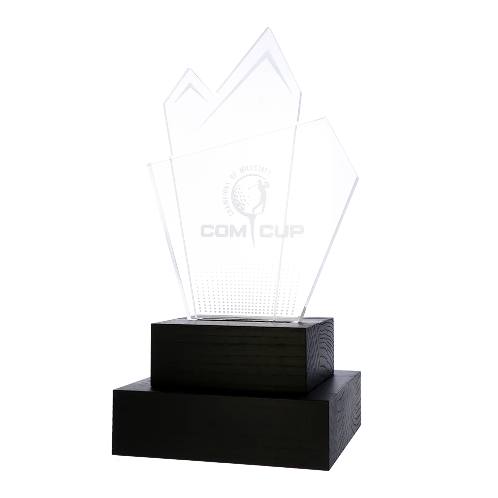 Un trofeo di golf progettato per la Com Cup. Consiste in una parte superiore in acrilico dalla forma irregolare e una base in legno. Il motivo del golf è stato applicato con precisione sull'acrilico.