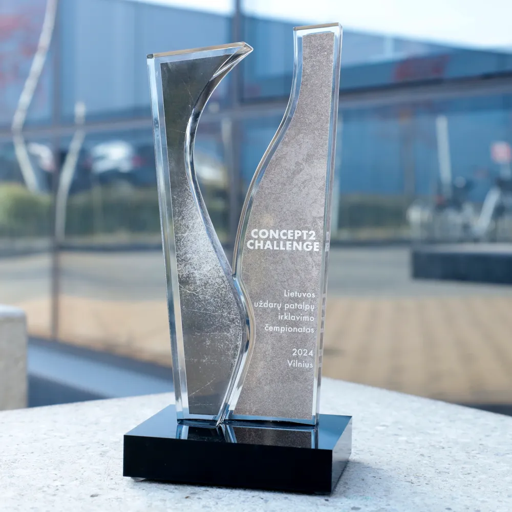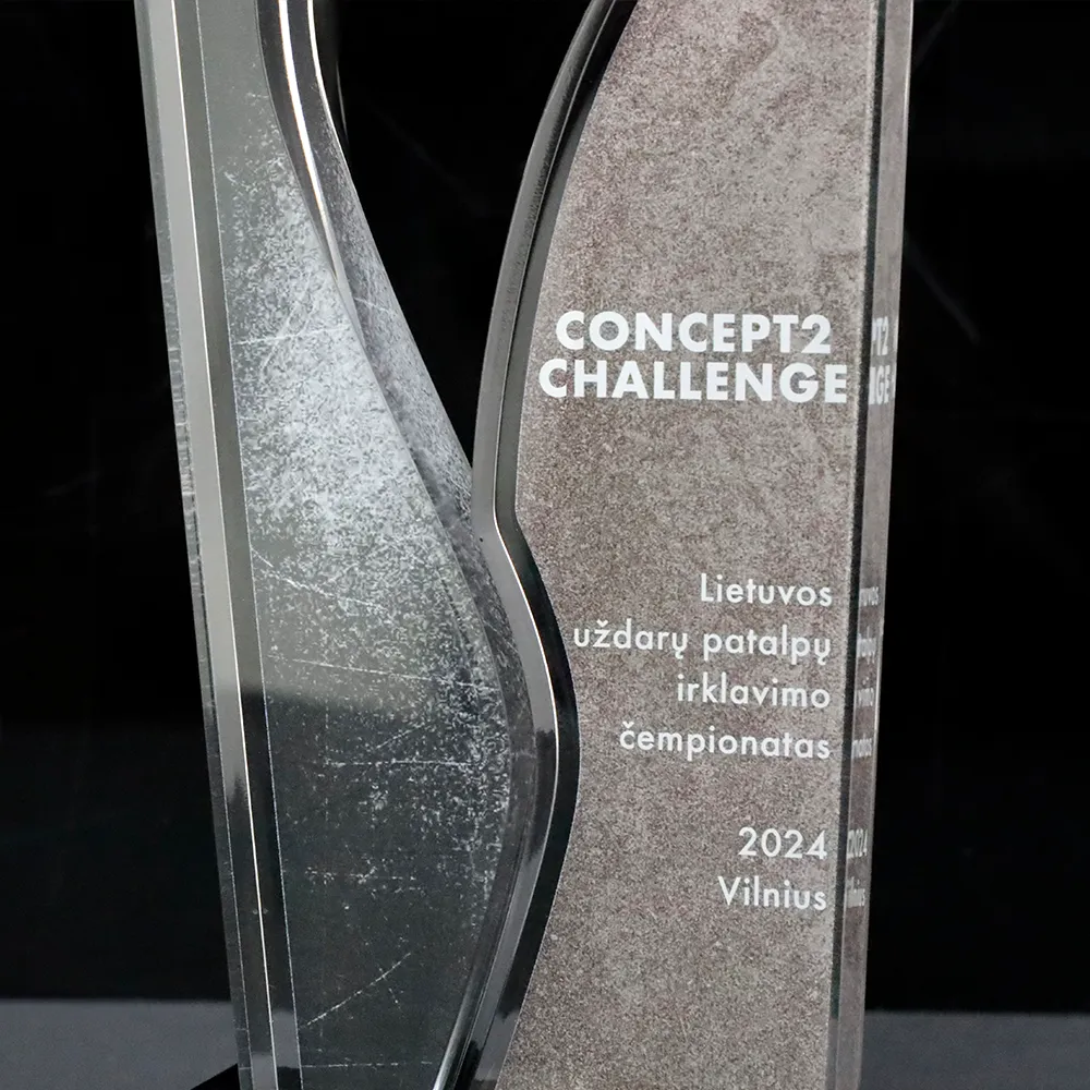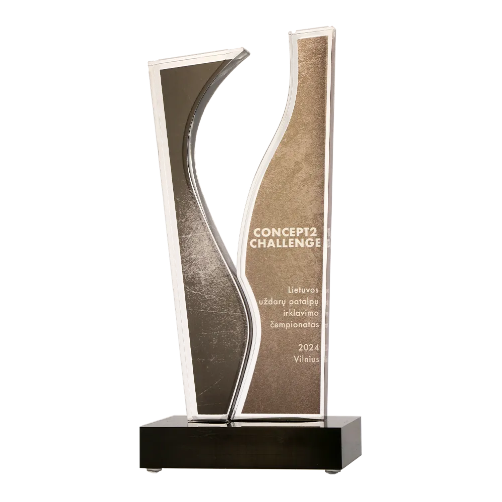 Un trofeo canottaggio in acrilico progettato per i Campionati Lituani di Canottaggio Indoor "Concept2 Challenge 2024" a Vilnius. Il premio ha un design elegante e moderno con due pannelli sottili e curvi. Una parte presenta una finitura metallica, mentre l'altra è adornata con una stampa sottile. L'iscrizione include il nome del campionato e la data, aggiungendo un tocco personale. Moderno e minimalista, questo trofeo trasuda eleganza e classe, riflettendo il prestigio della competizione.