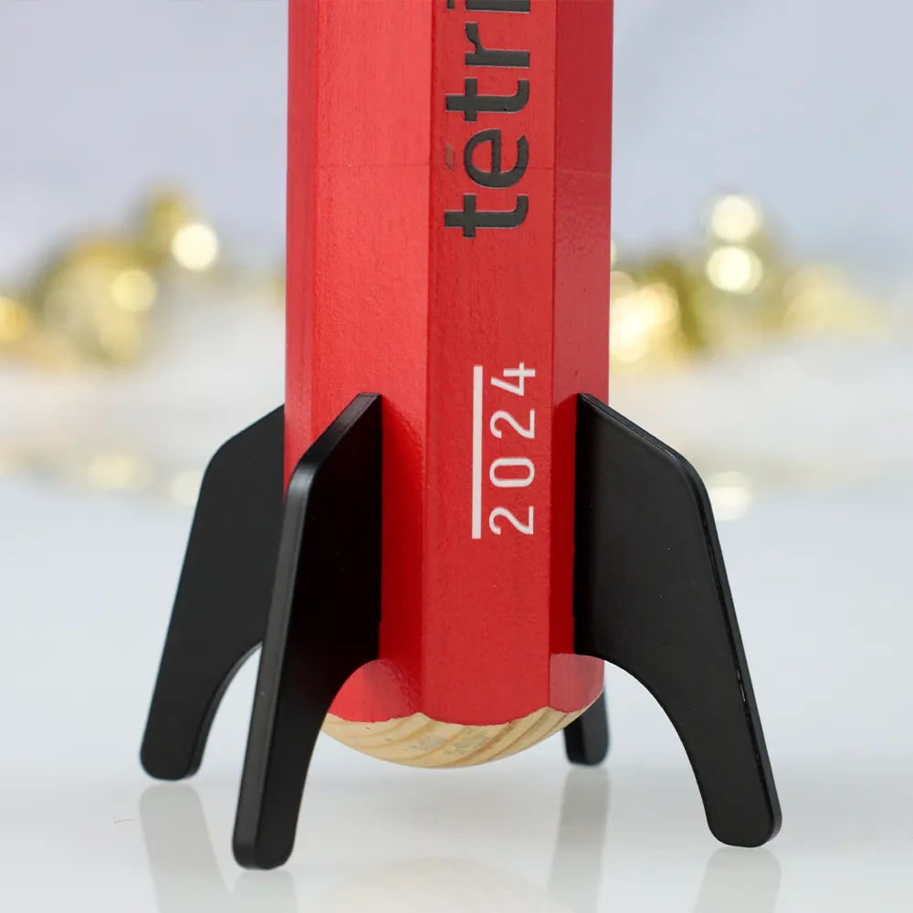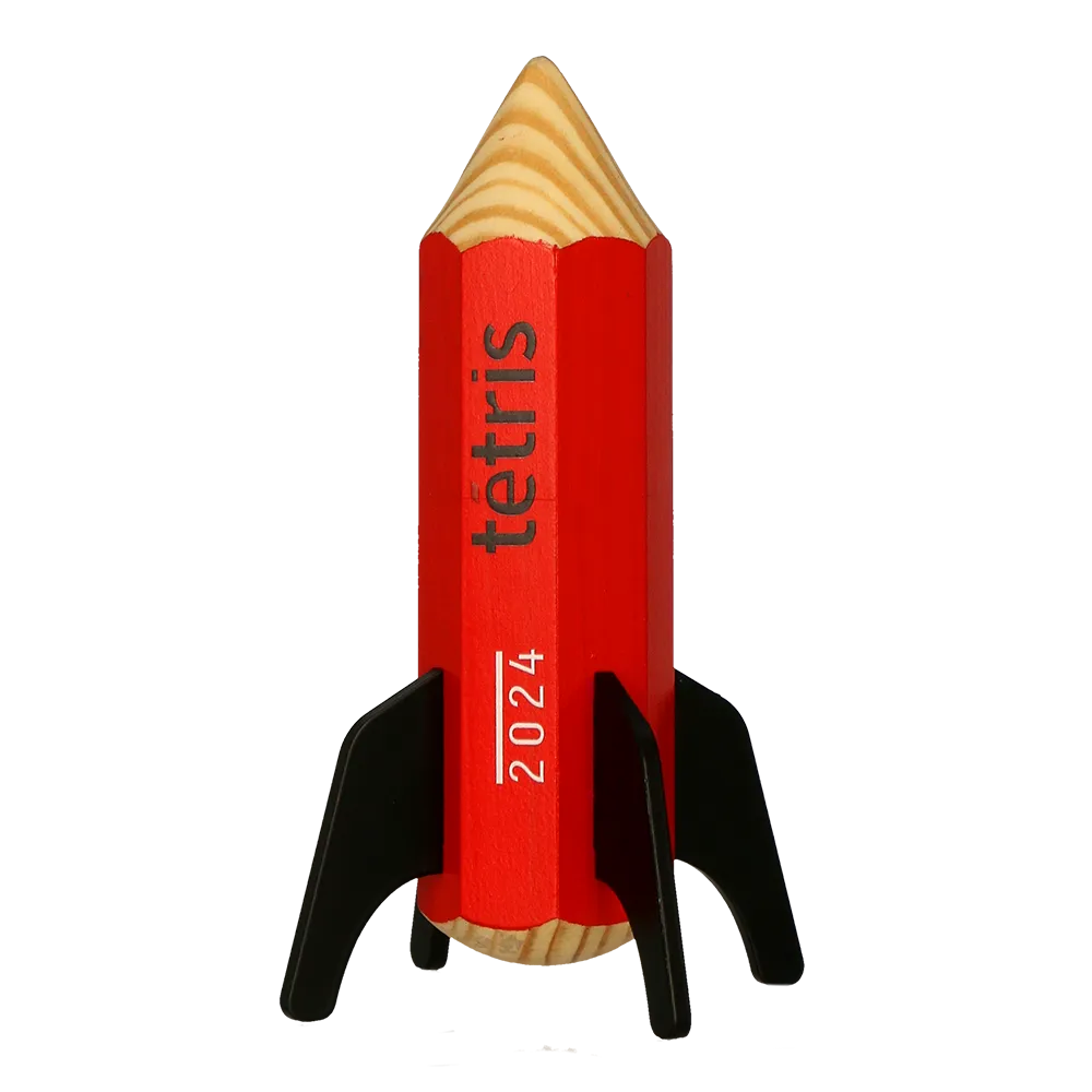 Premio aziendale creato per i risultati nei concorsi creativi organizzati da Tétris nel 2024. Il trofeo ricorda un grande pastello rosso, sottolineando la natura creativa dell'evento. La parte rossa è realizzata in legno, mentre la base in metallo nero funge da supporto, offrendo stabilità e un elegante contrasto. Questo trofeo moderno e unico riflette perfettamente lo spirito di creatività e originalità.