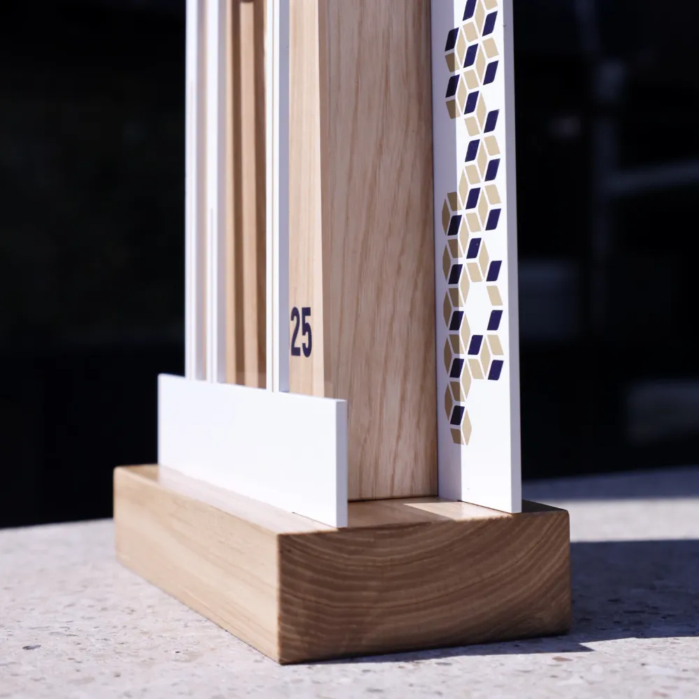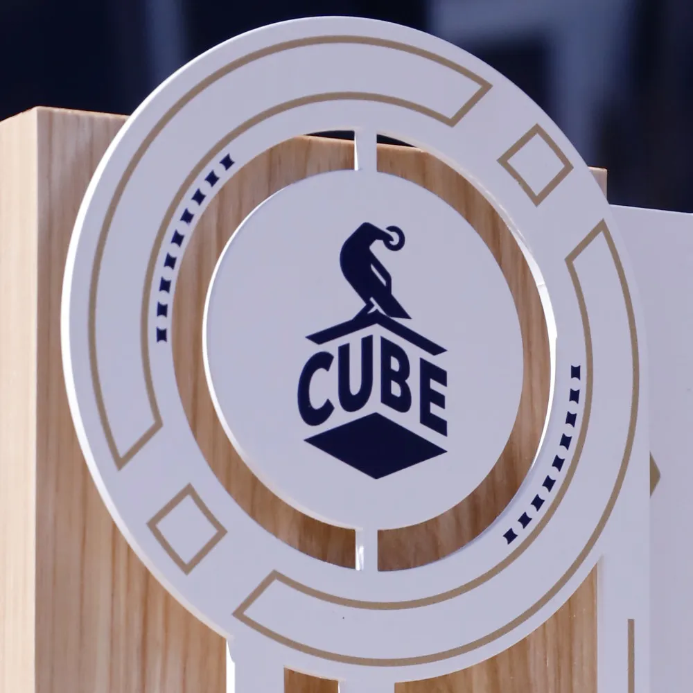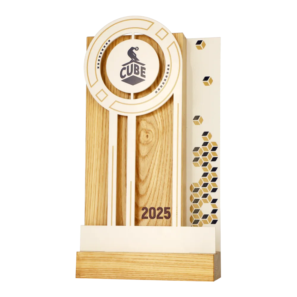 Un premio personalizzato realizzato in legno con elementi in metallo tagliati al laser, progettato per l'evento CUBE 2025. Il trofeo si distingue per il suo aspetto elegante, caratterizzato da una combinazione di colori oro-bianco e motivi geometrici. La parte anteriore mostra il logo CUBE, creato con stampa UV per una marcatura chiara e durevole.