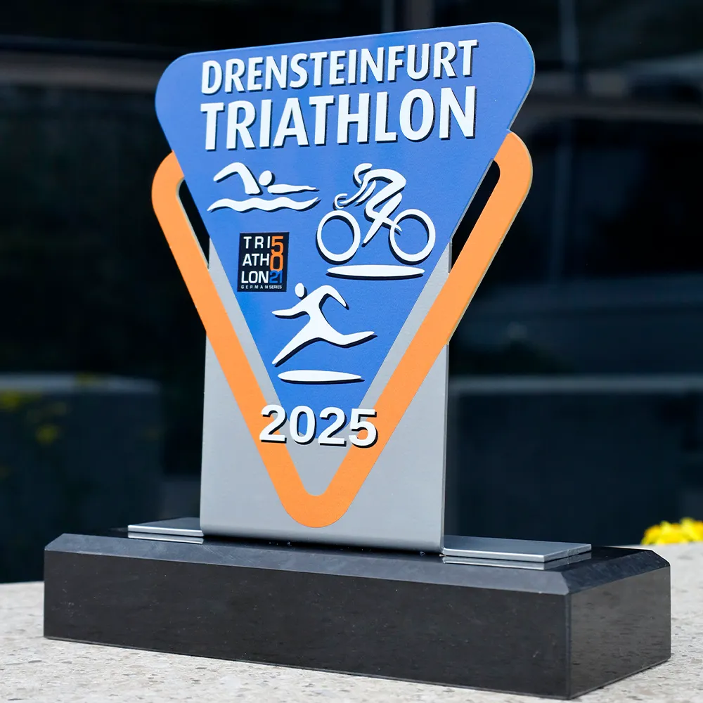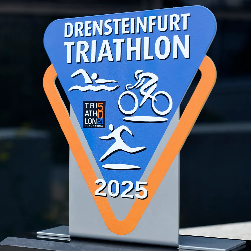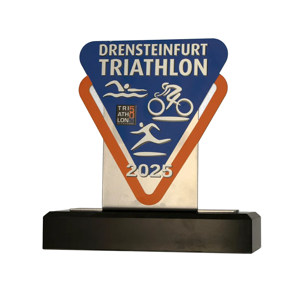 Trofeo realizzato in metallo, posizionato su una base in legno. La forma è stata tagliata al laser e gli elementi colorati e le iscrizioni sono stati applicati utilizzando la stampa UV. Il design triangolare mostra i simboli del nuoto, del ciclismo e della corsa, riflettendo il carattere dell'evento. Questo trofeo sportivo è stato preparato per una competizione di triathlon.