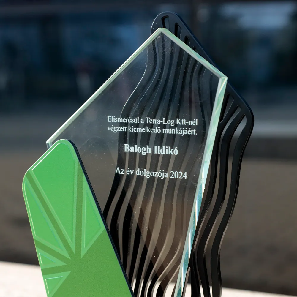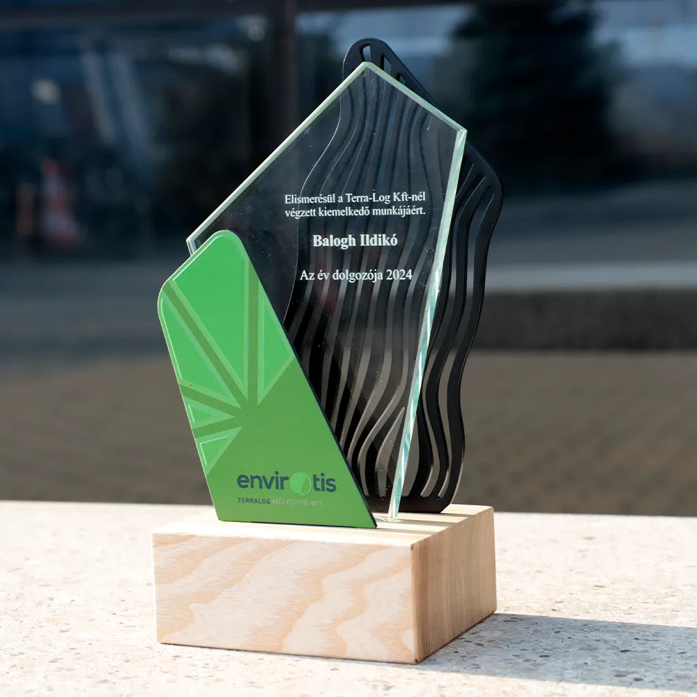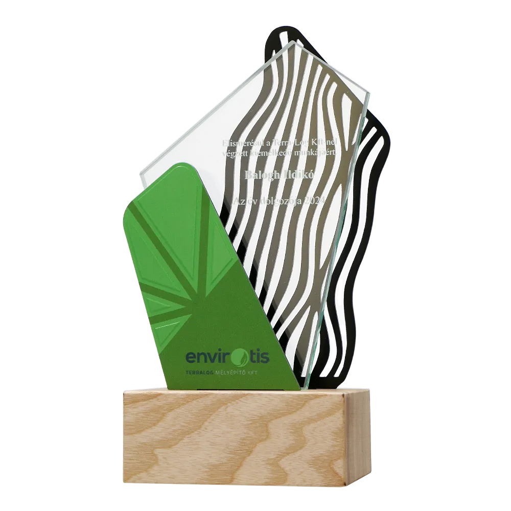 Premio aziendale progettato come riconoscimento per risultati eccezionali nella protezione ambientale e nello sviluppo sostenibile, assegnato da Envirotis. Il trofeo è realizzato con tre materiali primari: legno massello, metallo e vetro. L'incisione laser sulla sezione in vetro sottolinea il prestigio del premio, mentre gli accenti in metallo aggiungono modernità e durata.