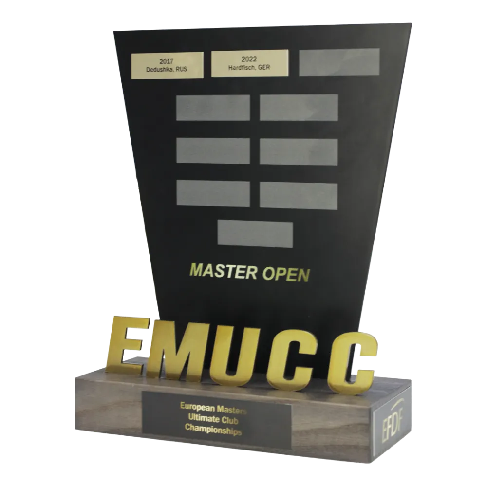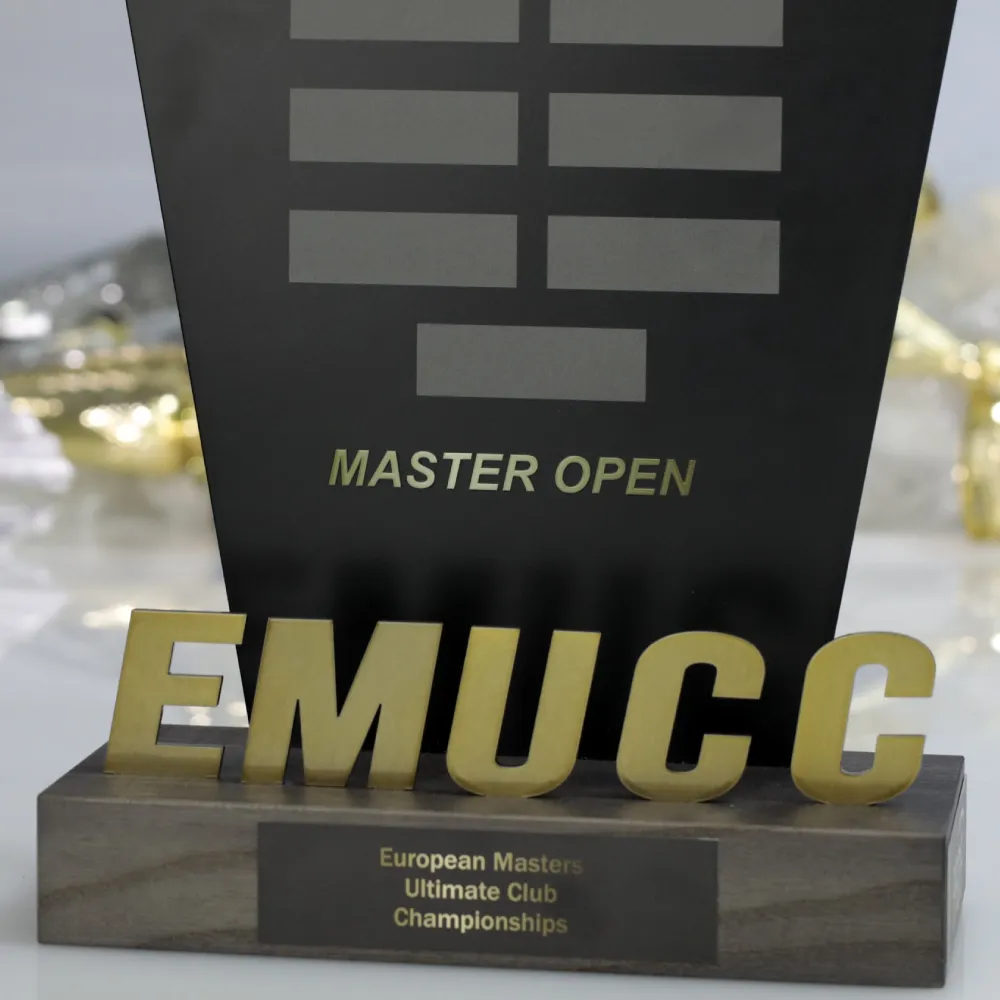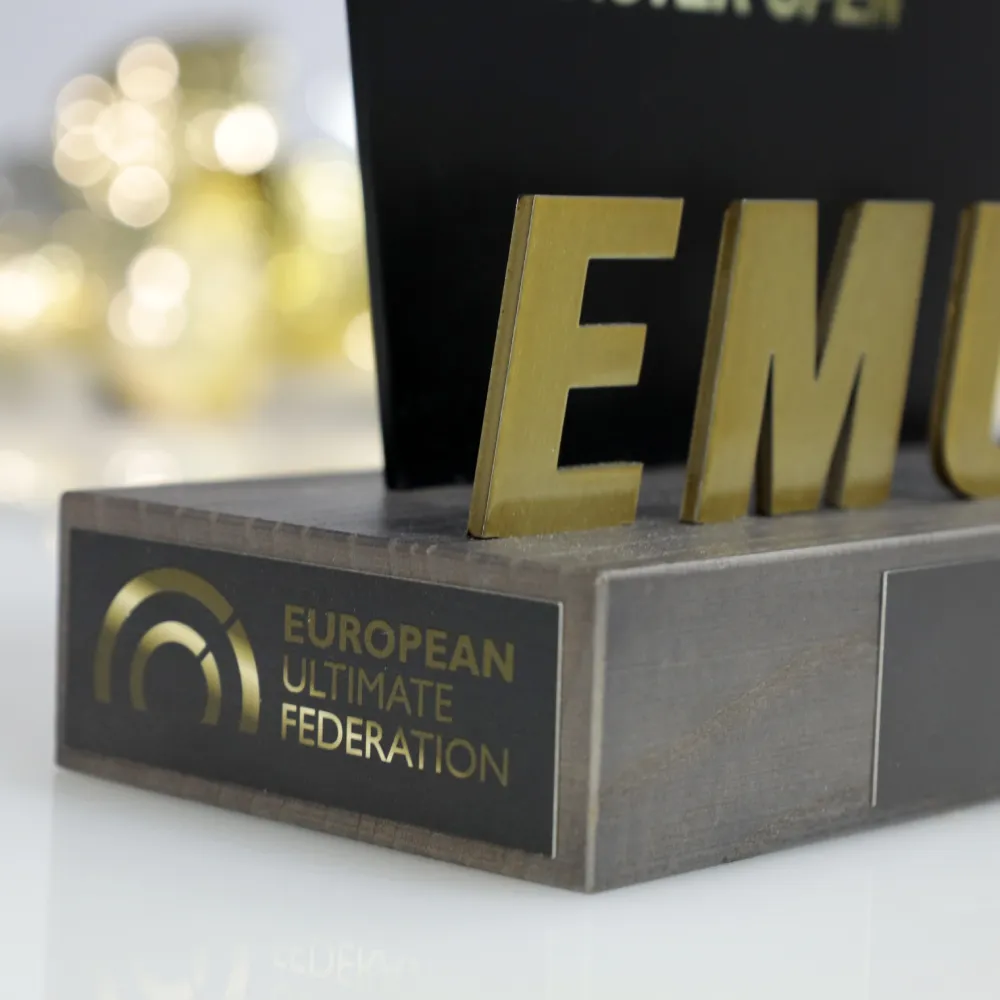 Il trofeo personalizzato creato per la European Ultimate Federation è un premio elegante realizzato con componenti in metallo, montato su una solida base in legno. Il trofeo ha una forma trapezoidale, che gli conferisce un aspetto dinamico e moderno. La superficie include spazio per iscrizioni, nonché un logo dell'evento tridimensionale ben visibile, che è stato tagliato con precisione al laser. Le decorazioni sono state applicate utilizzando la stampa UV.