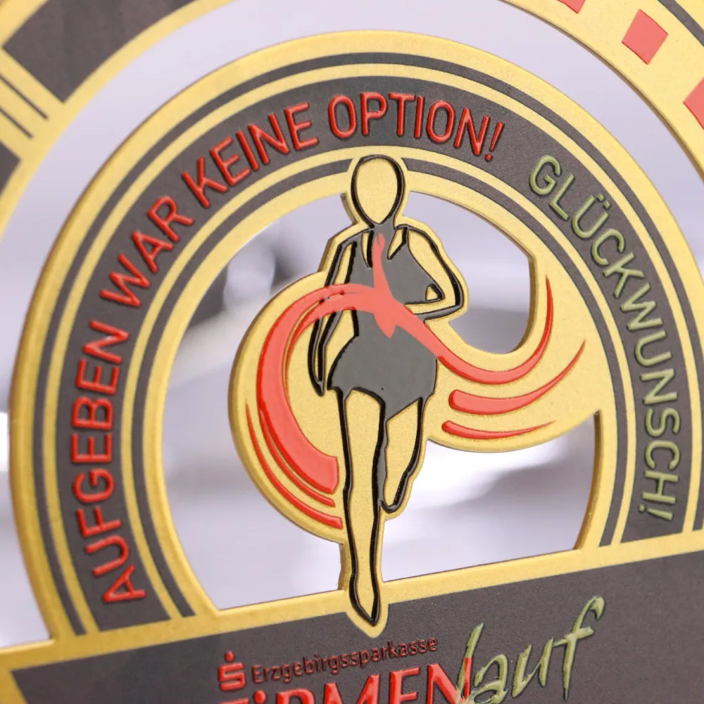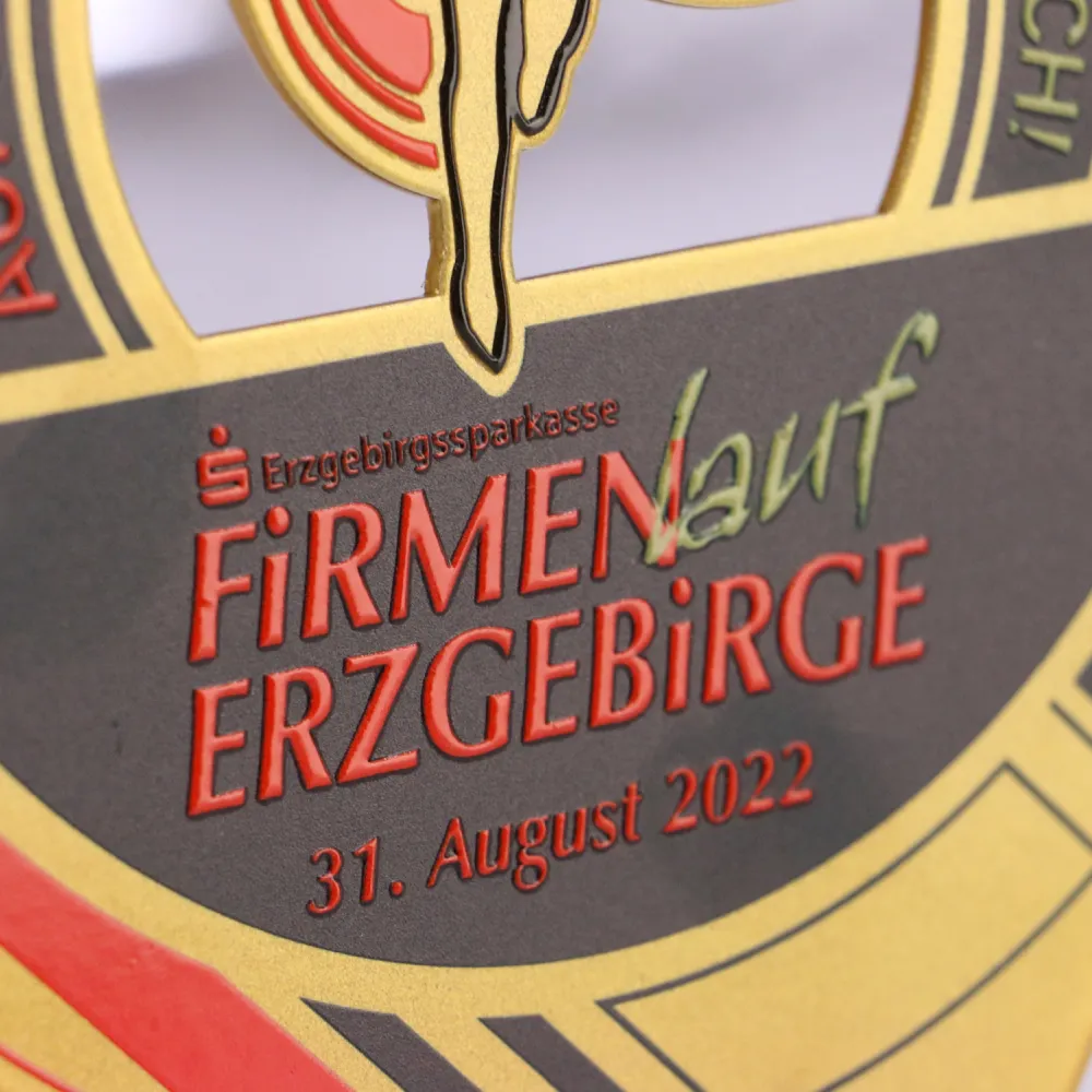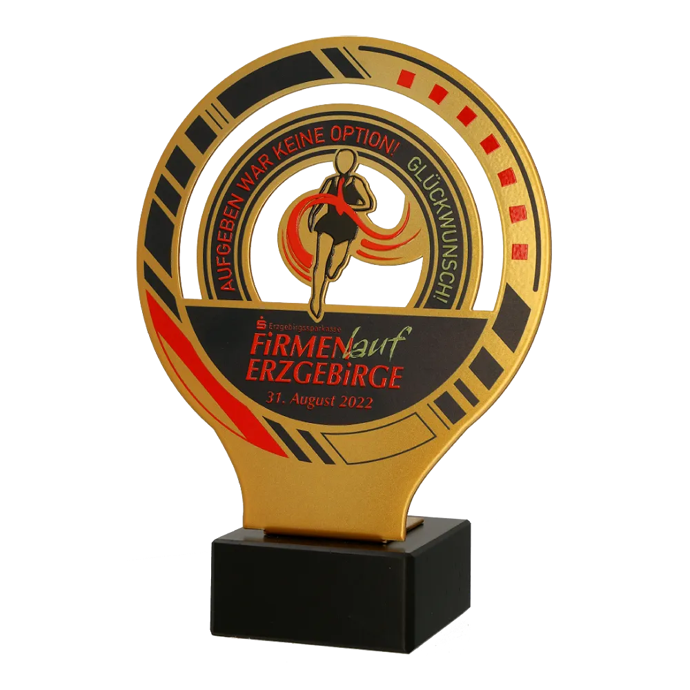 Il trofeo di corsa è stato appositamente progettato per l'evento Firmenlauf Erzgebirge. I colori oro e nero combinati con grafiche dinamiche dei corridori conferiscono al premio un aspetto moderno.