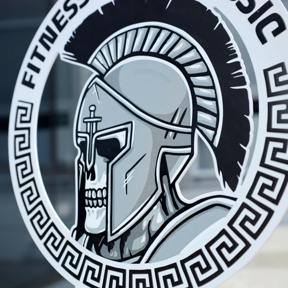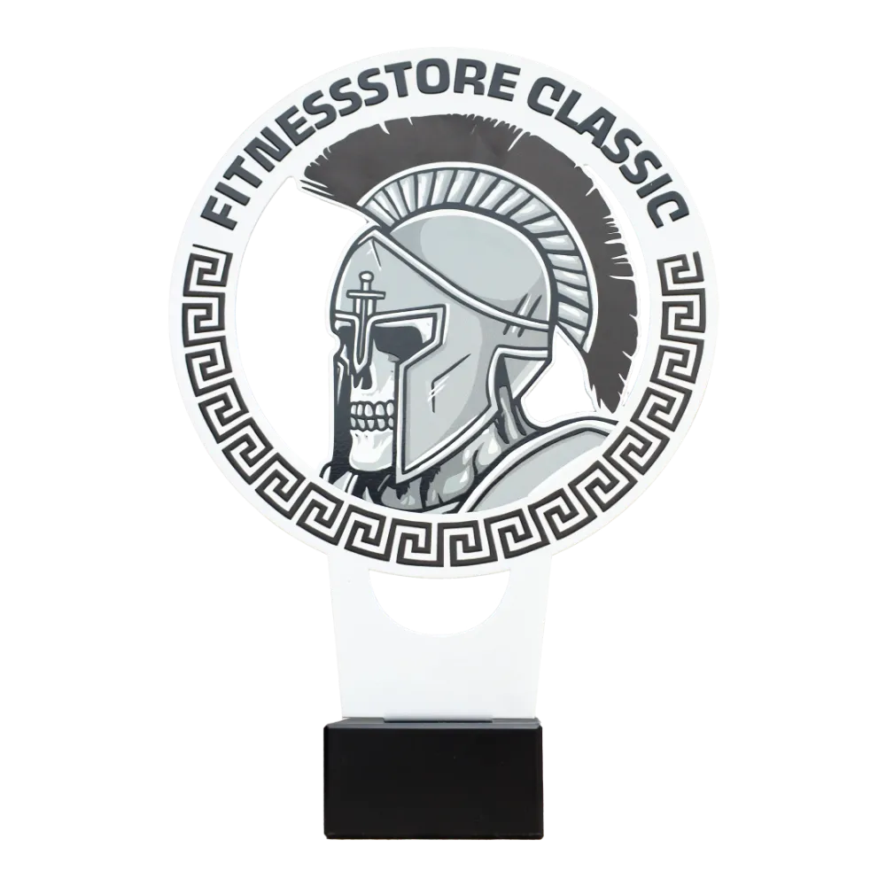 Un premio personalizzato che abbiamo progettato per Fitnessstore Classic. La parte anteriore presenta un cerchio con ornamenti greci e l'immagine dell'elmo di un guerriero, con il nome dell'evento che corre lungo l'arco; predominano il bianco e le sfumature di grigio. Il pezzo è realizzato in metallo e personalizzato con stampa UV a colori. Il tutto poggia su una base in marmo nero.