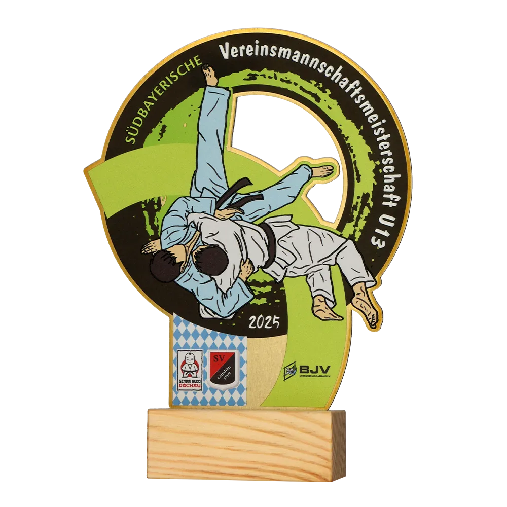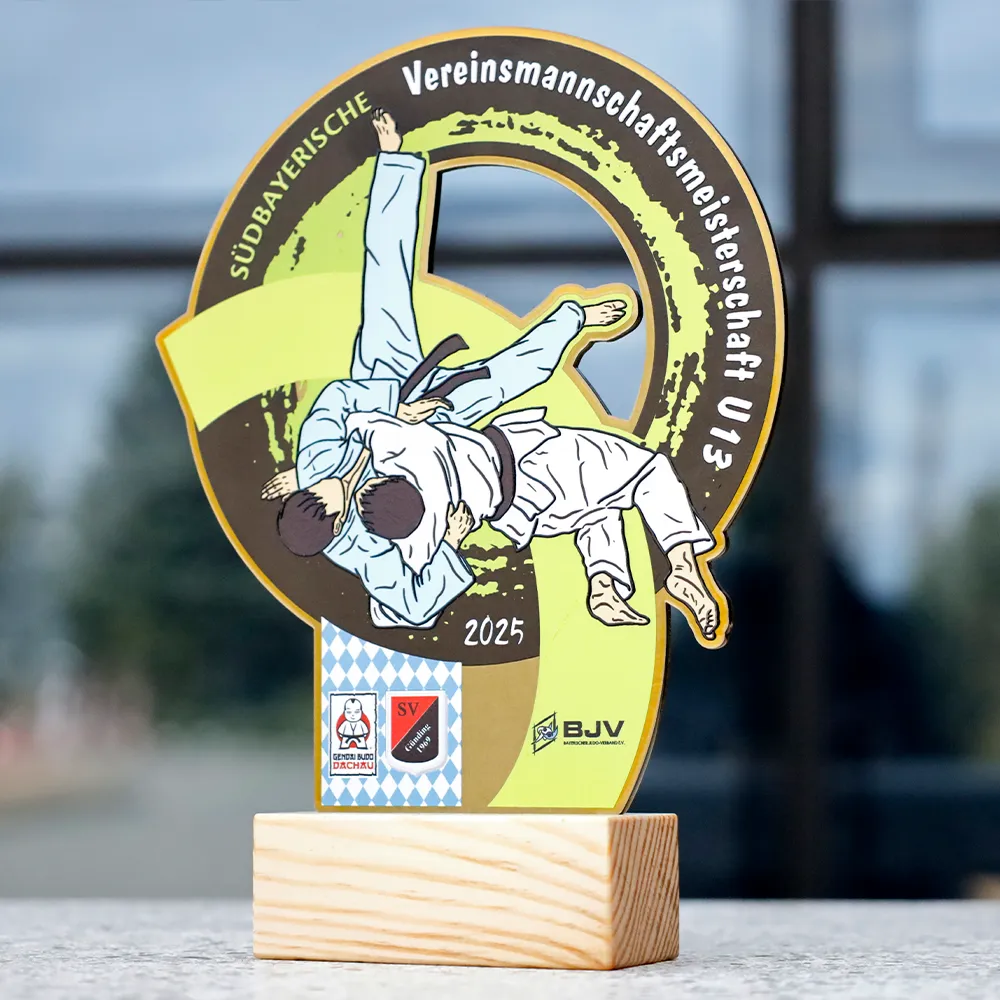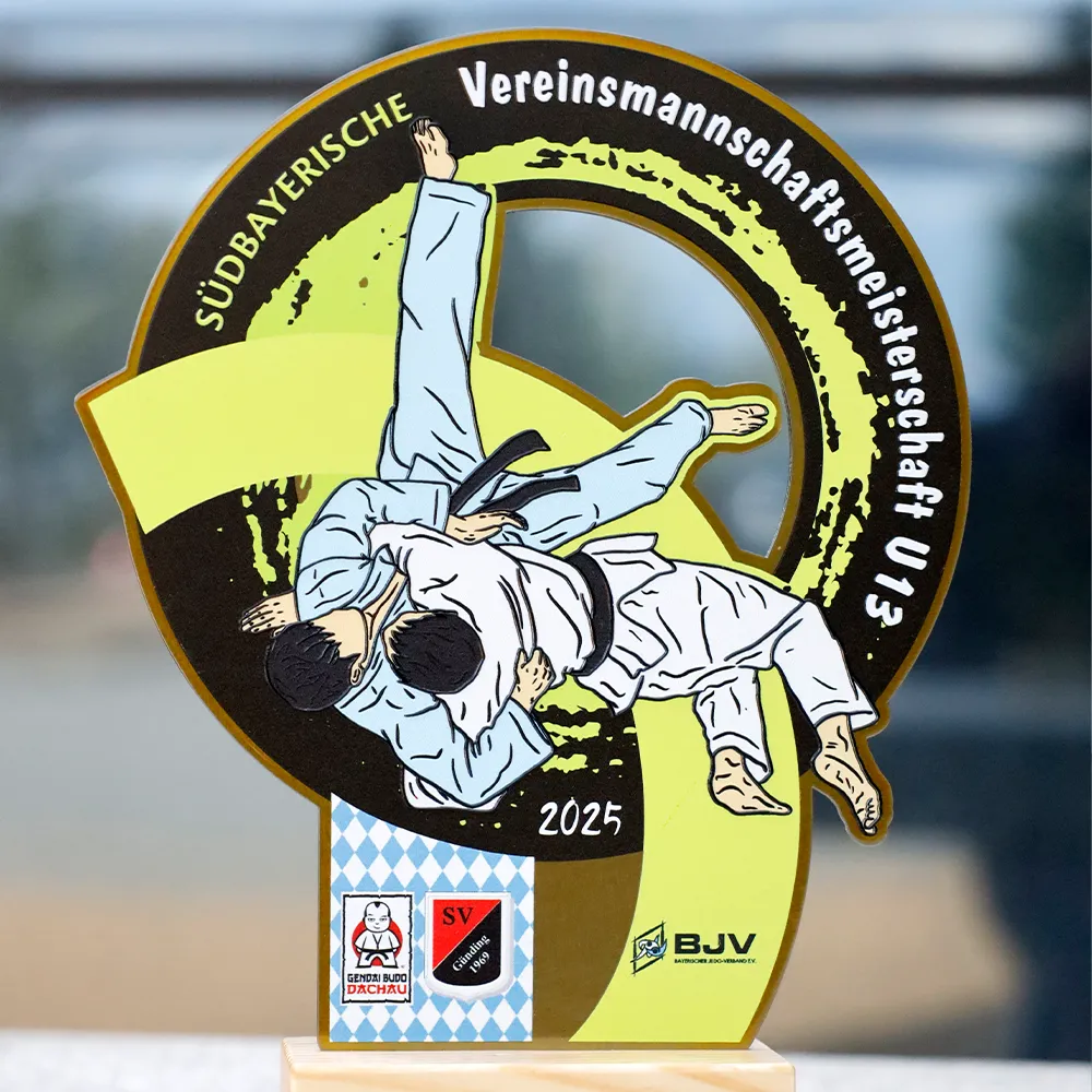Trofeo sportivo realizzato in metallo, montato su una base in legno. La forma è stata tagliata al laser e le decorazioni colorate sono state create con stampa UV. Il design dinamico mostra concorrenti di judo in azione, evidenziando il carattere sportivo del premio. Questo trofeo su misura è stato preparato per una competizione di judo.