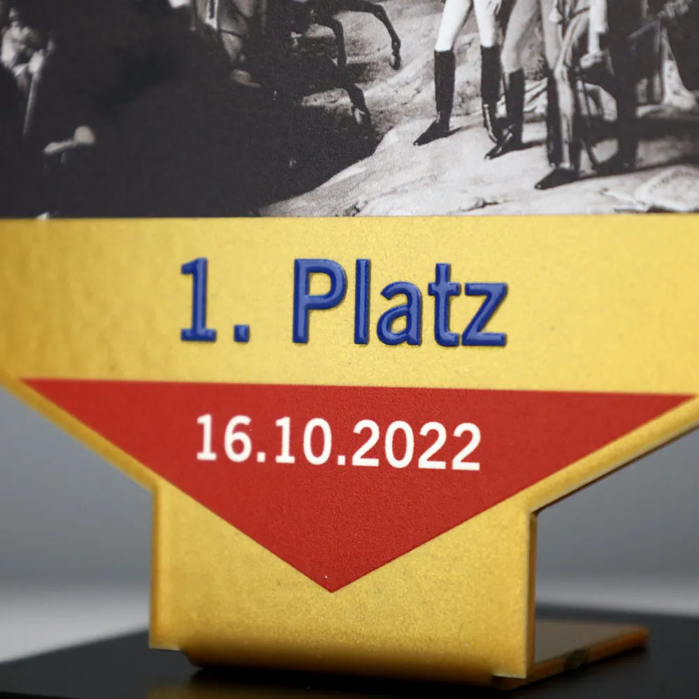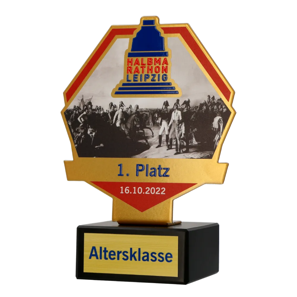 Il premio di corsa che abbiamo creato per il vincitore della Mezza Maratona di Lipsia è un pezzo in metallo dorato montato su una base in marmo nero. Il trofeo presenta una foto storica, il logo della gara e la data.