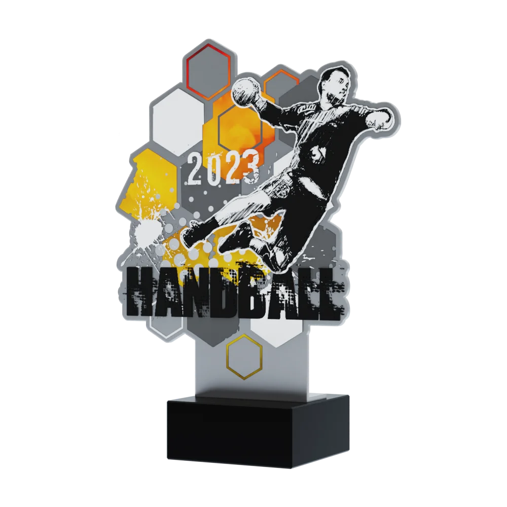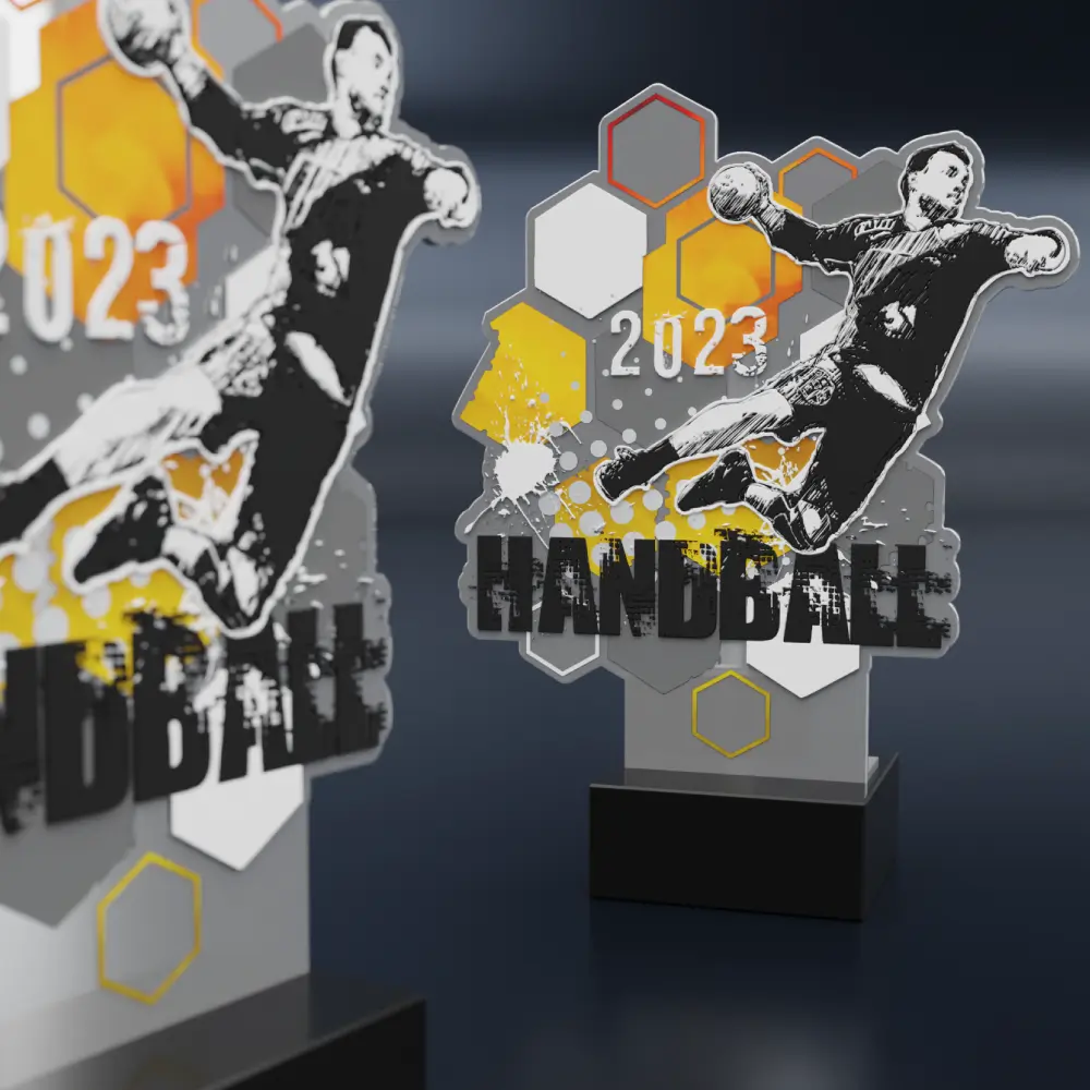 I nostri ultimi trofei in metallo sono eleganti premi per la Lega di Pallamano. Accuratamente realizzati in metallo e montati su una massiccia base in marmo, rappresentano solidità, ma anche eleganza e stile. I nostri trofei sono caratterizzati da una forma e un design unici che si distinguono dai trofei tipici. Inoltre, i premi sono ricoperti da una stampa colorata con un accento sportivo, aggiungendo un carattere vibrante e dinamico all’insieme. Al centro, c’è anche una grande grafica, che raffigura perfettamente un giocatore nell’atto di tirare in porta. Tutto ciò assicura che i premi porteranno sicuramente gioia ai giocatori premiati.